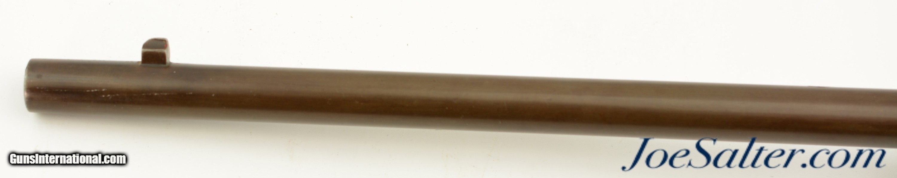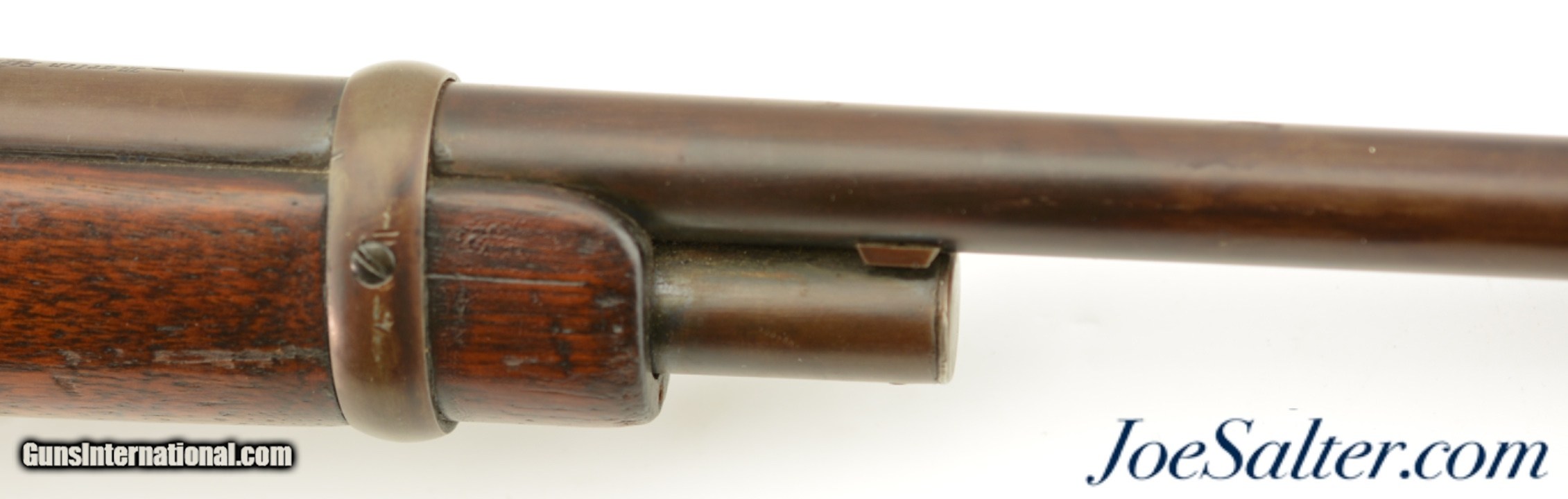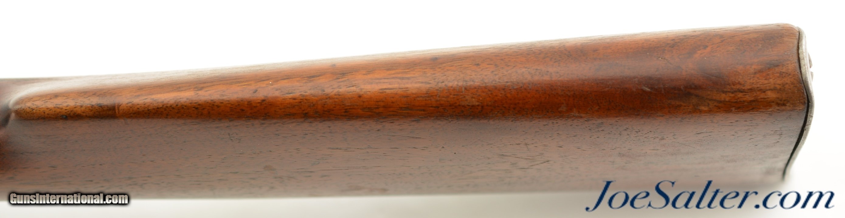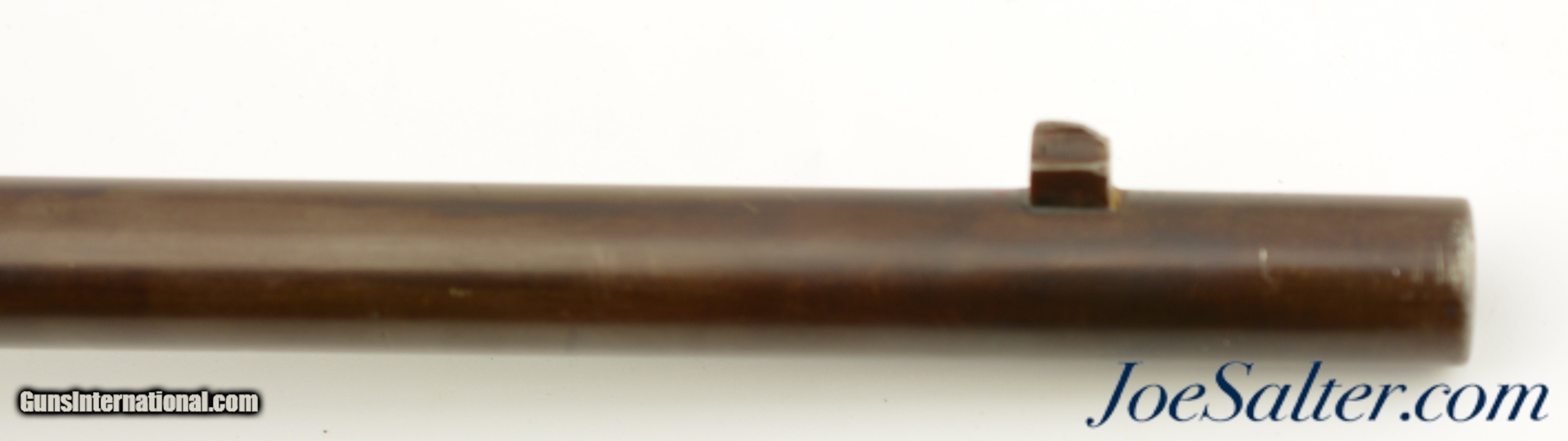 Description: Serial #362129, .38-55, 20 inch barrel marked "For Black Powder Only" with a bright, very good plus bore with strong rifling and some very light roughness in the grooves. This is a special order Sporting Marlin Model 1893 Saddle Ring Carbine with Half Magazine, Straight stock and an unmarked metal butt plate weighing in at 6 lbs 4 oz.. The gun is in very good condition with most of a later added finish remaining with the barrel and frame mostly mottled plum-brown toning to pewter at the natural carry point on the receiver and trace amounts of the original case color remaining on the concealed parts of the lever. The barrel is marked "Marlin Firearms Co., NEW-HAVEN CT. U.S.A." with 1887, 1889 and 1893 patent dates above the "For Black Powder" markings. The gun is equipped with the saddle ring and loop and is sighted with the correct flip up graduated rear sight and metal post front. The receiver and tang are drilled and tapped for the L.L. Hepburn receiver sight and tang sight (neither are present) evident from the "Marlin Safety" marking having been moved forward to accommodate the holes. The walnut stocks show trace amounts of a later added varnish with a repaired chip at the toe and two unplugged holes from sling swivels with the forearm having a small ½ inch shallow crack on the left side running with the grain extending from the frame, a small hole just behind the barrel band with overall light use marks and contusions. The length of pull is 13 ¼ inches to a metal butt plate. The gun functions well mechanically and is a really neat little carbine in a great caliber. FFL or C&R SOLD Curio/Relic: Yes |
