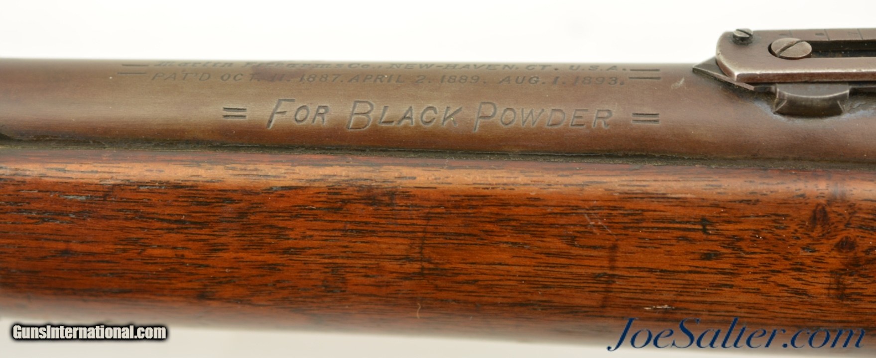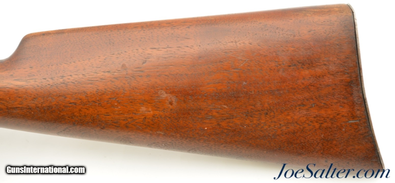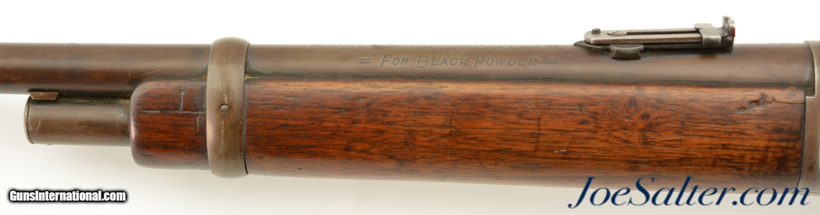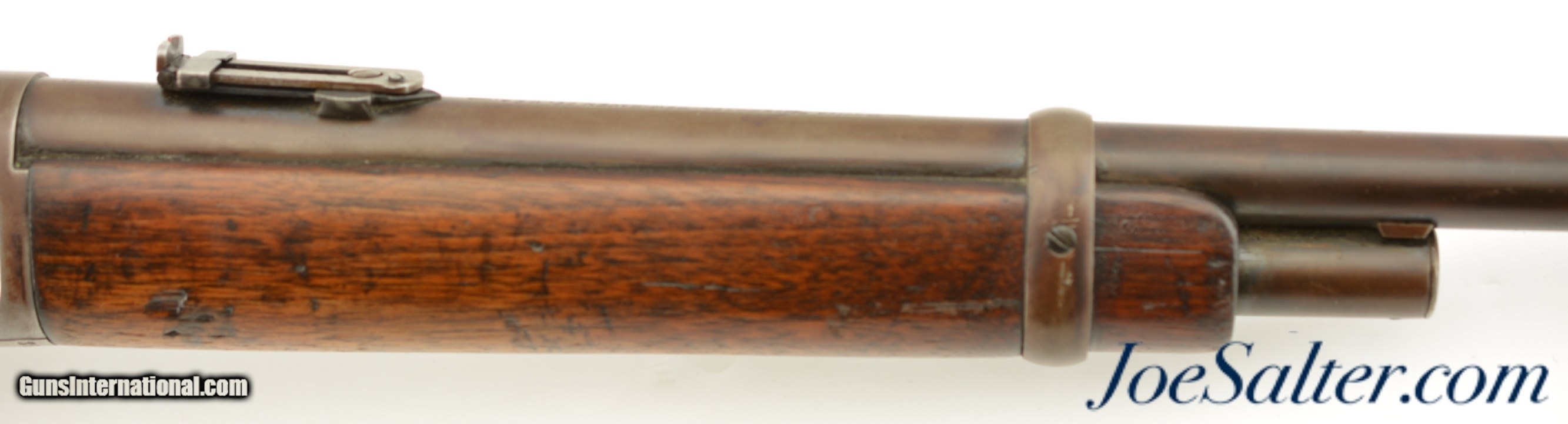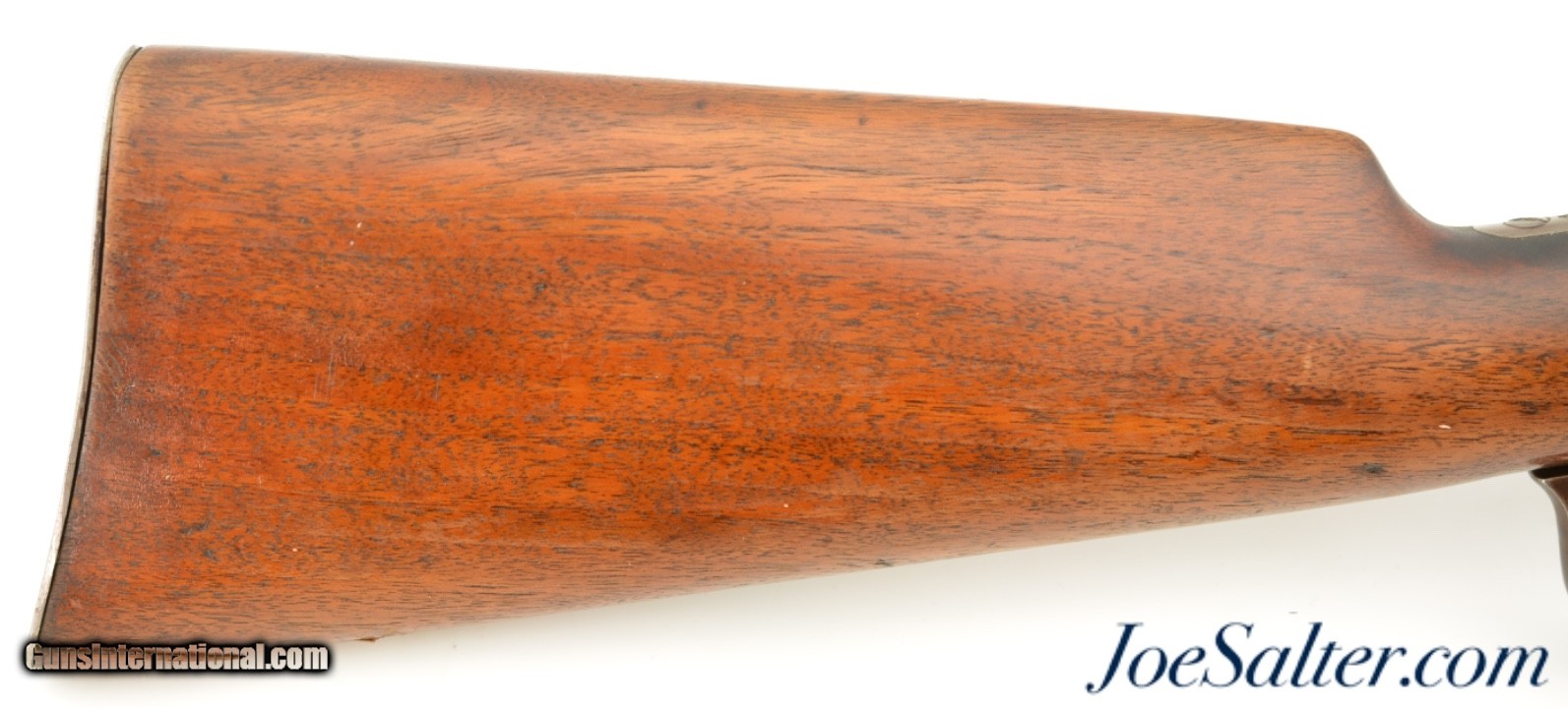 Description: Serial #362129, .38-55, 20 inch barrel marked "For Black Powder Only" with a bright, very good plus bore with strong rifling and some very light roughness in the grooves. This is a special order Sporting Marlin Model 1893 Saddle Ring Carbine with Half Magazine, Straight stock and an unmarked metal butt plate weighing in at 6 lbs 4 oz.. The gun is in very good condition with most of a later added finish remaining with the barrel and frame mostly mottled plum-brown toning to pewter at the natural carry point on the receiver and trace amounts of the original case color remaining on the concealed parts of the lever. The barrel is marked "Marlin Firearms Co., NEW-HAVEN CT. U.S.A." with 1887, 1889 and 1893 patent dates above the "For Black Powder" markings. The gun is equipped with the saddle ring and loop and is sighted with the correct flip up graduated rear sight and metal post front. The receiver and tang are drilled and tapped for the L.L. Hepburn receiver sight and tang sight (neither are present) evident from the "Marlin Safety" marking having been moved forward to accommodate the holes. The walnut stocks show trace amounts of a later added varnish with a repaired chip at the toe and two unplugged holes from sling swivels with the forearm having a small ½ inch shallow crack on the left side running with the grain extending from the frame, a small hole just behind the barrel band with overall light use marks and contusions. The length of pull is 13 ¼ inches to a metal butt plate. The gun functions well mechanically and is a really neat little carbine in a great caliber. FFL or C&R SOLD Curio/Relic: Yes |