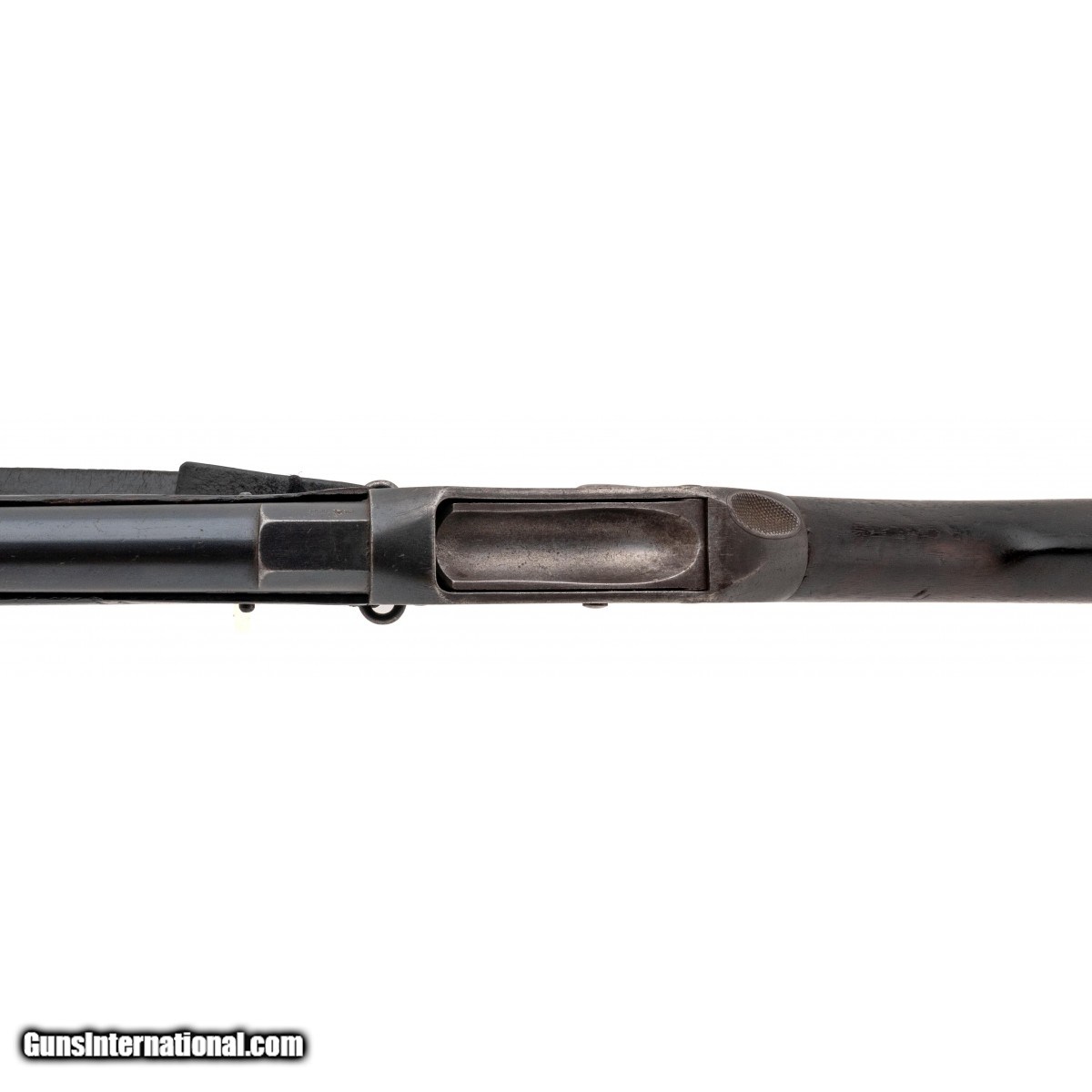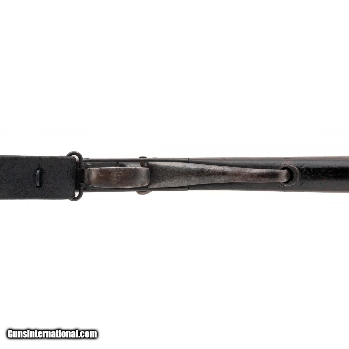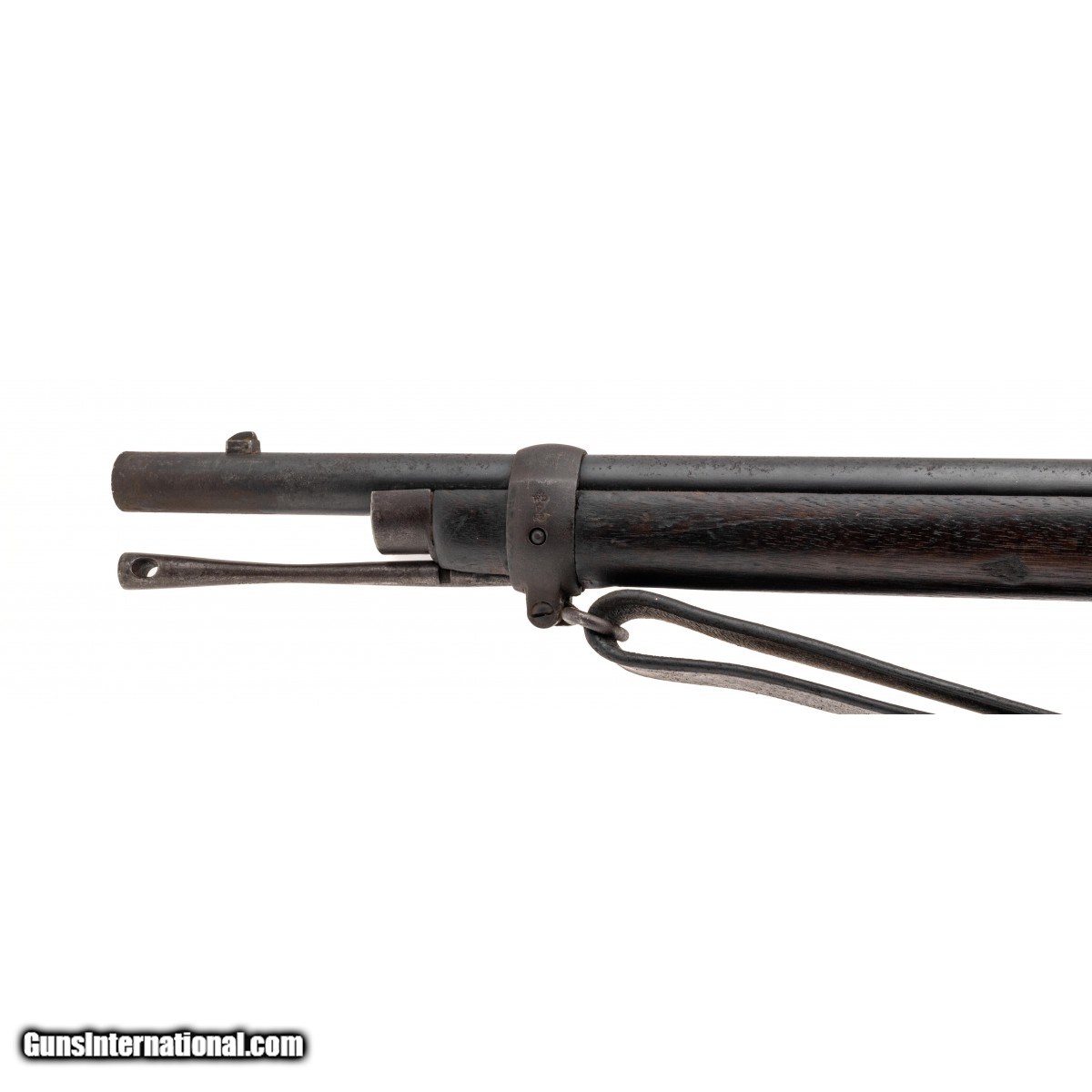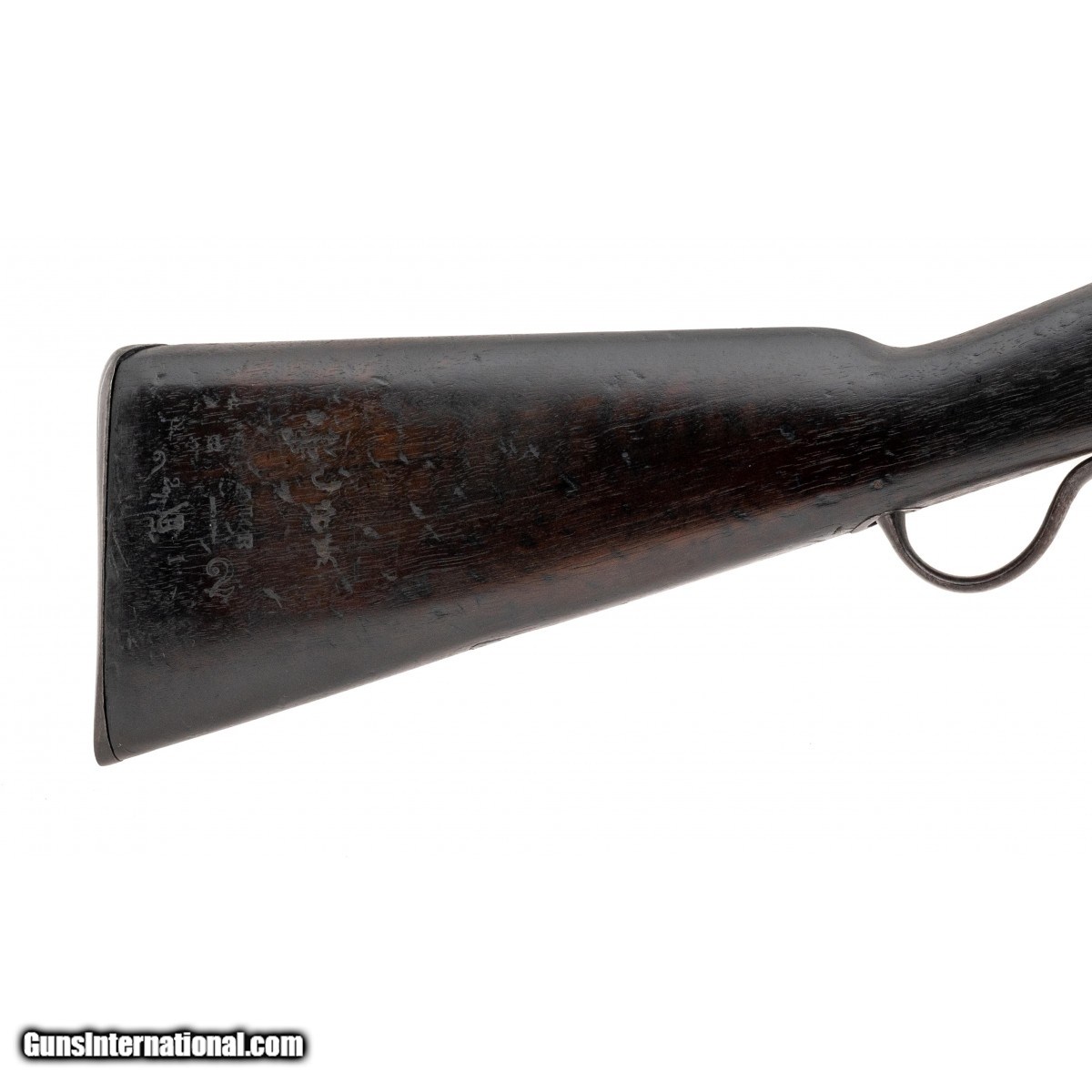 Description: " NSN, made 1877, .577/450, 33"" round proofed barrel. Metal is a dark brown patina, bore is good with light frosting visible in the strong rifling. Stock is dark with nicks, dings and scratches visible. A small crack is noted on the right side above the sling swivel. Action functions correctly, comes with sling. SOLD |