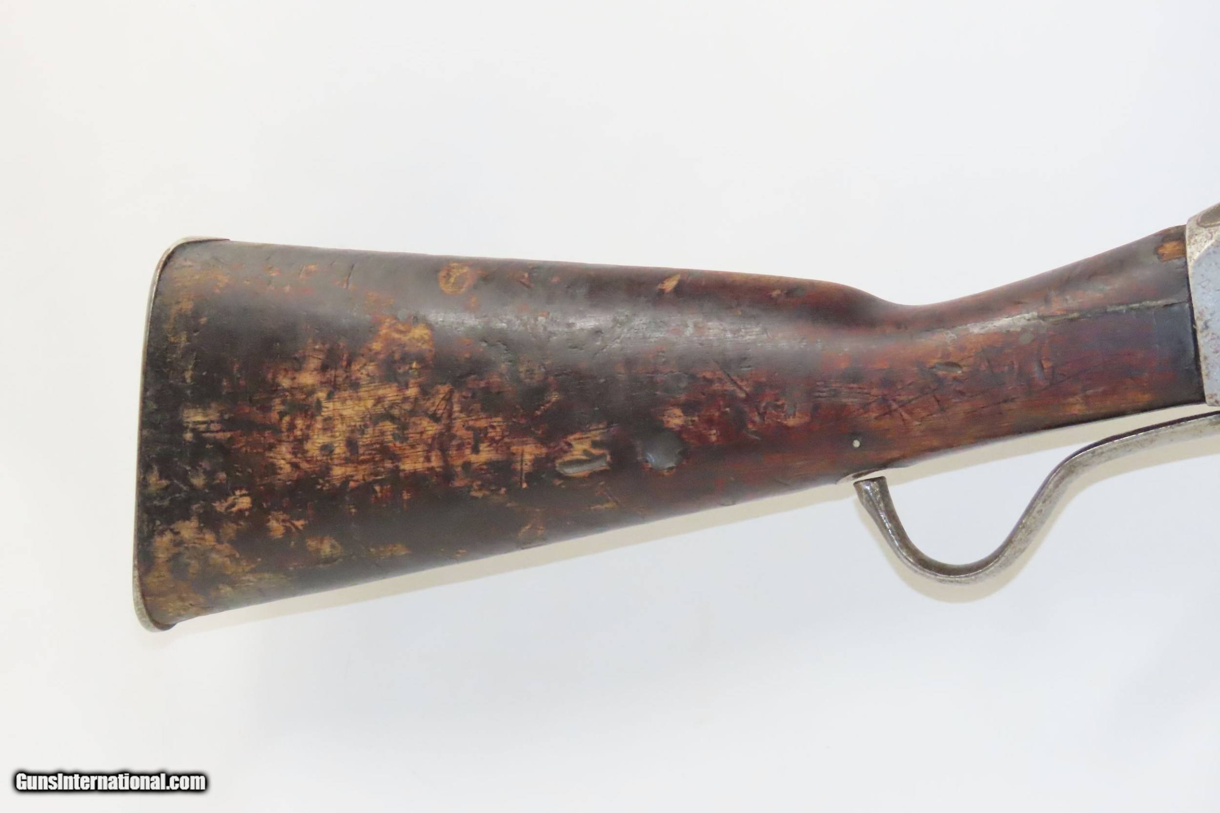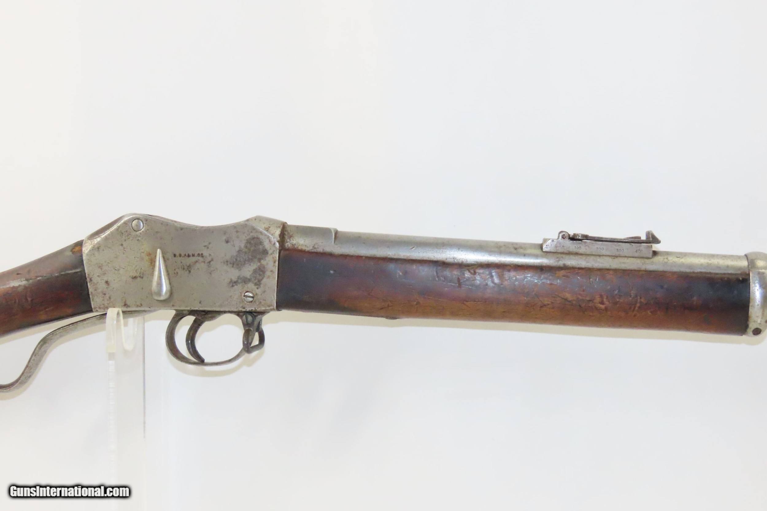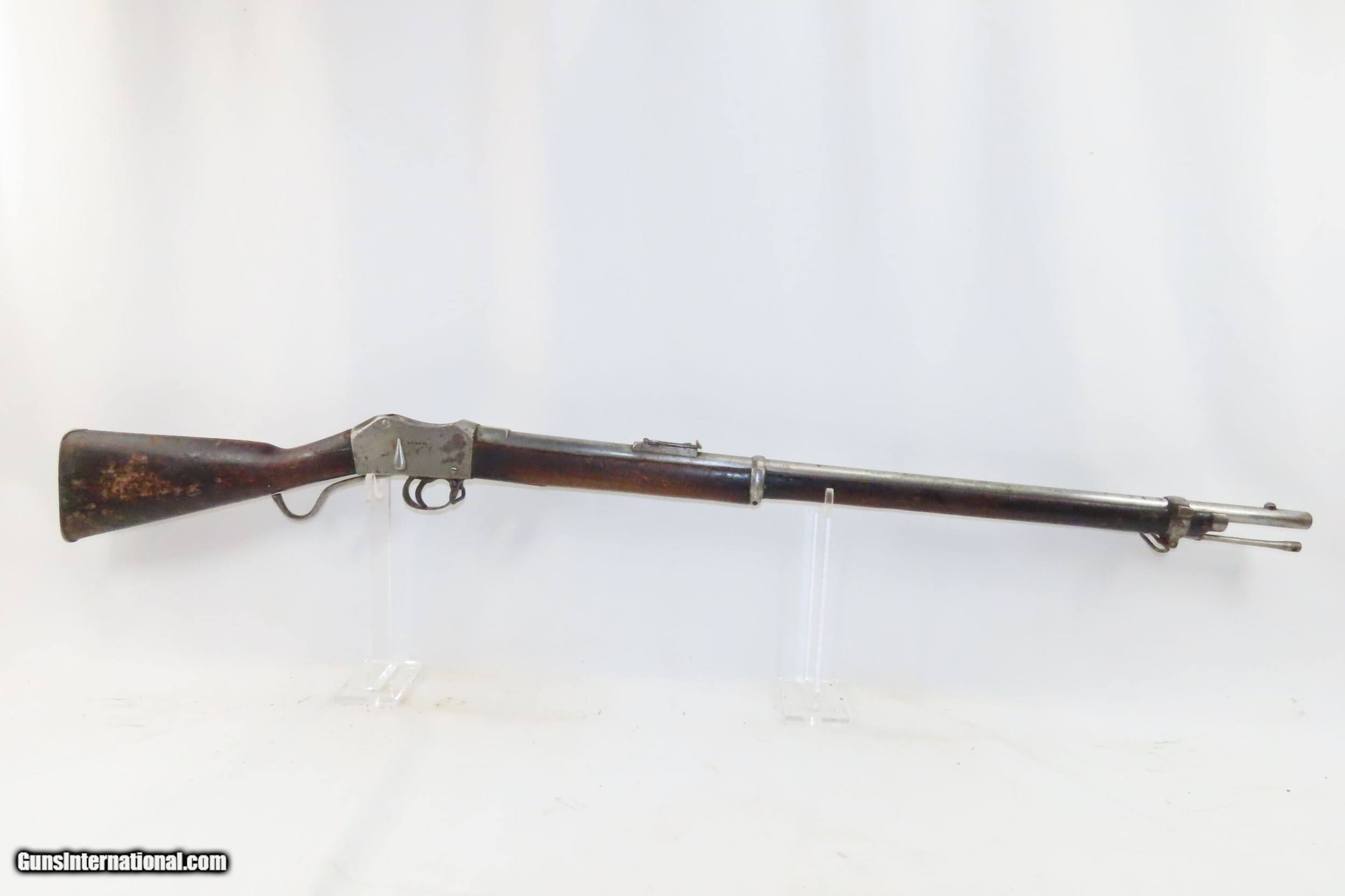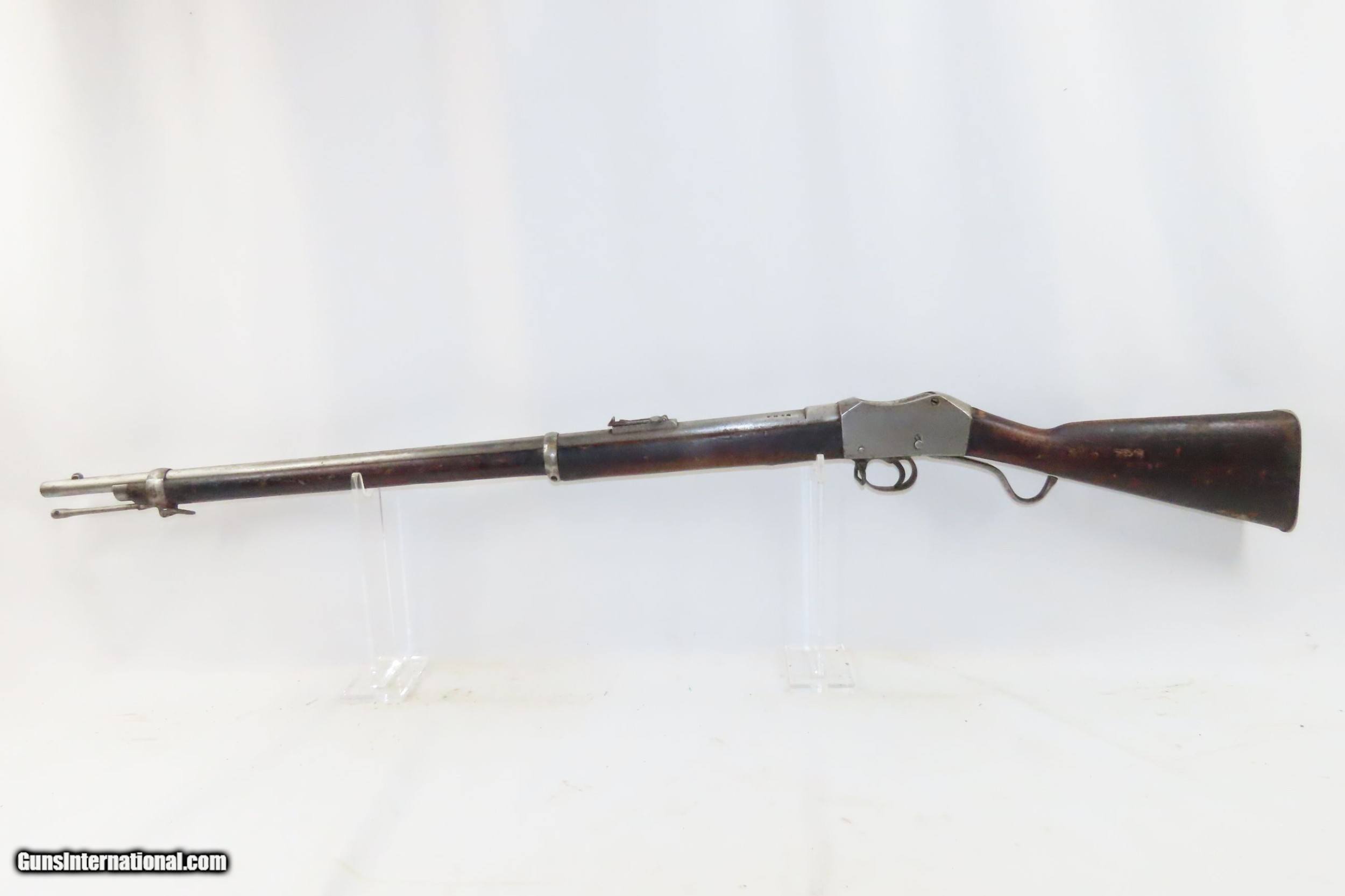 Description: Antique B.S.A. MARTINI-HENRY.577/450 Caliber FALLING BLOCK Rifle British Imperial Legacy MILITARY Rifle Here we present an antique B.S.A. Martini-Henry Single Shot Falling Block Military Rifle made circa 1885 at the Birmingham Small Arms Company in Birmingham, England, with a production run between 1871 and 1889. The Martini–Henry is a breech-loading single-shot lever action. The first iteration of the rifle came about in 1871 and was adopted by the British Army to replace the Enfield Snider Breech Loading Rifles that were being phased out. The action is based on the patent by American and Boston native Henry O. Peabody, which was improved by Swiss inventor Friedrich von Martini. The new polygonal barrel rifling was the design of Scotsman Alexander Henry. This is where the rifle derives its name. Martini–Henry variants were used throughout the British Empire for 47 years. Like other British weapons, the Peabody-Martini-Henry saw action all over the world, and most famously in the Zulu Wars in Africa. Production numbers for the Mark I through the Mark IV were somewhere between 500,000 and 1,000,000 produced. During this time, production of the Mark IIIs exceeded 95,000 with orders for the New South Wales Government totaling 6,500 examples and Canada 5,000. The overall condition is good. Fully functioning action. The bore is in very good shape for its age and remains clear. This example sports a solid stock with average wear, minor dents, and dings. Legible markings. Own the original! This is a legitimate antique and not a reproduction. Barrel is 33-1/4 inches. Caliber: .577/450 Overall condition as seen in photos. Very Fast. Very Safe. FREE SHIPPING WORLDWIDE. Delivered directly to your door by express mail! Guaranteed AUTHENTIC & Includes CERTIFICATE OF AUTHENTICITY. ancestryguns $1200 #226903 SOLD Antique: Yes |