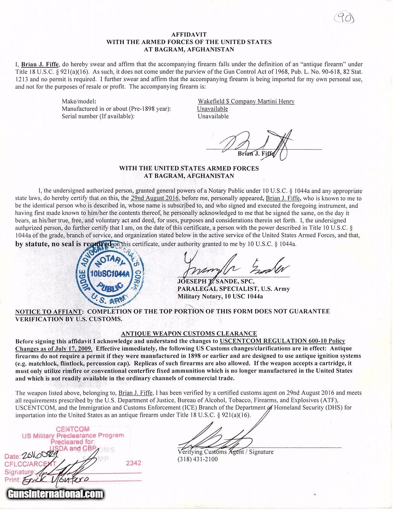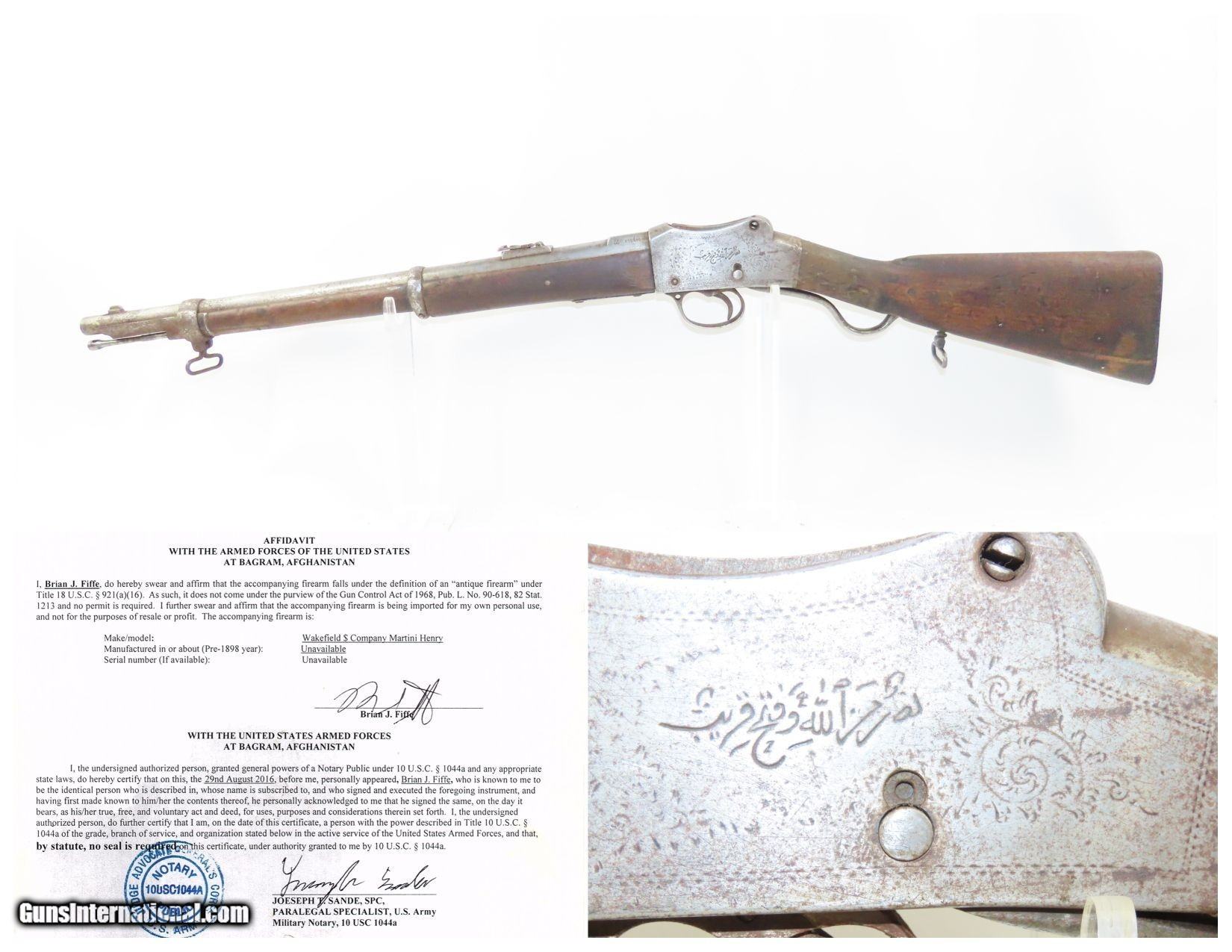 Description: Antique WAKEFIELD & Co. MARTINI-HENRY .577/450 Caliber FALLING BLOCK Rifle British Imperial Legacy MILITARY Rifle w/AFGHAN PAPER Here we present an antique Wakefield & Co. Marked Martini-Henry Single Shot Falling Block Military Rifle made circa 1885 with a production run between 1871 and 1889 with somewhere between 500,000 and 1,000,000 produced. This example is marked “WAKEFIELD & Co/ENGLISH MANUFACTURE” on the barrel. Included is a U.S. Armed Forced affidavit “Bring Back” paper from Bagram, Afghanistan dated August 29, 2016 list this gun by manufacturer. There is also Arabic writing marked on the receiver. The first iteration of the rifle came about in 1871 and was adopted by the British Army to replace the Enfield Snider Breech Loading Rifles that were being phased out. The action is based on the patent by American and Boston native Henry O. Peabody, which was improved by Swiss inventor Friedrich von Martini. The new polygonal barrel rifling was the design of Scotsman Alexander Henry. This is where the rifle derives its name. Martini–Henry variants were used throughout the British Empire for 47 years. Like other British weapons, the Peabody-Martini-Henry saw action all over the world, and most famously in the Zulu Wars in Africa. The overall condition is good. Strong action. The bore is in good shape for its age. Sturdy stock, contains expected wear from use/storage. Clear markings. Own the original! This is a legitimate antique and not a reproduction. Barrel is 21-3/4 inches. Caliber: .577/450 Centerfire Overall condition as seen in photos. Very Fast. Very Safe. FREE SHIPPING WORLDWIDE. Delivered directly to your door by express mail! Guaranteed AUTHENTIC & Includes CERTIFICATE OF AUTHENTICITY. ancestryguns $1200 #226904 SOLD Antique: Yes |