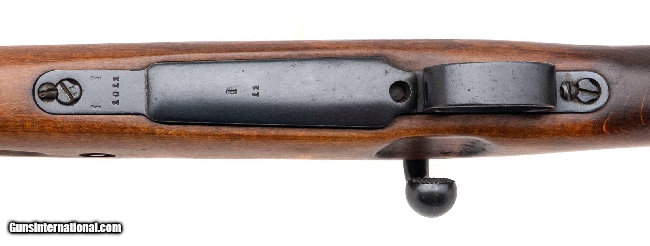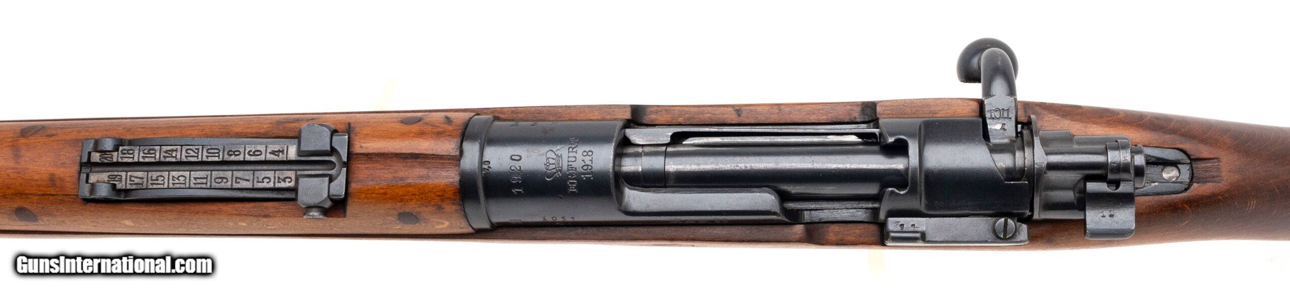 Description: "Serial No. 1011d, manufactured in 1918 by the Royal Prussian Arsenal at Erfurt, chambered in 7.92×57mm Mauser with a 23.75-inch round barrel. This example represents a late-war production Karabiner 98az, one of the final carbines manufactured for Imperial German forces before the Armistice. The double-date receiver, marked “1918 / 1920" indicates that the rifle remained in official German military service following World War I, as required under the Treaty of Versailles, which permitted a limited rearmed Reichswehr to retain designated small arms for police and military use. All serial numbers are matching throughout, including the screws. Metal finish retains a high percentage of the original factory blue, showing light wear and scattered brown patina from service use. Factory markings and Imperial proofs remain sharp and legible on the receiver and barrel shank. The gun is a Polish re-work that went through the Spanish Civil War & because of that the walnut replacement stock is marked with the letter ""A"" which indicates its use by urban anarcho-syndicalist forces during the conflict. Curio/Relic: Yes Price: $2,050.00 Contact Seller |