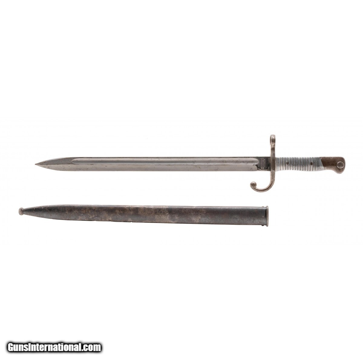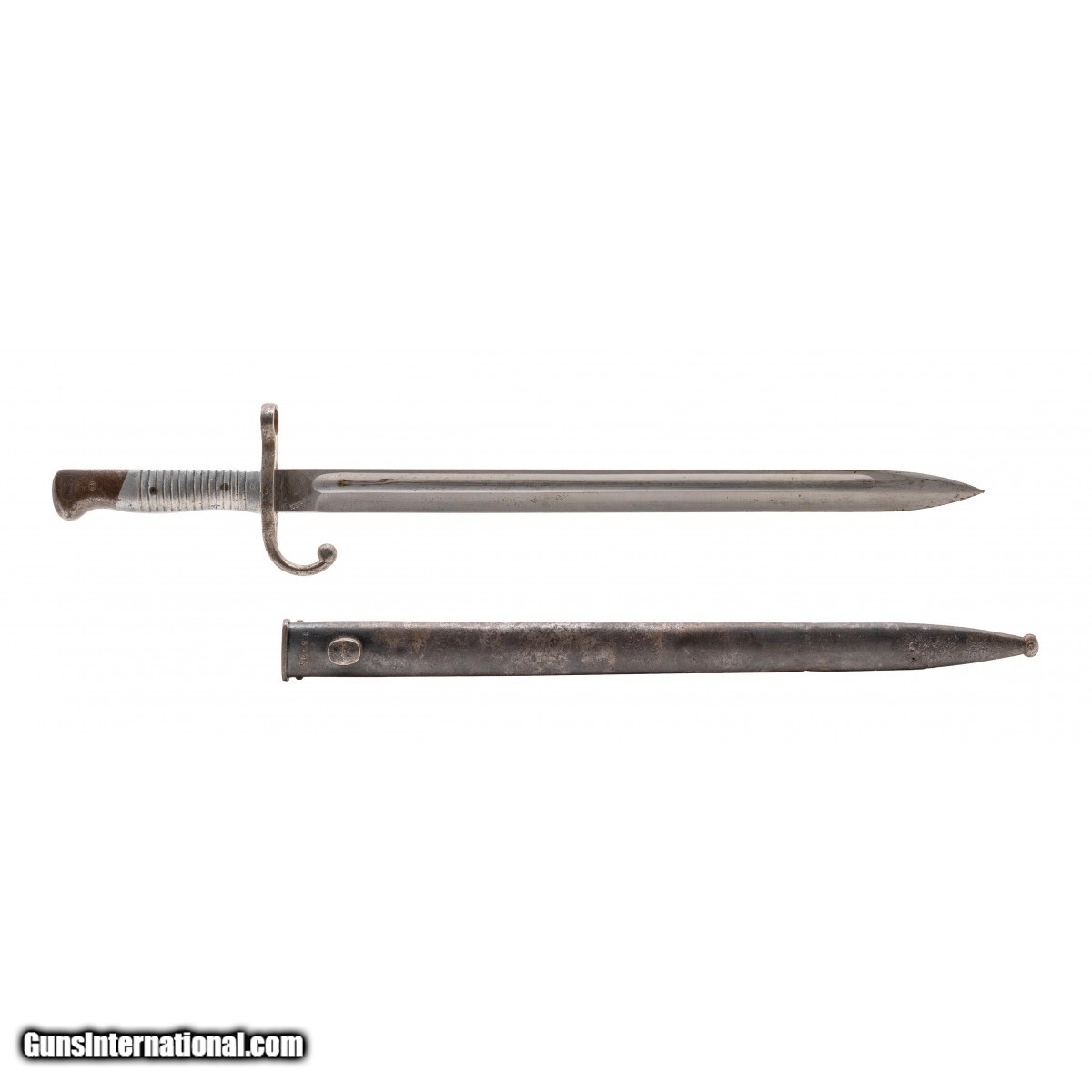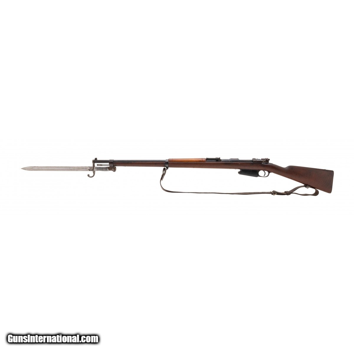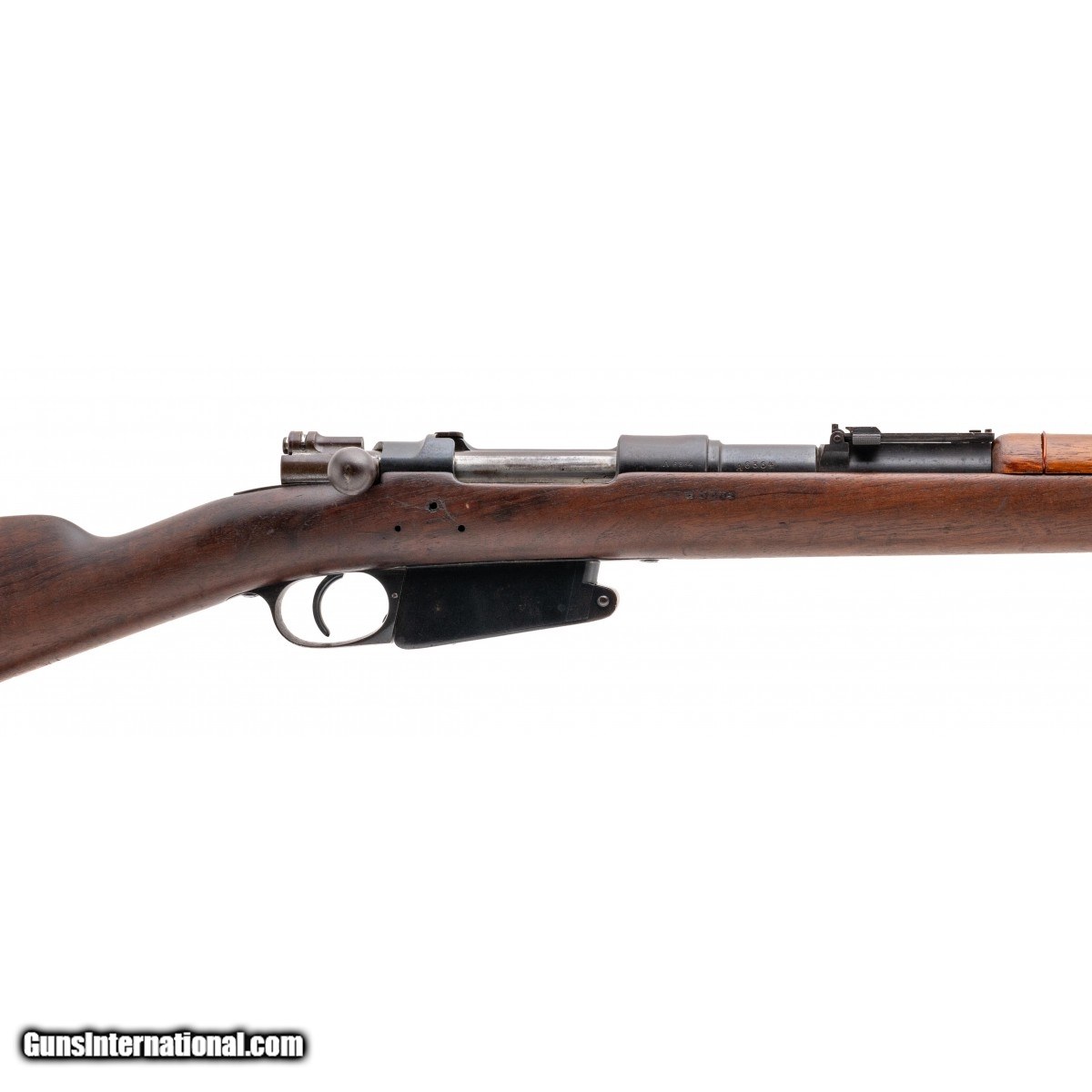 Description: " Serial No. A6364, circa 1891, 7.65x53, 29.5"" round barrel. Serial numbers are matching, bore is good with light frosting visible in the grooves. Rifling remains strong. Stock has 3 holes right side above the magazine, upper forearm has been replaced. Light wear is noted. Action functions correctly, comes original bayonet with a 15.75"" length blade. Consignment SOLD Antique: Yes |