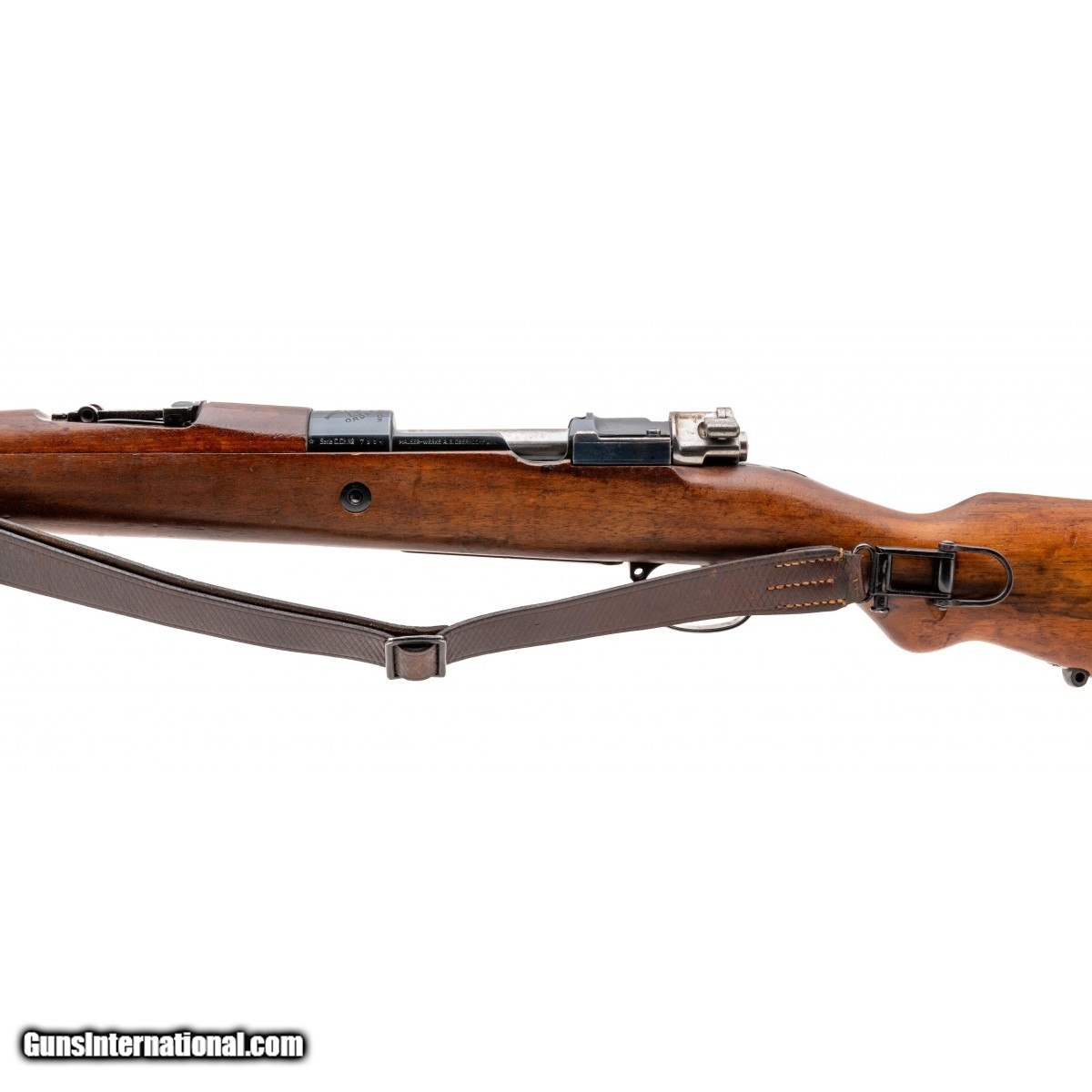SN: 7994. Made circa late 1930's. 7mm Mauser with a 22.25"". Bore is shiny with strong rifling. Mauser made Chilean military rifle. Blue finish is in very good condition with areas starting to thin around the barrel. Mauser banner is present on the rear receiver bridge. Stock is in very good condition, stock has handsome cartouche of the Chilean coat of arms on the left side of the butt stock. Action functions properly. Comes with sling, overall very good condition. Consignment