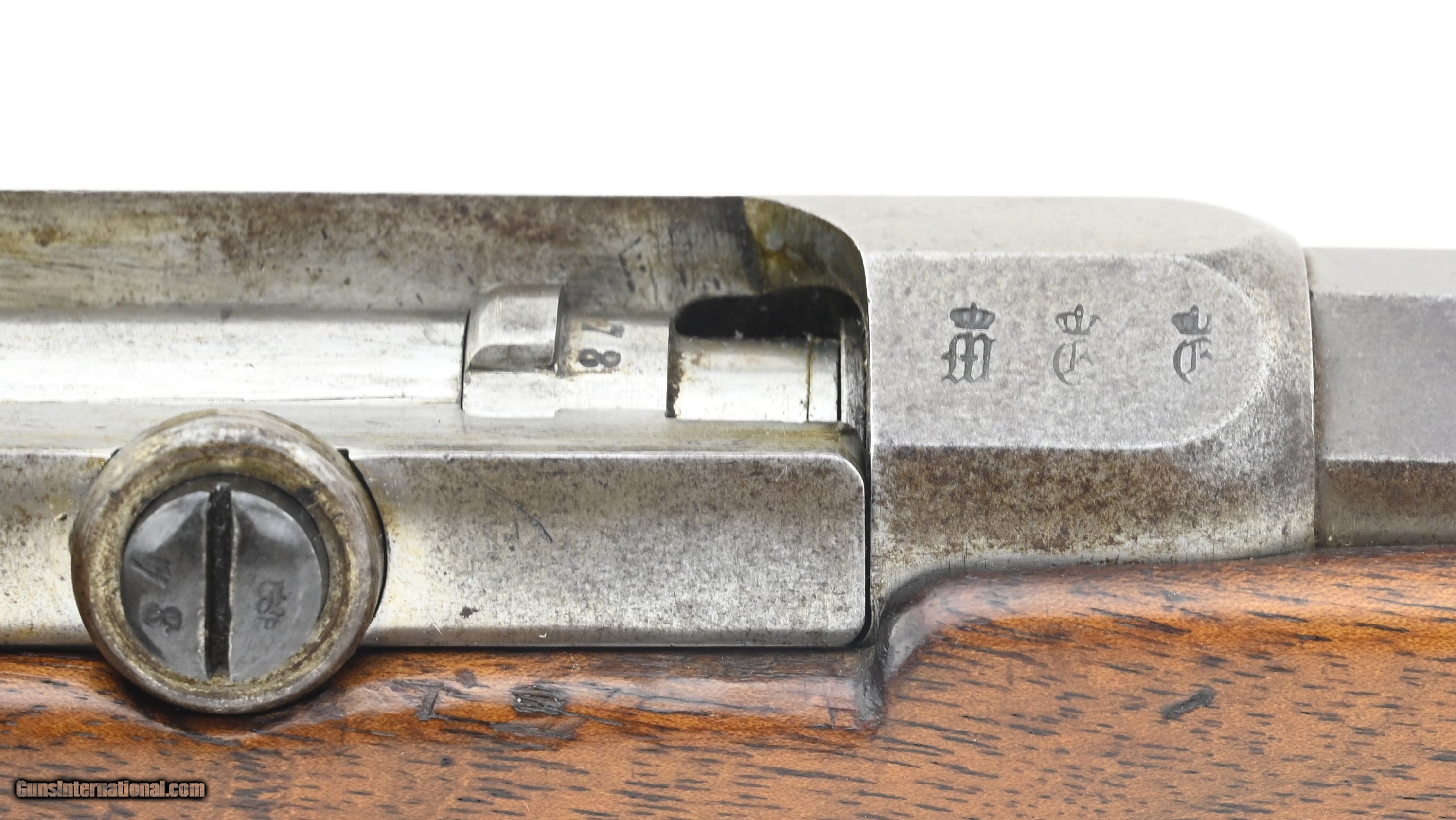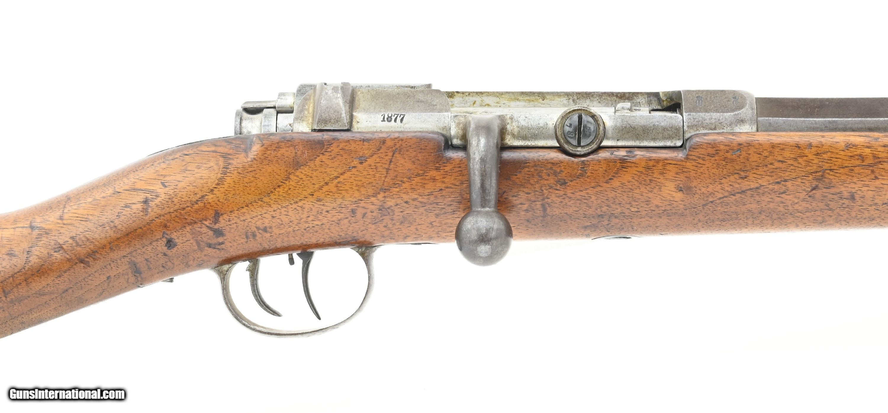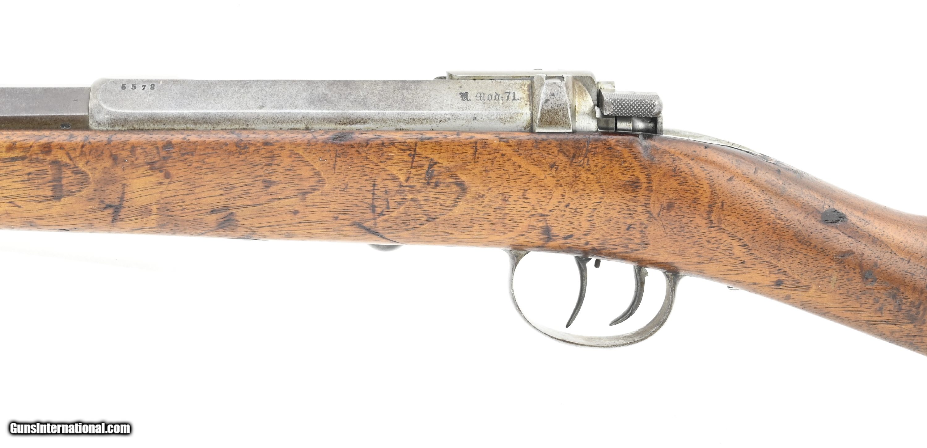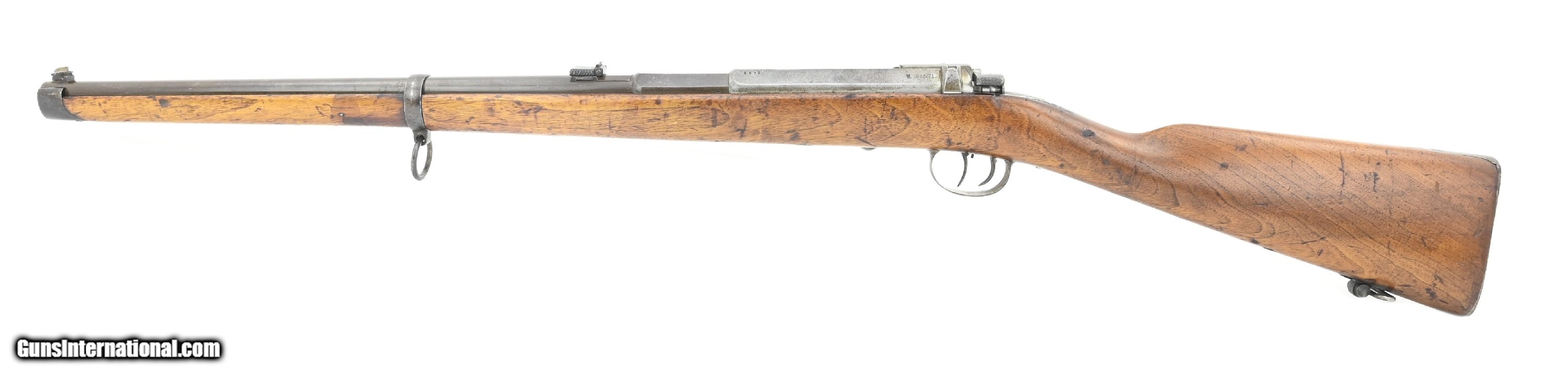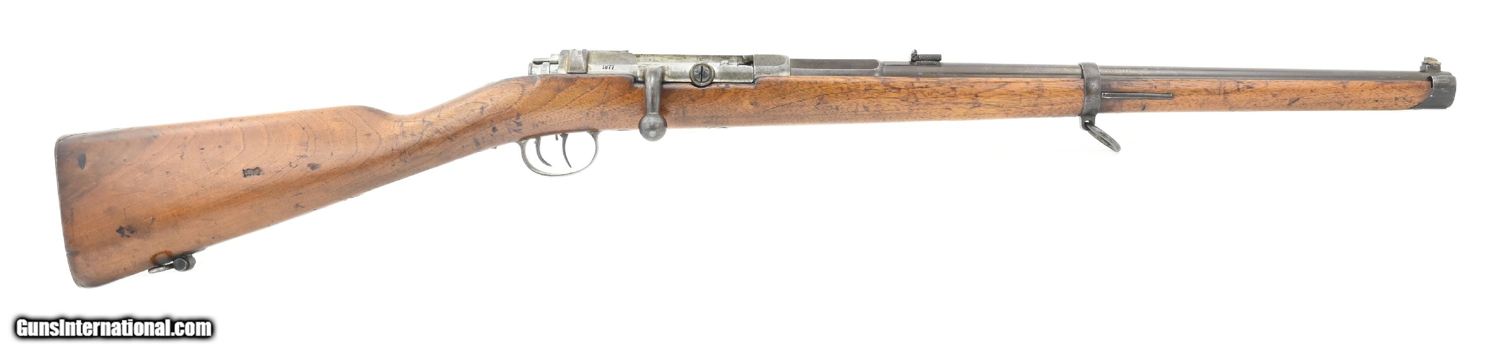 Description: "German Model 1871 carbine converted to 4mm Rimfire. Converted for indoor use. The carbine was originally an 11mm Mauser German calvary carbine. It was later converted to 4mm indoor/ parlor rifle. The conversion consists of: approximately 8" 4mm barrel insert with an extractor, new front and rear sights, bolt modification for Rimfire cartridge, addition of an adjustable double set trigger. The overall length is approximately 40". Barrel is 20". Metal has a smooth gray/brown patina. Stock is very good with multiple inspection stamps and no crack or chips. Serial number is “6578" and matching. Receiver is dated “1877". Action functions correctly. Here’s your chance to own a very unusual Model 1871 carbine. This would be an incredibly interesting gun for any Model 71 collection! Antique: Yes Price: $1,975.00 Contact Seller |