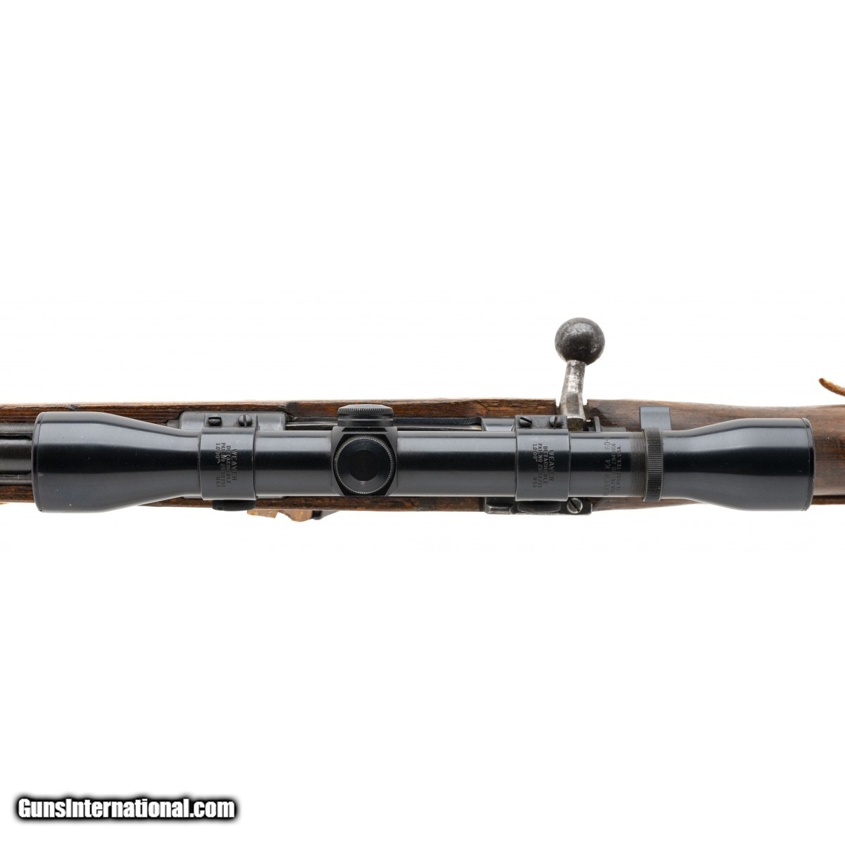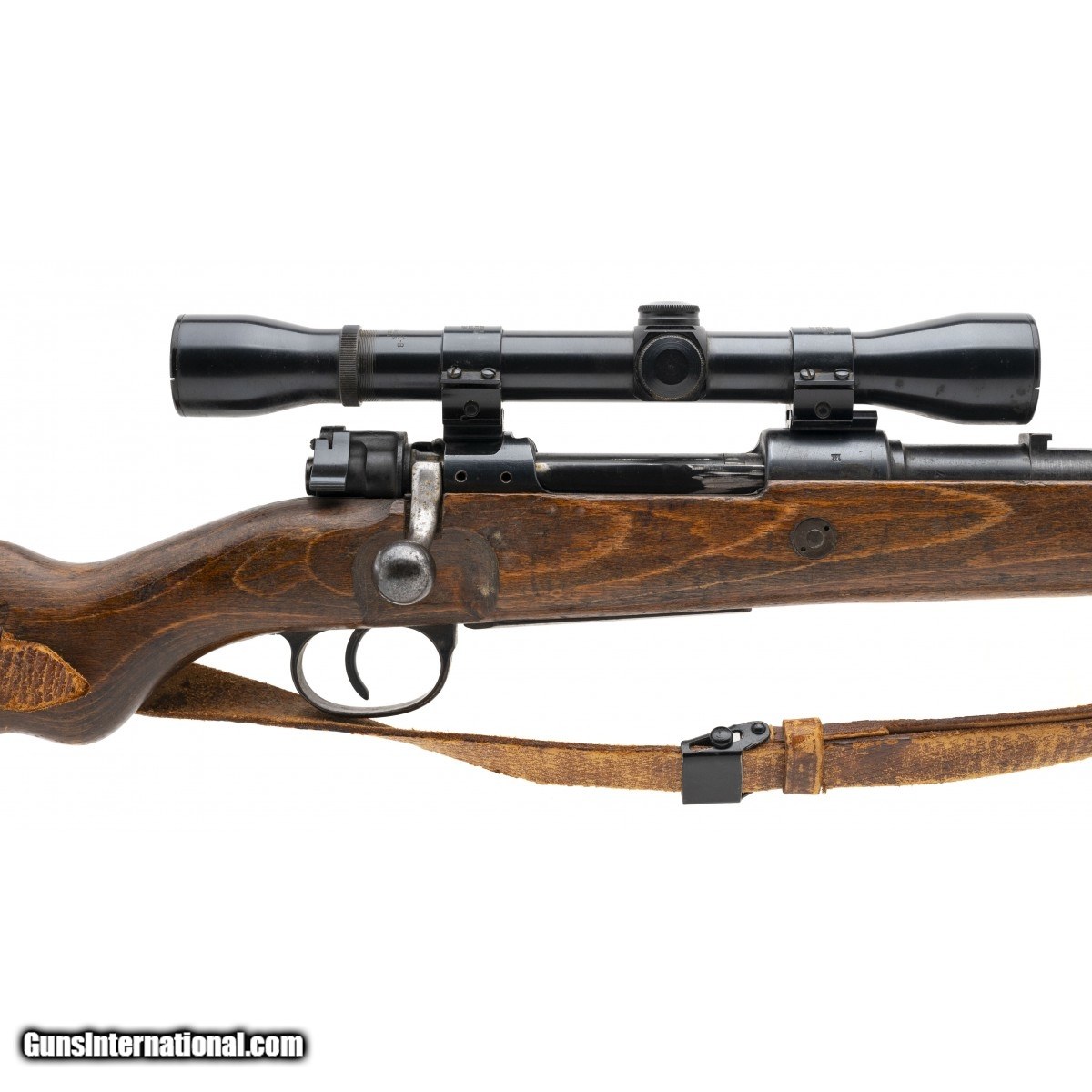 Description: " SN: 39705. WWII production 8mm Mauser with a 24"" barrel. Bore is excellent. German military WWII rifle. The receiver has been drilled and tapped, the bolt handle altered, and a Weaver K4 scope mounted. The rear sight has been removed and a muzzle device of some sort has been added. A very unusual configuration, in very good condition. Very good condition. (Consignment) SOLD Curio/Relic: Yes |