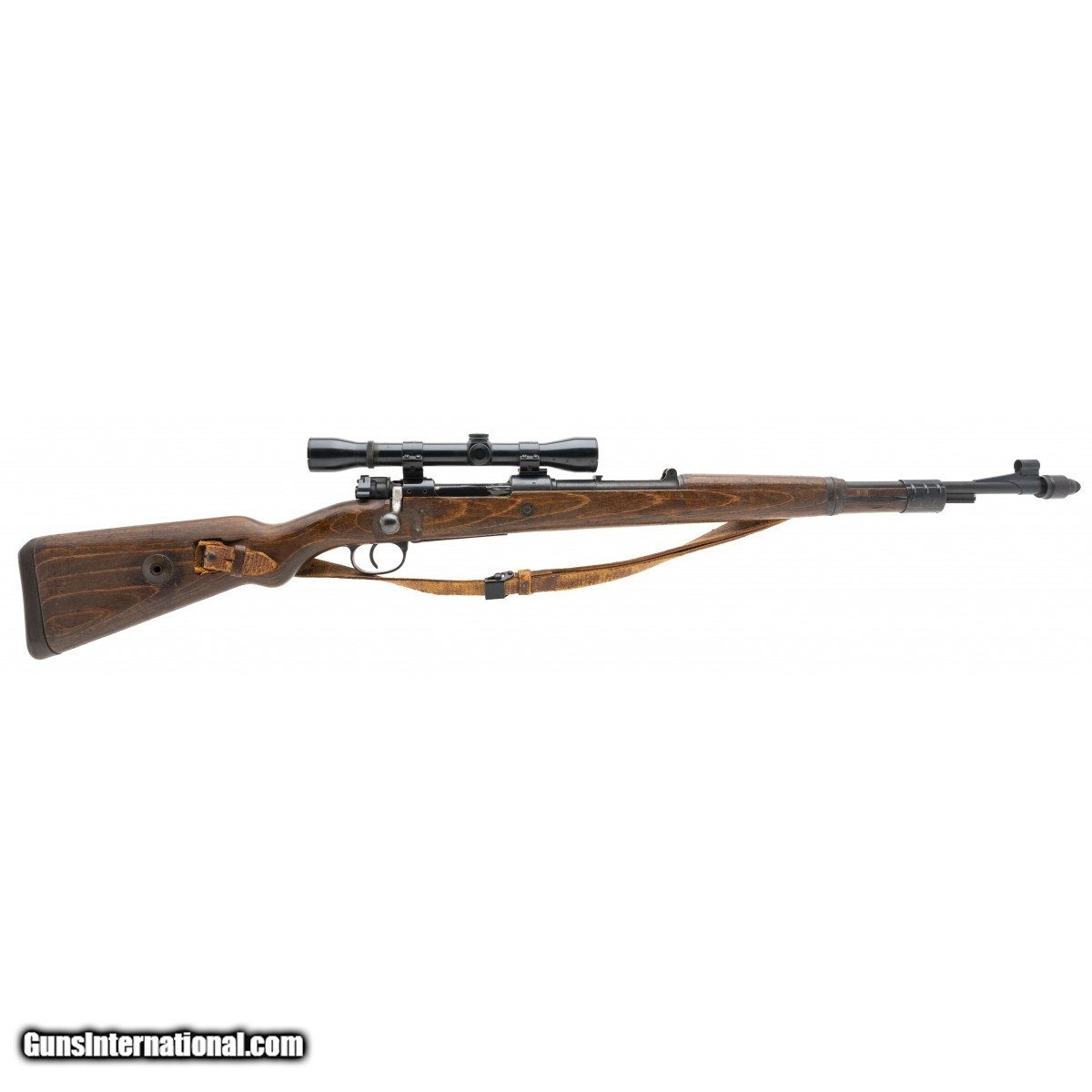 SN: 39705. WWII production 8mm Mauser with a 24"" barrel. Bore is excellent. German military WWII rifle. The receiver has been drilled and tapped, the bolt handle altered, and a Weaver K4 scope mounted. The rear sight has been removed and a muzzle device of some sort has been added. A very unusual configuration, in very good condition. Very good condition. (Consignment)