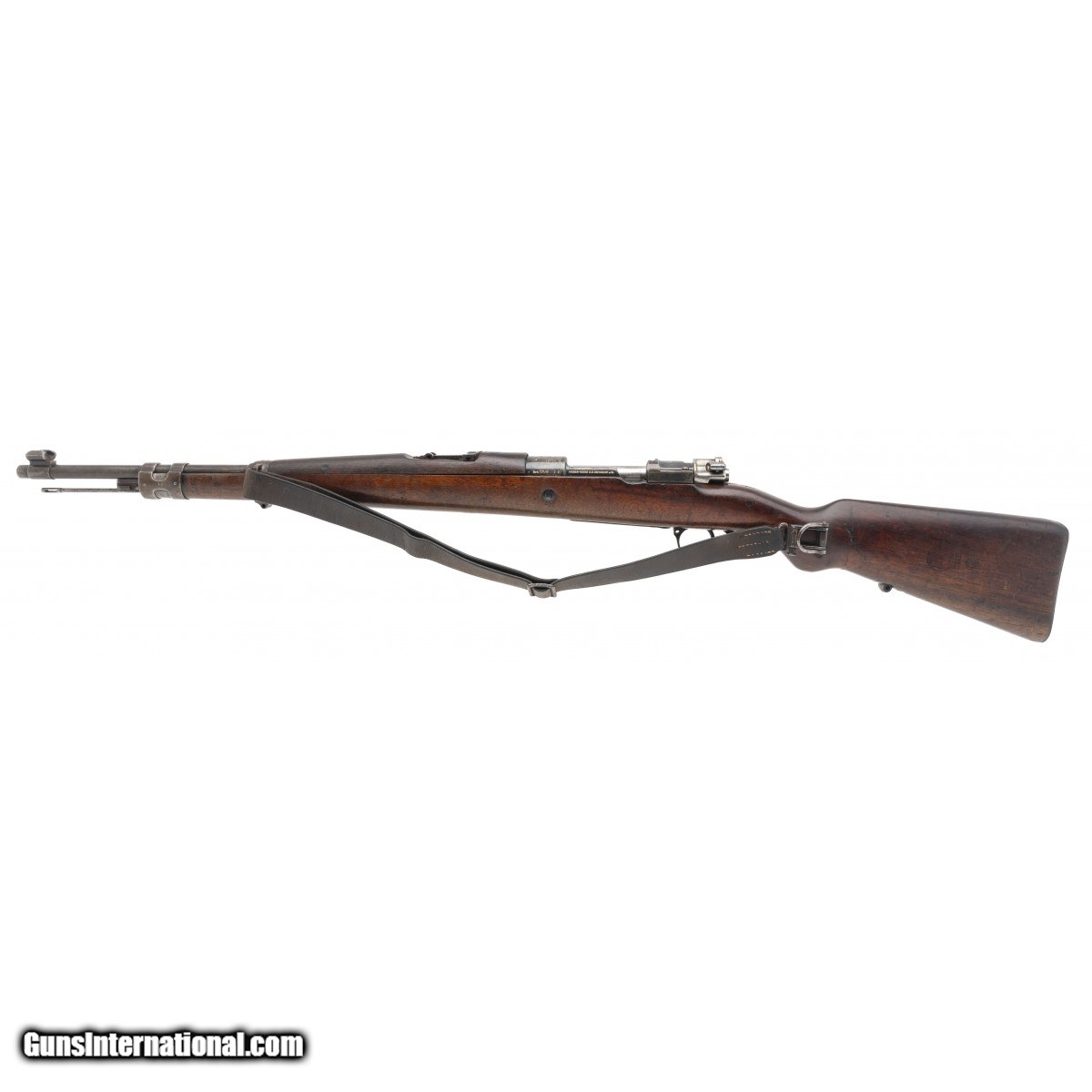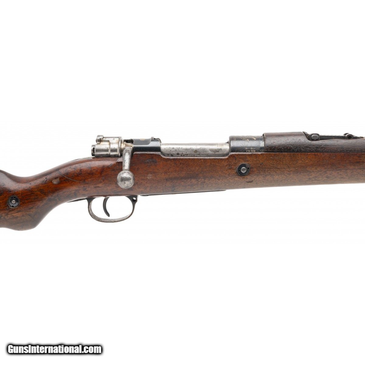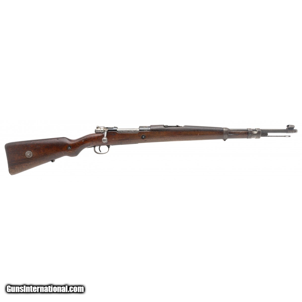 Description: " SN: 39. Bolt-action rifle made by Mauser-Werke for the Chilean Carabineros c. 1935. Fair to good overall condition with about 40% of original blue on the receiver with some scale at the edge of the dust cover. All matching parts. Barrel, barrel band and floor plate mostly patina with patches of cleaned surface rust. Bore is bright with strong rifling. Mauser banner is visible on rear receiver bridge. Wood has typical handling marks with a crack in the dust cover. Chilean coat of arms cartouche is faint but visible. Action functions correctly including safety. Austin location. SOLD Curio/Relic: Yes |