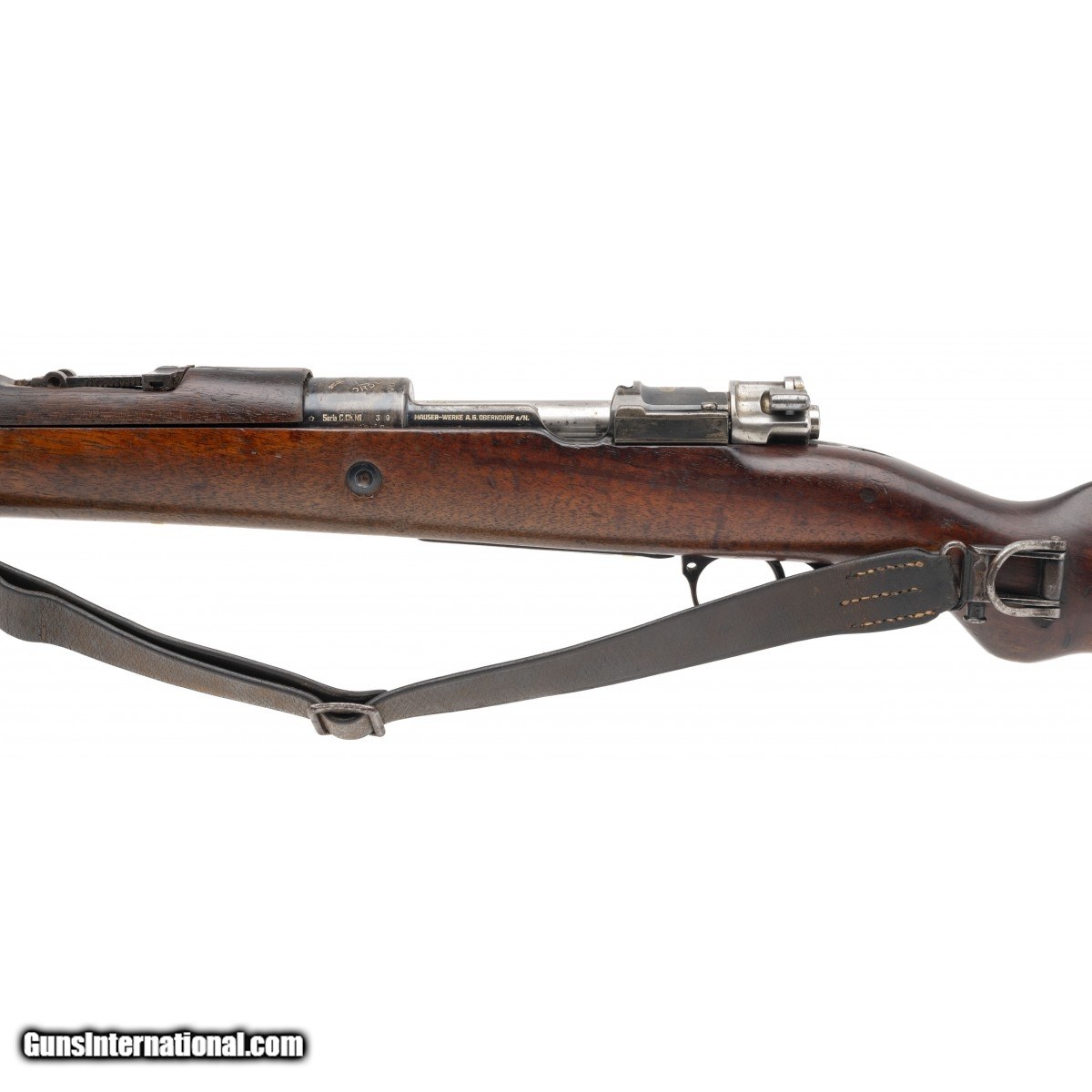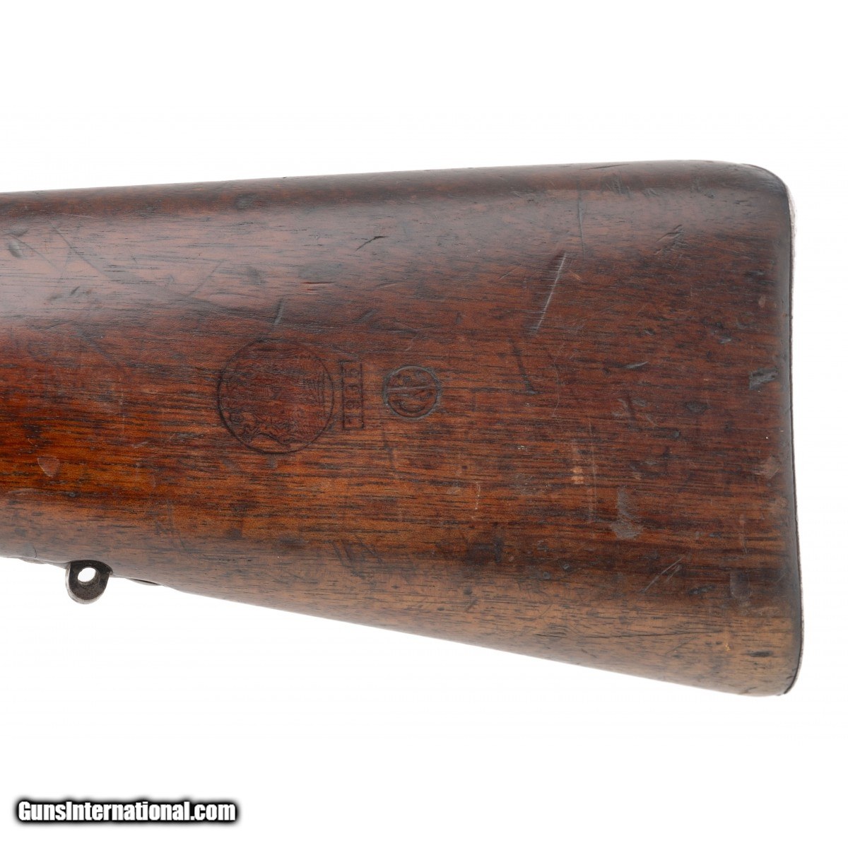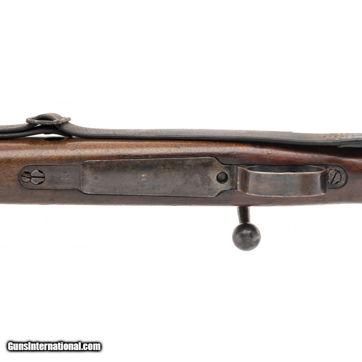 Description: " SN: 39. Bolt-action rifle made by Mauser-Werke for the Chilean Carabineros c. 1935. Fair to good overall condition with about 40% of original blue on the receiver with some scale at the edge of the dust cover. All matching parts. Barrel, barrel band and floor plate mostly patina with patches of cleaned surface rust. Bore is bright with strong rifling. Mauser banner is visible on rear receiver bridge. Wood has typical handling marks with a crack in the dust cover. Chilean coat of arms cartouche is faint but visible. Action functions correctly including safety. Austin location. SOLD Curio/Relic: Yes |