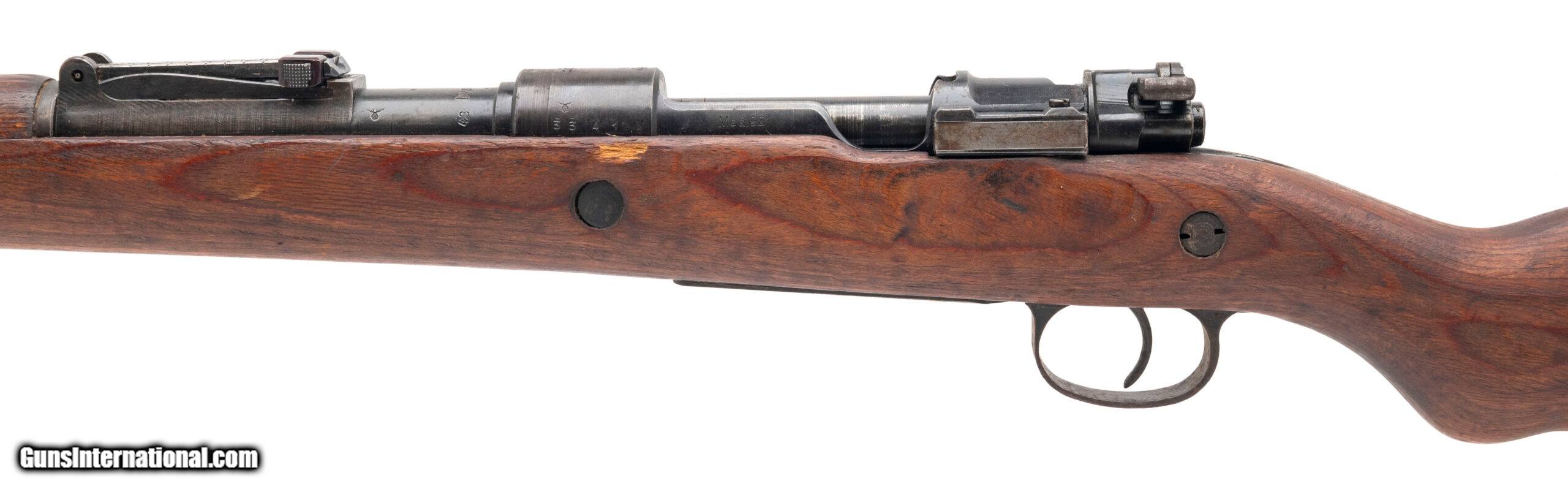 Description: "Serial No. 3341y, manufactured 1943, 24" round barrel, 8mm Mauser. This example of the Karabiner 98k was produced in 1943 under the factory code “BCD", indicating manufacture at Gustloff Werke, one of the primary wartimes K98k producers. The receiver is correctly marked “BCD / 43", denoting both factory and year of production. Serial numbers are matching, excluding the stock and barrel band. Waffenamt military acceptance stamps remain visible on both the barrel and receiver. The metal finish has thinned to a smooth grey patina, showing honest wear from service use. The laminated stock is in very good condition, showing only light handling marks and minor field wear. The action is smooth and functions correctly, making this a solid representative of a mid-war German infantry rifle. Curio/Relic: Yes Price: $1,395.00 Contact Seller |