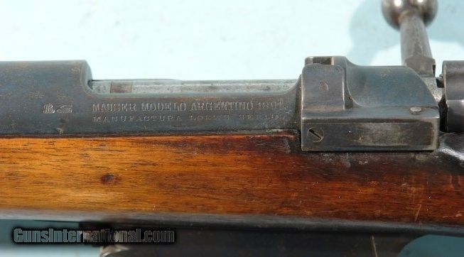 Description: ARGENTINE MAUSER MODEL 1891 7.65ARG MILITARY SPORTER RIFLE. Antique with mismatched serial numbers. Original barrel length with just wood removed to look less military. Original battle sights. Mint bore and rifling. Would make a nice shooter. "Loewe/ Berlin" address denotes quality Mauser German made. Argentine crest removed typical of export but NO import marks. SOLD Antique: Yes Rifle Caliber: 7.65x53mm Argentine |