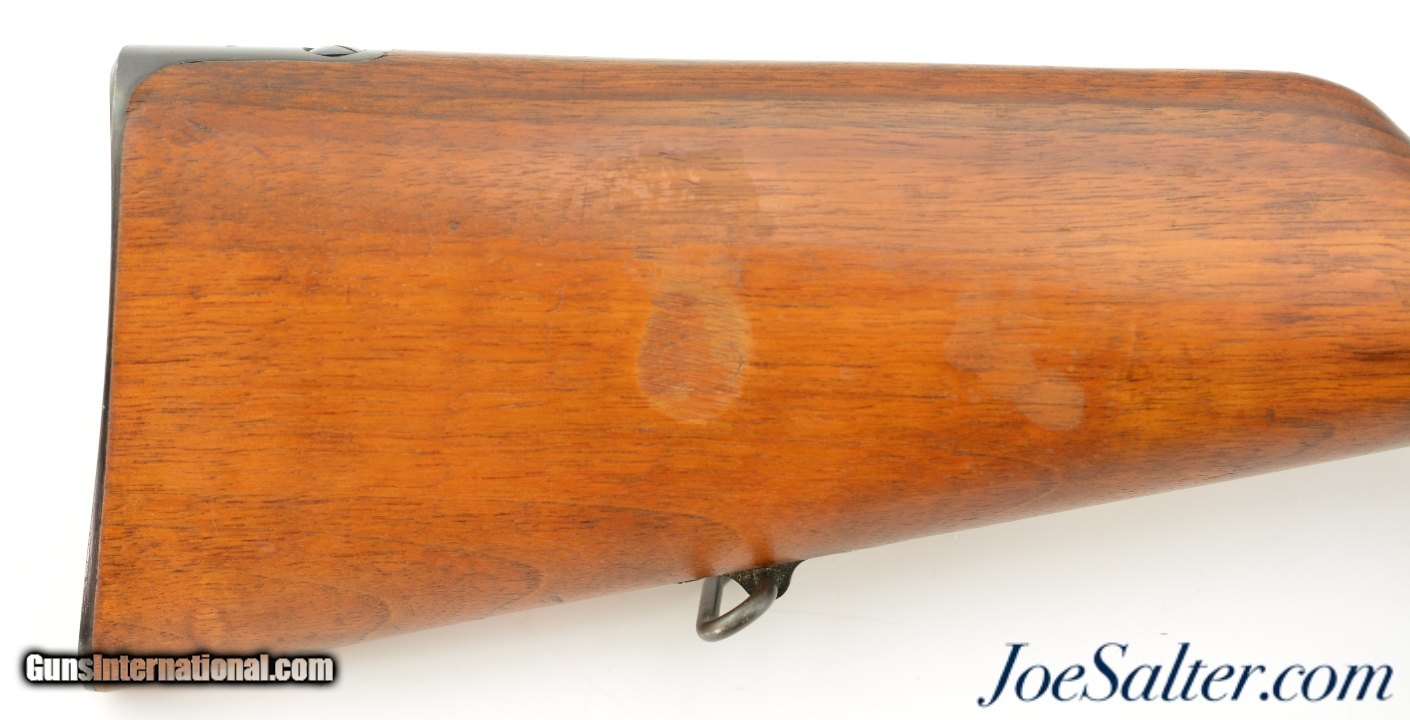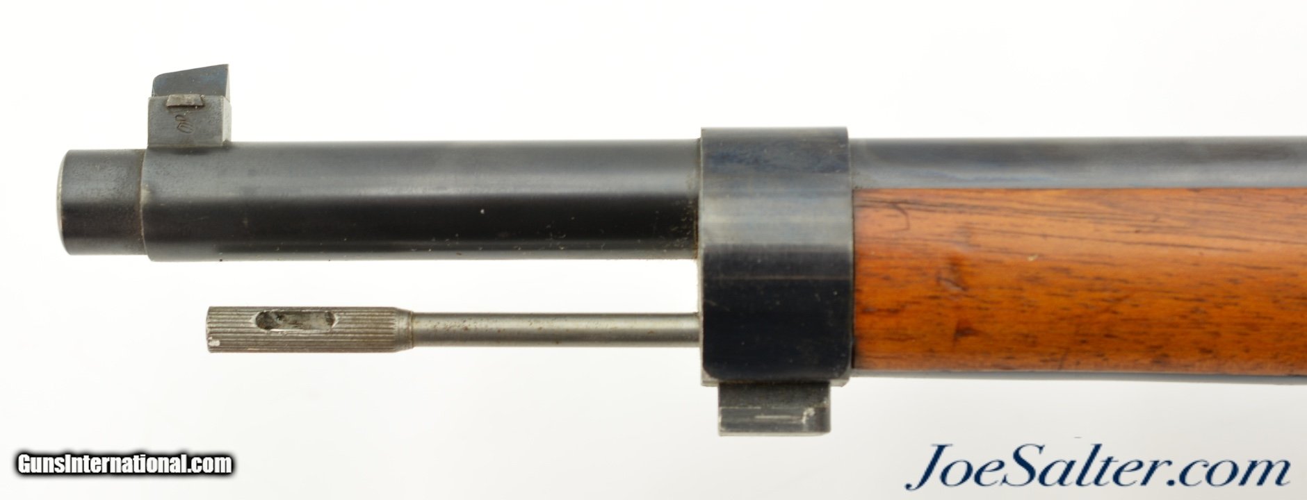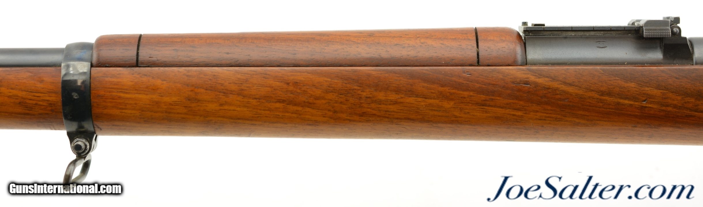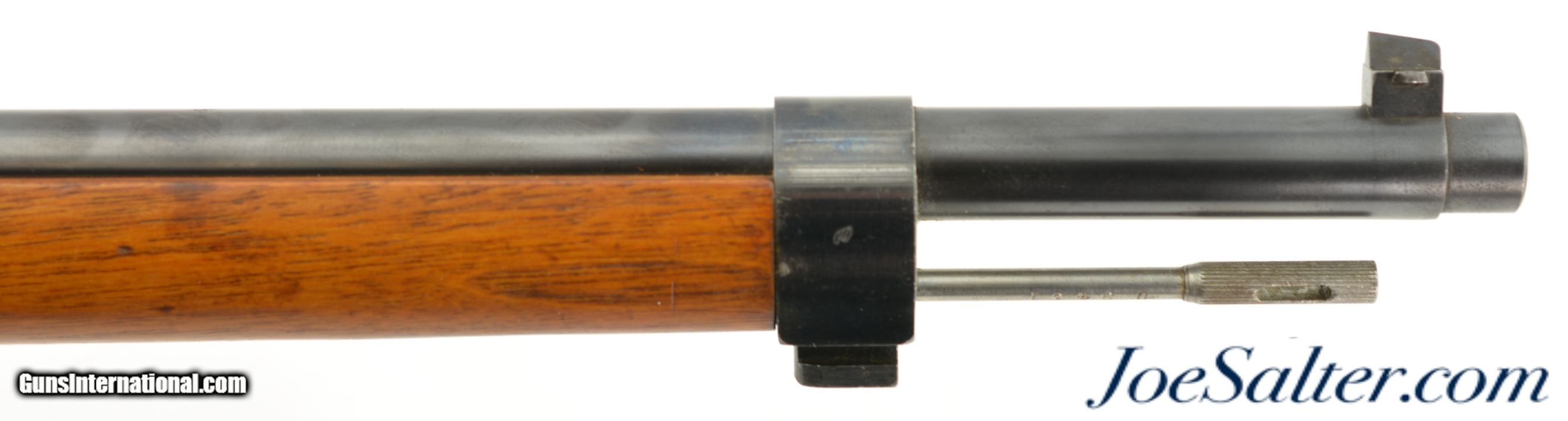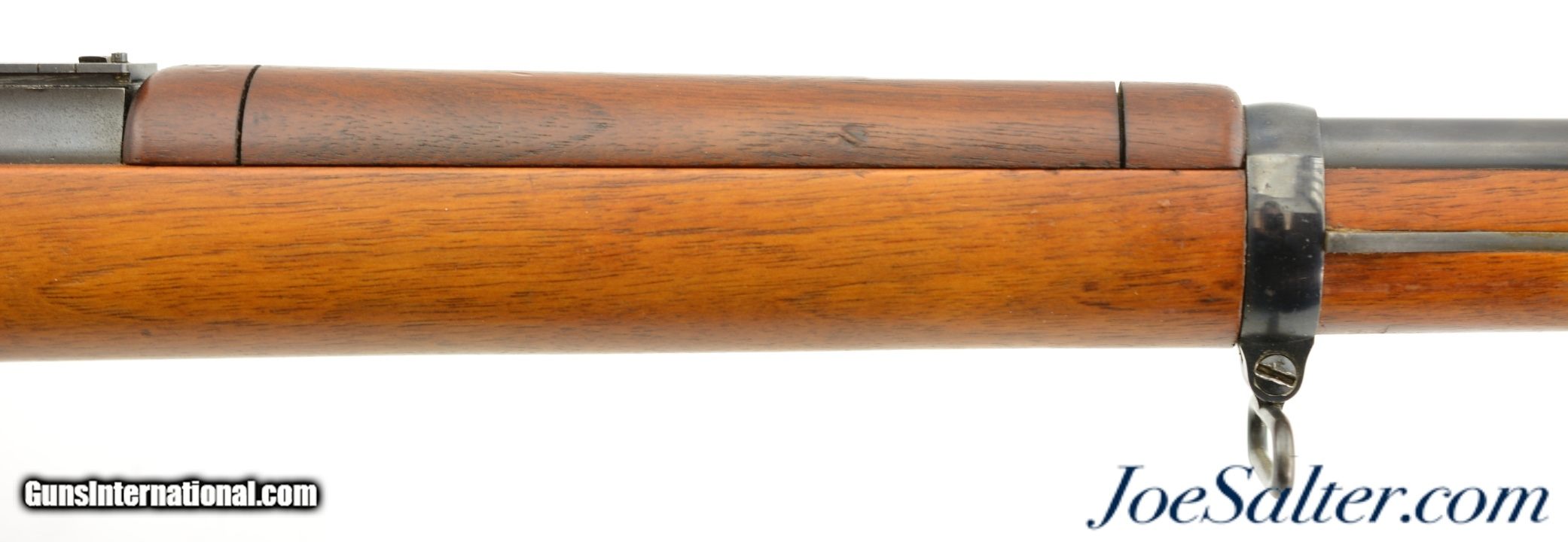 Description: Serial #U9431, 7.65mm Argentine, 29'' barrel with an excellent, bright bore. This is a splendid looking, all matching rifle (including the cleaning rod) with "scrubbed" receiver crest, that retains 95-97% of the original blue finish on the metal, with some mild silvering at the muzzle, along the high and exposed edges, and only traces of freckling marring the original armory bright along the bolt body and handle. The bolt latch retains most of the original brilliant nitre blue as well. All of the remaining markings are crisp and clear. The stock rates fine, with some scattered handling marks and blemishes through the otherwise fine original finish, and the Argentine cartouches are crisp and clear. This is a fantastic example of a little-used Argentine rifle, cleaned of the national crest for use by Paraguay in the Chaco War with Uruguay, and rates fine-near excellent overall. FFL or C&R; Curio/Relic: Yes Price: $945.00 Contact Seller |