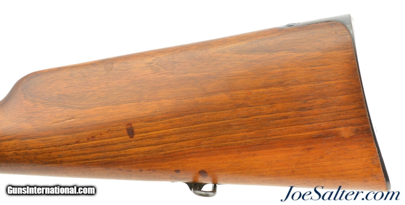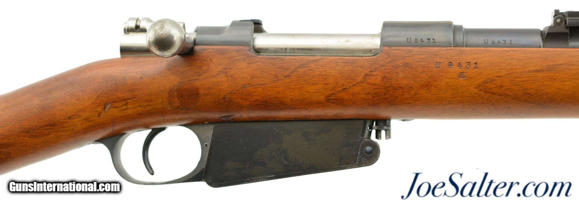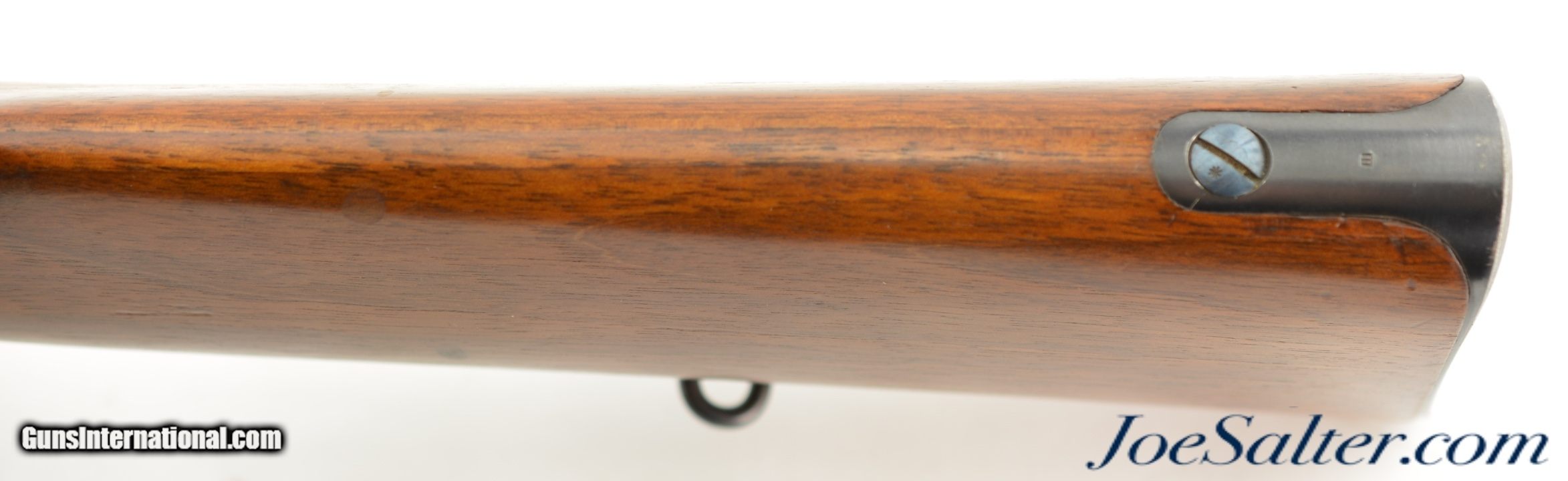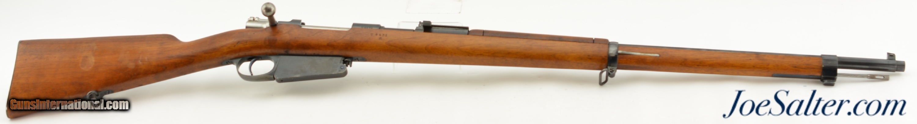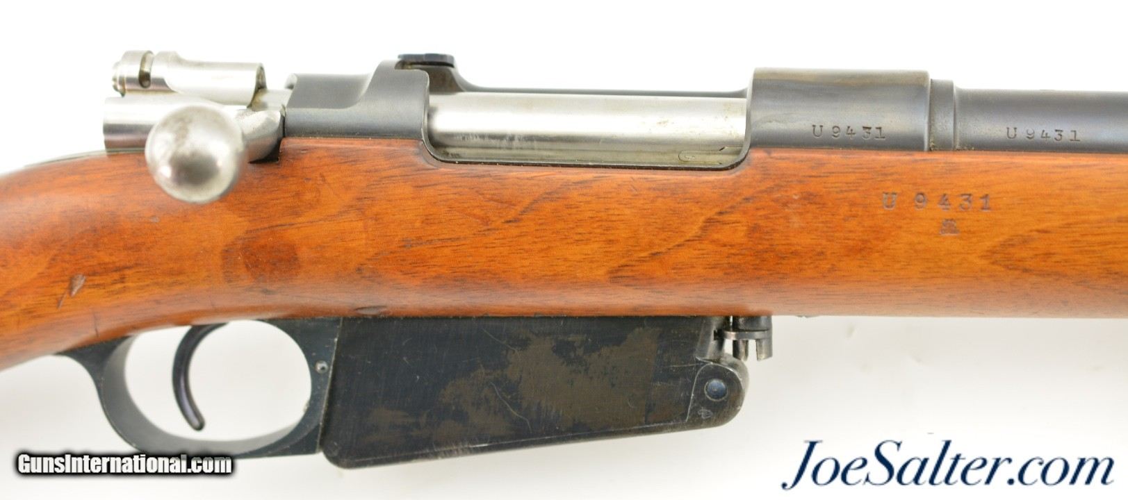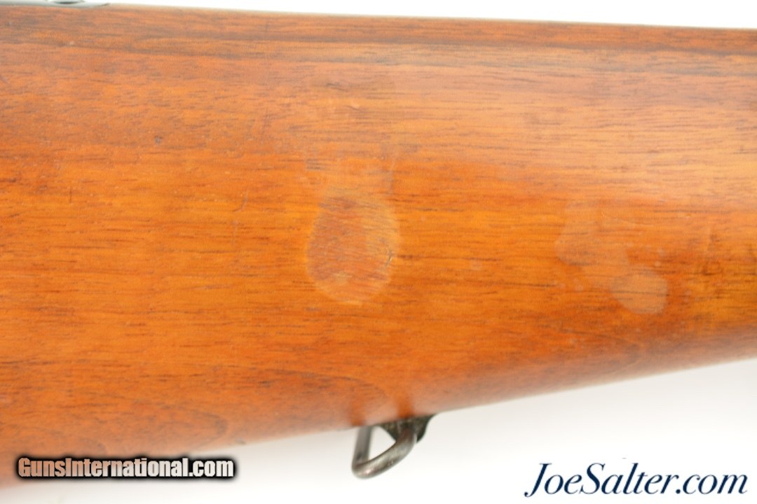 Description: Serial #U9431, 7.65mm Argentine, 29'' barrel with an excellent, bright bore. This is a splendid looking, all matching rifle (including the cleaning rod) with "scrubbed" receiver crest, that retains 95-97% of the original blue finish on the metal, with some mild silvering at the muzzle, along the high and exposed edges, and only traces of freckling marring the original armory bright along the bolt body and handle. The bolt latch retains most of the original brilliant nitre blue as well. All of the remaining markings are crisp and clear. The stock rates fine, with some scattered handling marks and blemishes through the otherwise fine original finish, and the Argentine cartouches are crisp and clear. This is a fantastic example of a little-used Argentine rifle, cleaned of the national crest for use by Paraguay in the Chaco War with Uruguay, and rates fine-near excellent overall. FFL or C&R; Curio/Relic: Yes Price: $945.00 Contact Seller |