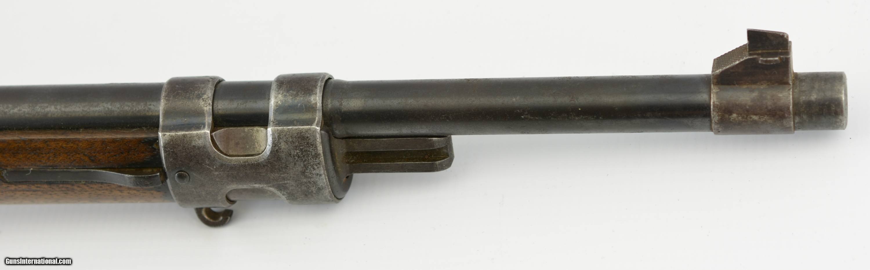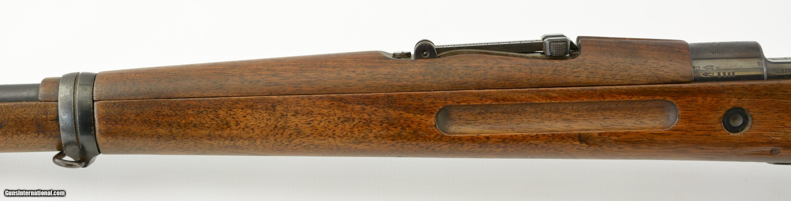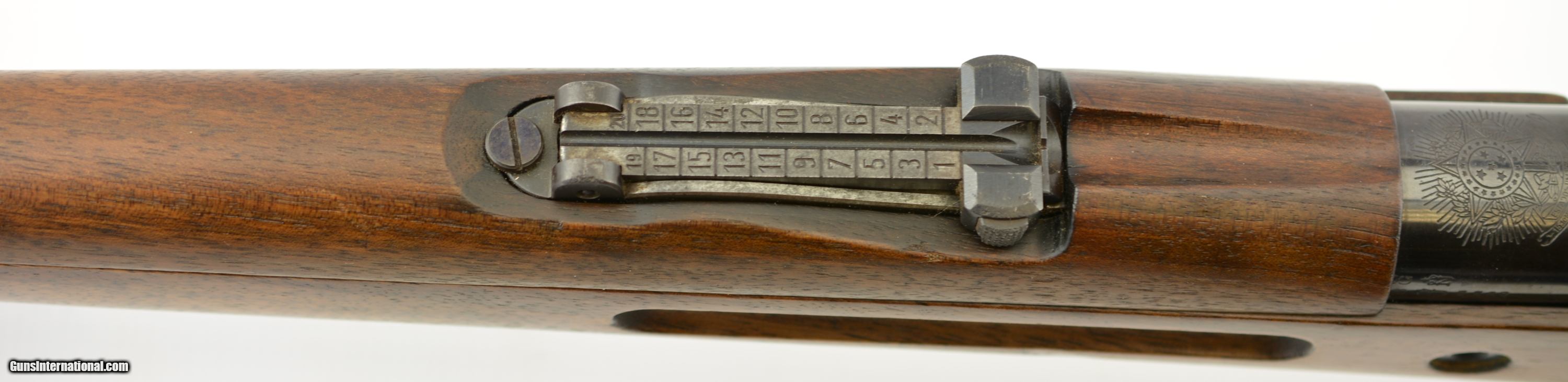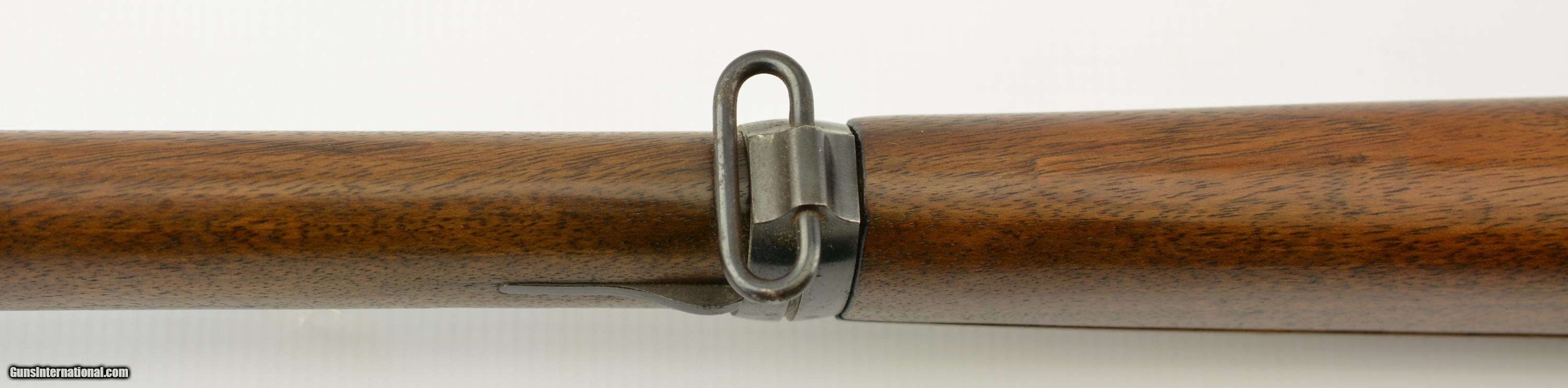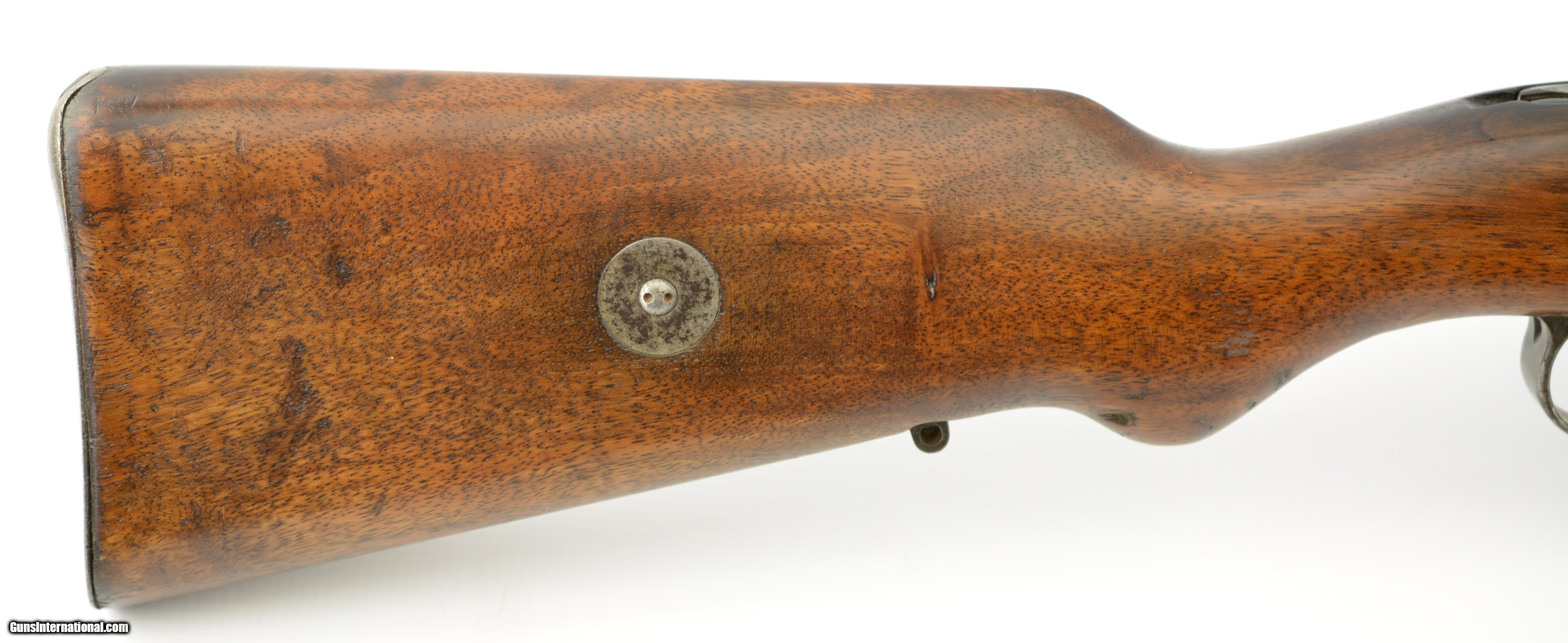 Description: Serial #5568, 7mm Mauser, 29 1/2" barrel with an excellent, bright bore. This is a Mauser Banner marked rifle with a crisp Brazilian crest on the receiver. The import marked barrel has about 60-70% of the original blue remaining, while the receiver has 80-85% bright, original blue. The balance of the metal has turned to a dark, pewter gray with spots of light freckling throughout. The matching numbered bolt is finished factory bright, and has mild freckling throughout. The walnut stock and forend have been arsenal refinished and have several bruises and blemishes along the newer varnish. The cleaning rod is not included. This is a fine example of a desirable 7mm contract Mauser, and would make a great addition to a collection. FFL or C&R SOLD Manufacturer: Brazil Model: 1935 Caliber Info: 7mm Gauge Info: 7mm |