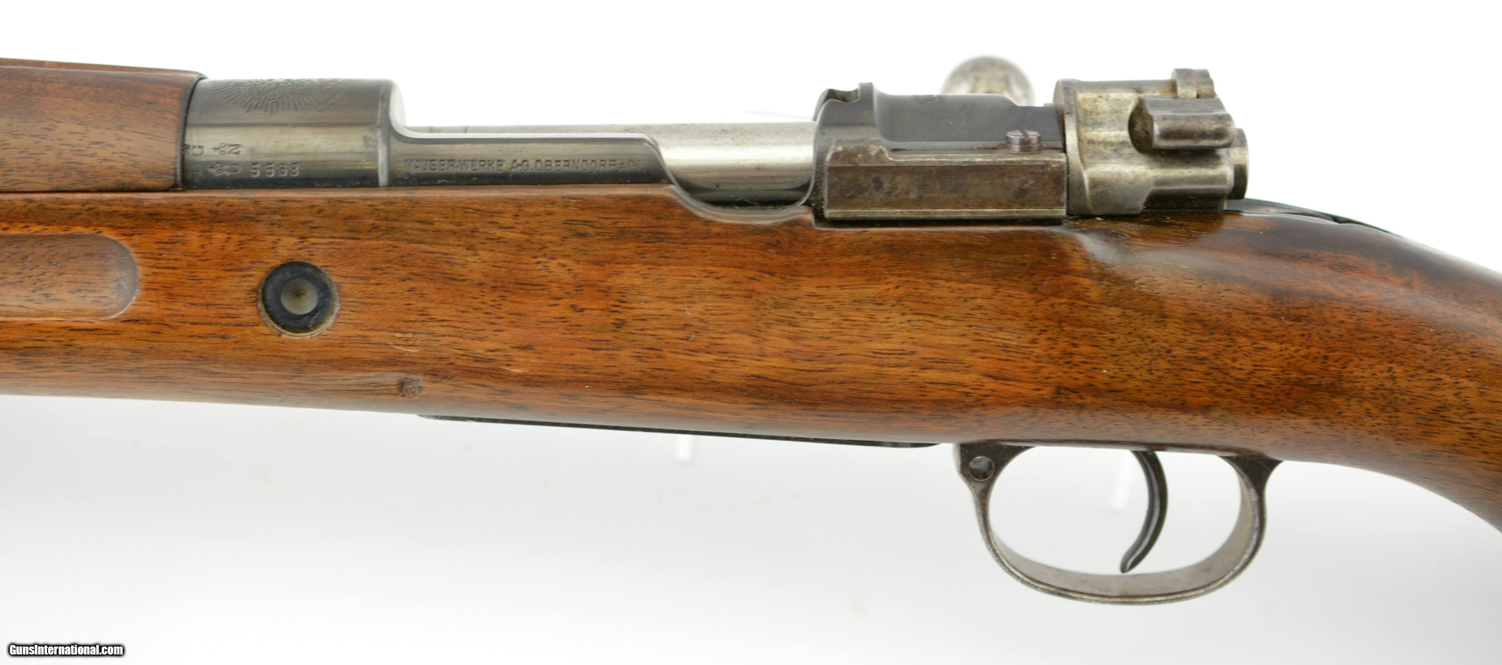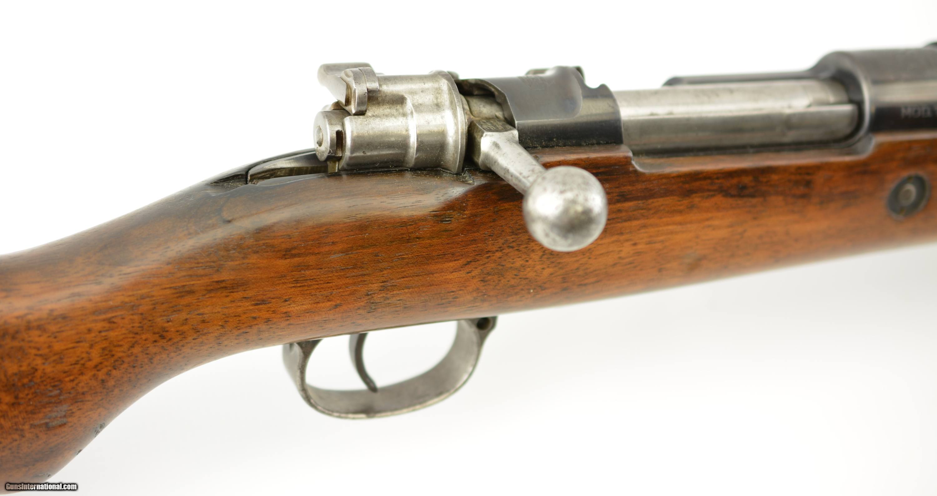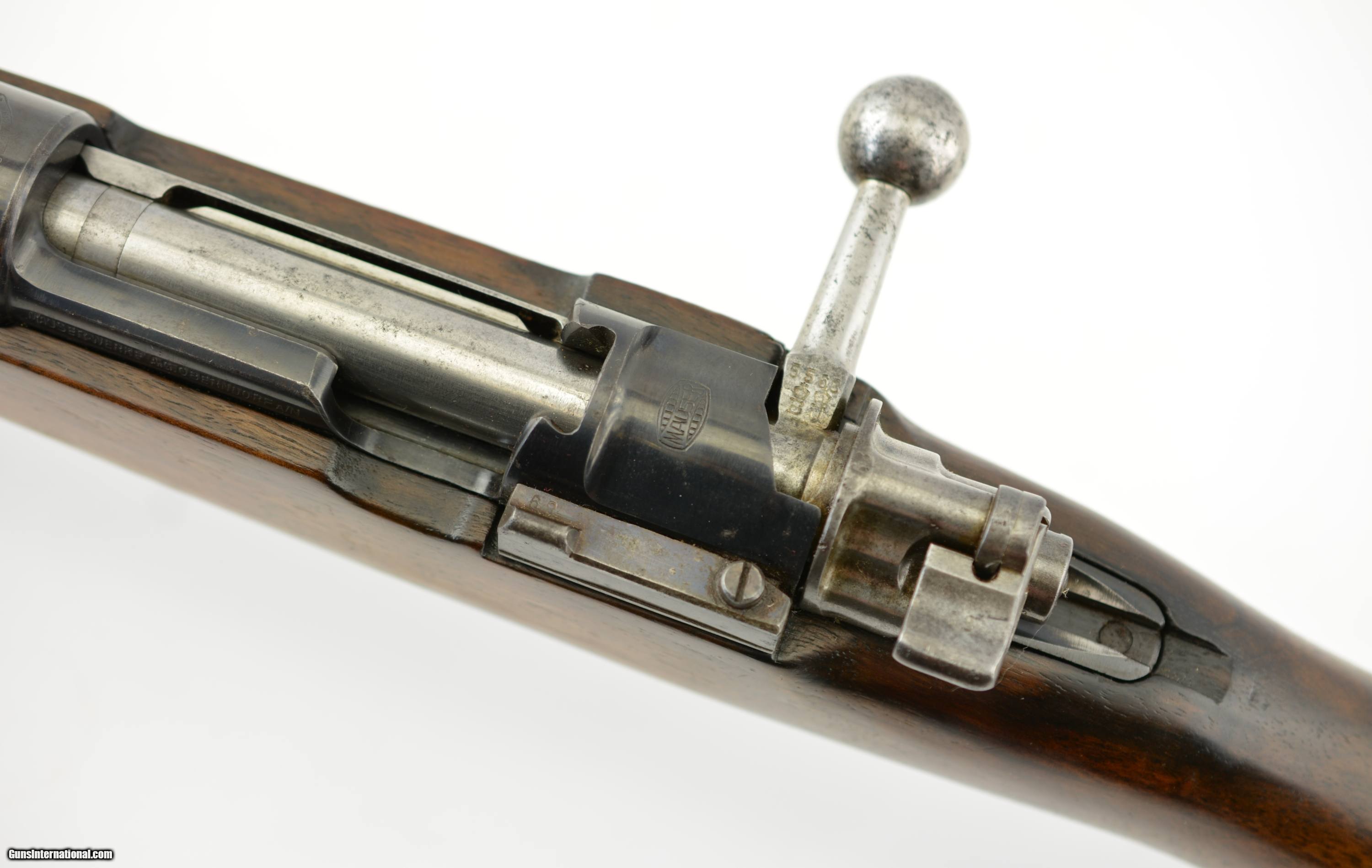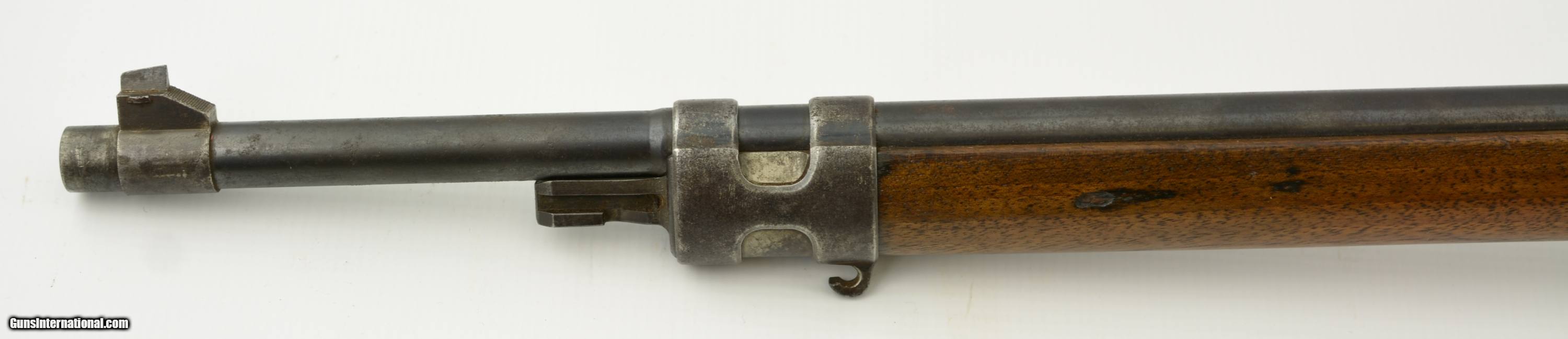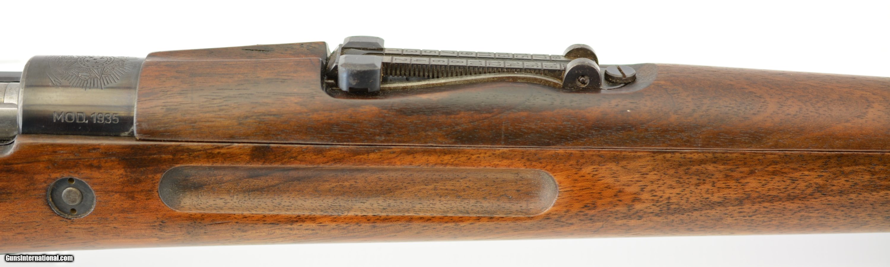 Description: Serial #5568, 7mm Mauser, 29 1/2" barrel with an excellent, bright bore. This is a Mauser Banner marked rifle with a crisp Brazilian crest on the receiver. The import marked barrel has about 60-70% of the original blue remaining, while the receiver has 80-85% bright, original blue. The balance of the metal has turned to a dark, pewter gray with spots of light freckling throughout. The matching numbered bolt is finished factory bright, and has mild freckling throughout. The walnut stock and forend have been arsenal refinished and have several bruises and blemishes along the newer varnish. The cleaning rod is not included. This is a fine example of a desirable 7mm contract Mauser, and would make a great addition to a collection. FFL or C&R SOLD Manufacturer: Brazil Model: 1935 Caliber Info: 7mm Gauge Info: 7mm |