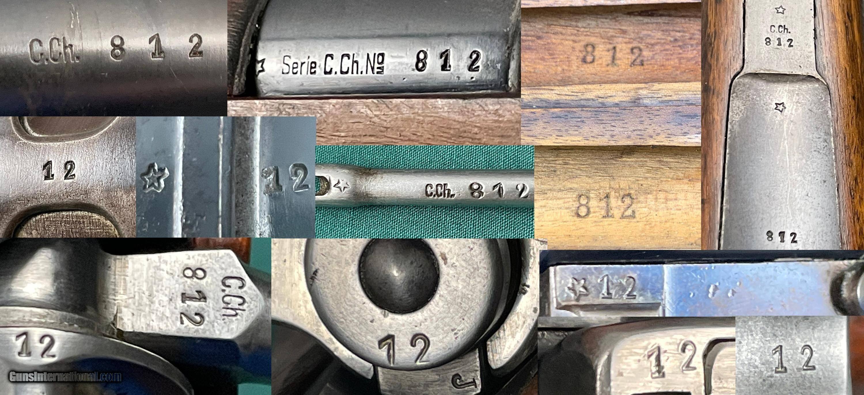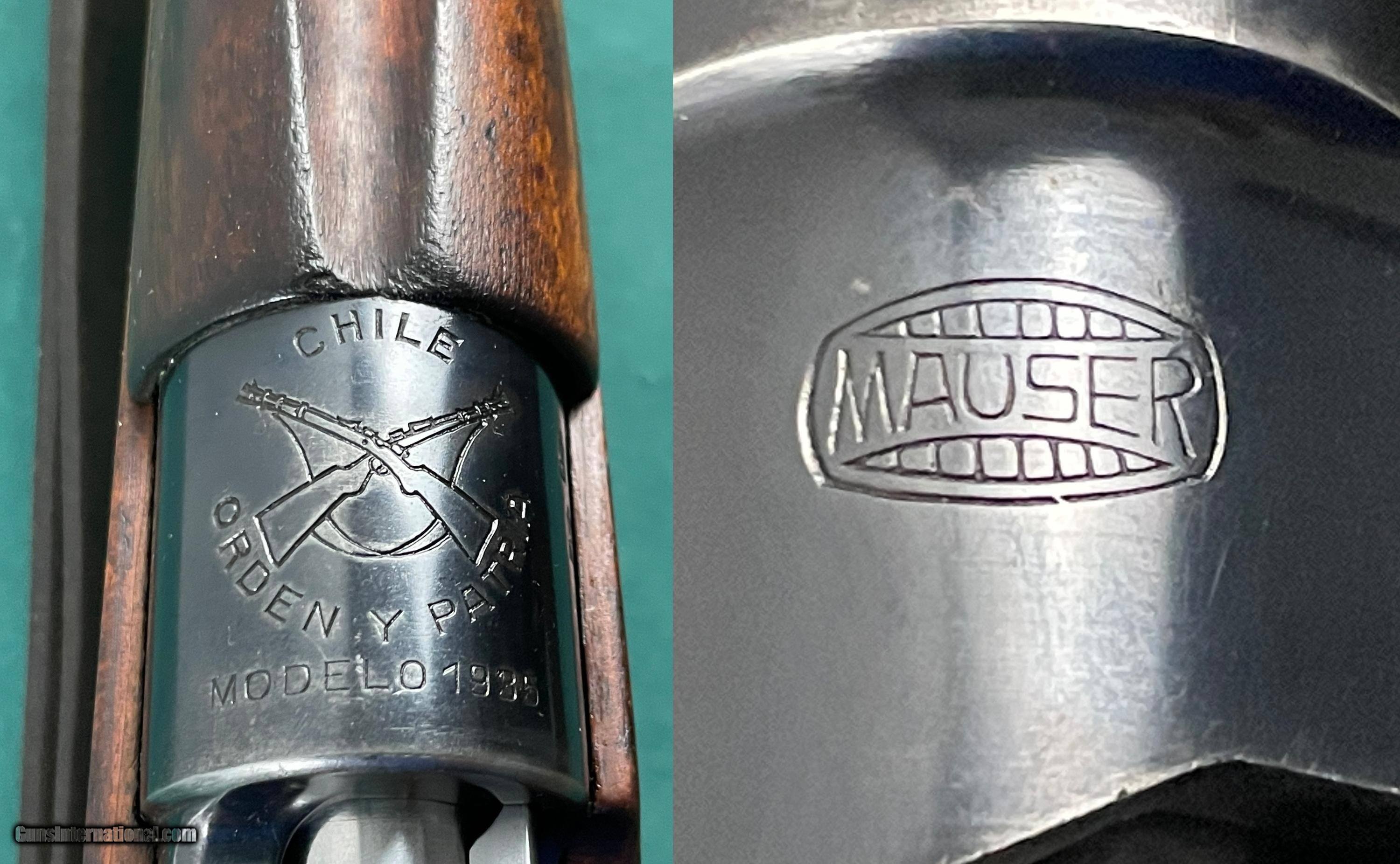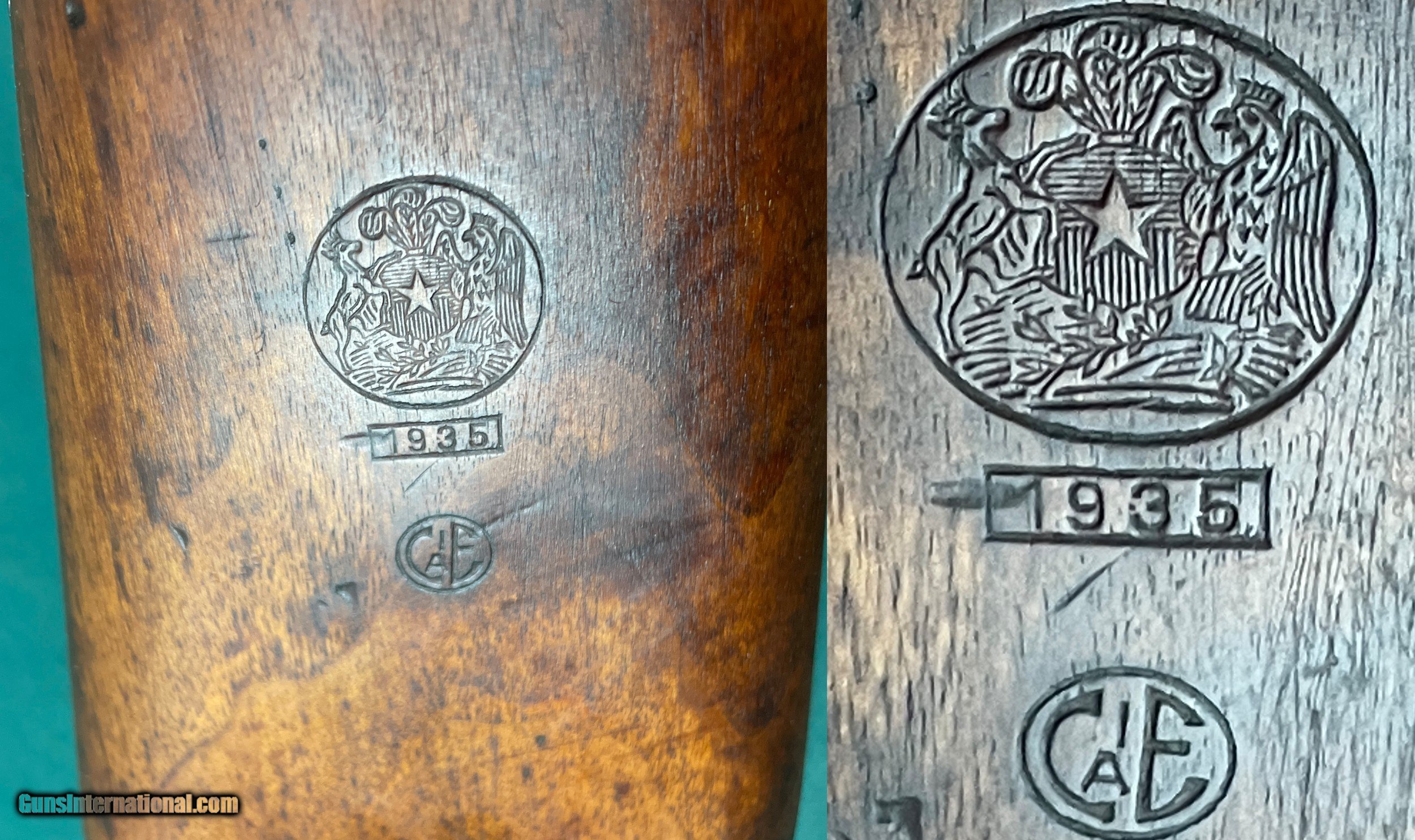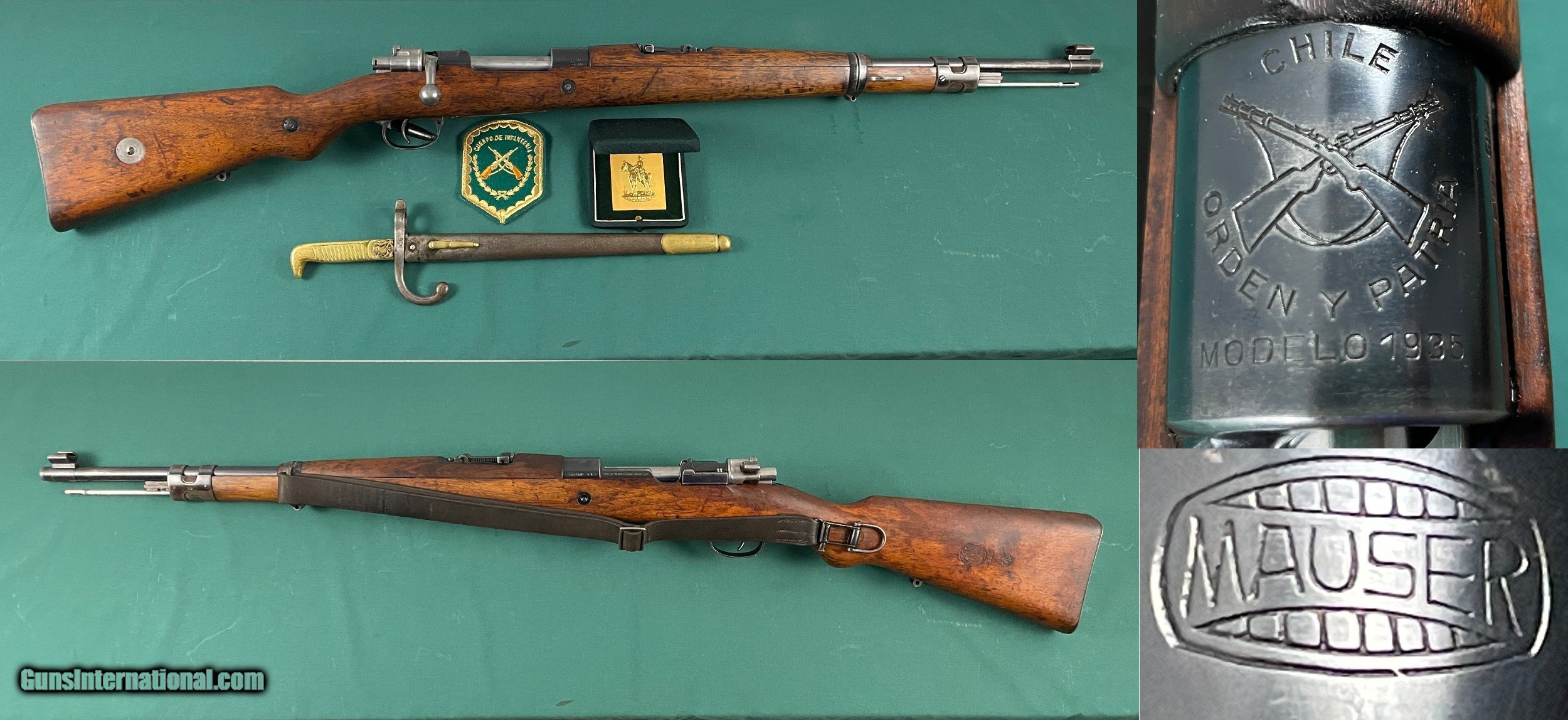 Description: 1935 CHILEAN CARABINEROS POLICE MAUSER BANNER CARBINE ALL MATCHING, 7x57mm ONLY 10,000 made. Superb carbine with crisp-detailed markings and cartouches, coming from my private collection; the best example I had seen in 15 years of collecting! The includes the carbine with the sling, a very rare Police Carabineros side arm (Alex Coppel); a Police Carabineros Orden Y Patria plate in a case and a Carabineros patch. In 1935, Mauser OBERNDORF was contracted by the government of Chile to build 10,000 new carbines. The guns were specially made and provided to the Carabineros de Chile, a military styled investigative POLICE force under the Ministry of the Interior. The Carabineros covered much of the rugged and remote countryside by horseback, and the side mounted sling was handy. The crossed rifle logo of the police force is nicely stamped on the receiver ring, with the slogan "ORDEN Y PATRIA", which translates to honor and homeland. Chile’s MODELO 1935 in 7x57mm rifle is unique. It is actually labeled as a carbine while having the 21.50-inch barrel of the short rifle. It is based on the Mauser Model 1898 action, but this time Chile returned to Germany for manufacture at Mauser-Werke in Oberndorf and carries the MAUSER BANNER LOGO on the rear of the receiver as used during the 1930’s. The stock has pistol grip and sling swivels on the stock’s left side of the Chilean Model 1935 rifles. Out of the 10,000 made, a very small number of these rifles were imported to the US meanwhile, a good quantity still remains in Chile to use for parades and training purposes. Condition: From my personal collection. Overall in Excellent condition, very clean gun with NO visible pitting above woodline. Well defined, deep markings, inspection marks and cartouches. Appearing ALL ORIGINAL, ALL CORRECT MILITARY CONFIGURATION, ALL MATCHING NUMBERS (receiver, barrel, all exposed parts of the bolt, magazine floor plate, barrel bands, cleaning rod, butstock and wood handguard. Appearing to have the original bluing very nice bright deep, clean on the receiver and on the rear bridge; although there is some edge wear, fading and thinning on the exposed forward portion of the barrel, floor plate, trigger guard and bands exhibiting some smooth grayish-plumb even pleasing patina, scratches-handling marks, scattered very few tiny aging spots in the barrel between barrel bands. Beautiful CROSS RIFLES Orden Y Patria CARABINEROS Crest on the reciver ring and the MAUSER BANNER logo on the rear of the receiver. Bright Bent bolt as manufactured, with the bolt face clean without a ring around the firing pin hole. Buttplate has aging spots specially on the upper part; scratches-handling marks. The original MATCHING German walnut stock has NO CRACKS, NO GAUGES, NO CHIPS; it has nicely marked cartouches, and because of the beautiful grain the cartouches are crisp and well defined; showing the usual discoloration, stains, tiny dents, scuffs, scratches, bruises, nicks, handling marks (also commonly found firing pin dents from officers servicing the carbine on the field). Stock has NO CRACKS, NO GAUGES, NO CHIPS. Action is nice and crisp appearing in good working order. To the naked eye, the bore is smooth, bright with good rifling, light gray groves. It has a tiny discreet import mark on the right side of the barrel above the bayonet lug. The sling swivels are in good condition. It Includes the original leather sling in good supple condition with some expected wear and minor creases; stitching is good. This rifle seems to have been carry more than it has been shot; the bolt face is clean with NO ring around firing pin. Crisp markings; "crowned B" (Beschuss-fired), " crowned G" (geschoss-projectile), "crowned N" (nitrocellulose) and the "crowned U" (untersuchung-examination) besides the MAUSER-WERKE A.G. OBERNDORF A/N on the side of the receiver. Book pictures for reference only. SIDE ARM: Carabineros Yataghan 1908. Sidearm is made from the ALEX COPPEL French M1874 Gras sword bayonet and scabbard.This sidearm utilizes the blade and crosspiece of the French M1874 Gras sword bayonet, mated to a cast brass hilt. The blade is shortened and the muzzle ring adjustment screw ground flush. The M1874 scabbard has the French frog loop replaced with a stylized brass frog stud and a brass chape added to close the shortened scabbard body. According to the Museo Histórico Carabineros de Chile (Carabineros Historical Museum of Chile), this sidearm was designated Carabineros Yataghan 1908. They indicate that these were produced by the German firm Alex Coppel of Solingen for the Policías Fiscales (Fiscal Police). Increasing unrest and protests by Marxists gave rise to the need for a national police force. The Policías Fiscales were established in 1896 and became Chile’s first professional police. Although a police force, the Policías Fiscales also were involved in social policy related to children, establishing evening schools to educate poor children and their working parents; and shelters to keep orphaned and abandoned children away from street crime. In 1927, the Policías Fiscales and Arma dei Carabinieri (a mounted rural paramilitary police) merged to create the Carabineros de Chile, Chile’s present-day national police. The side arm brass handle has the Chilean Coat of Arms. Blade is bright with few tiny scattered pits, aging spots, scratches-handling marks as well as the scabbard. The scabbard fits the side arm well; it has finish loss, scratches and aging spots. Overall this rifle is an outstanding specimen of a very scarce CARBINE-SHORT rifle (21.5" which it makes it very desirable for its maneuverability) . ONLY 10,000 made (very few made it to the US). 1935 BANNER MAUSER rifle for the CHILEAN POLICE OBERNDORF German made with the ORDEN Y PATRIA cross rifle on the receiver ring in ALL MATCHING; ALL ORIGINAL COMPLETE (with cleaning rod and sling) CORRECT MILITARY CONFIGURATION very hard to upgrade that would make a fine add
