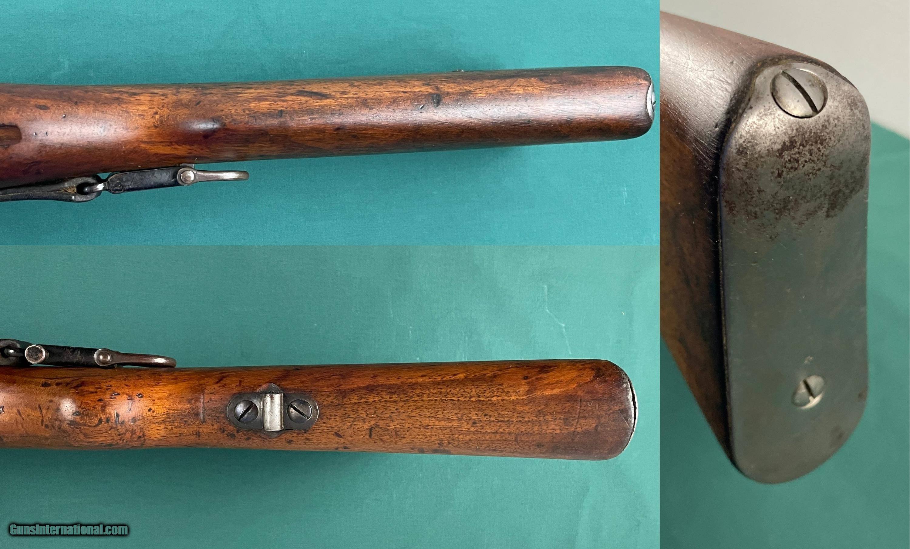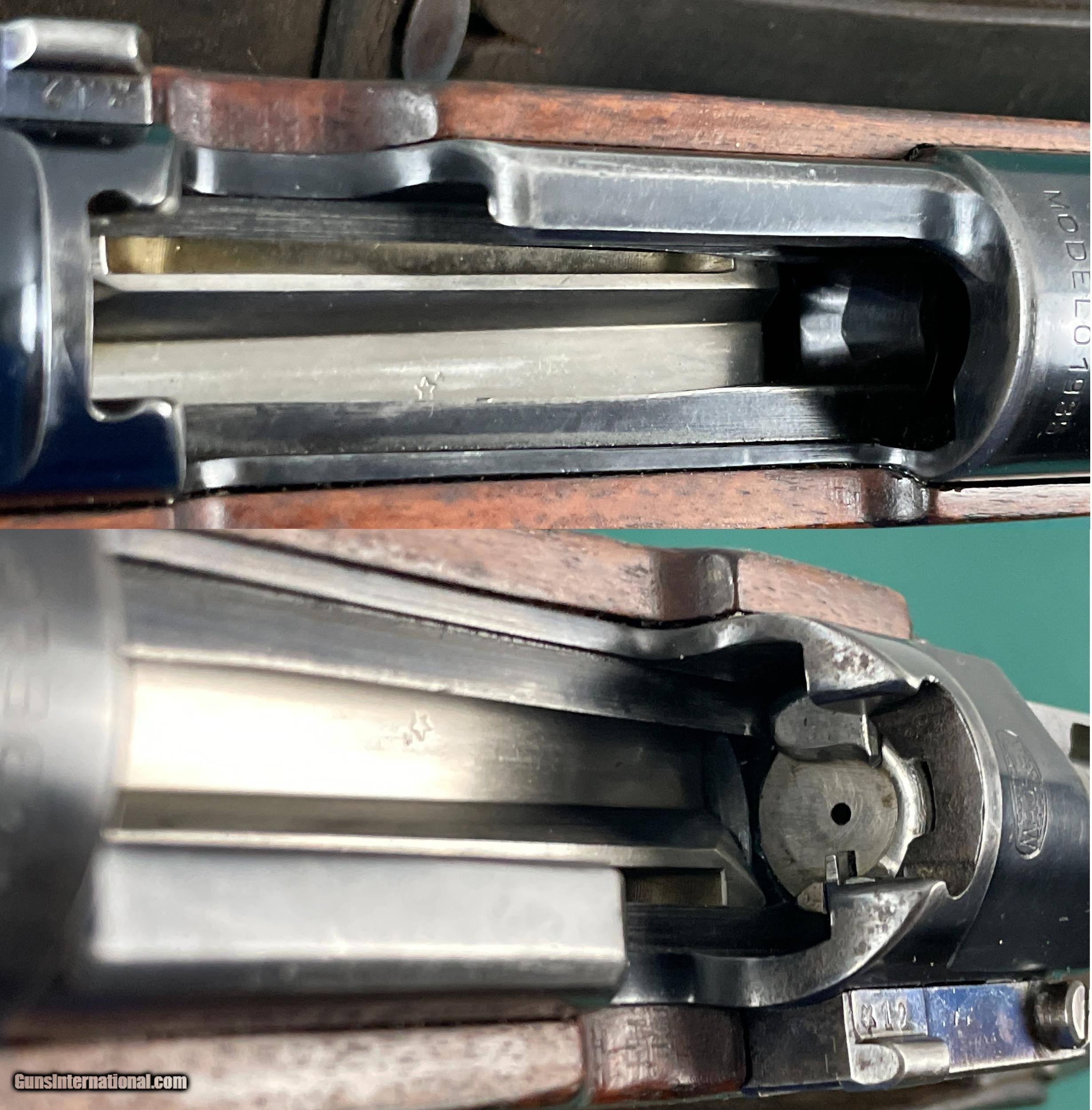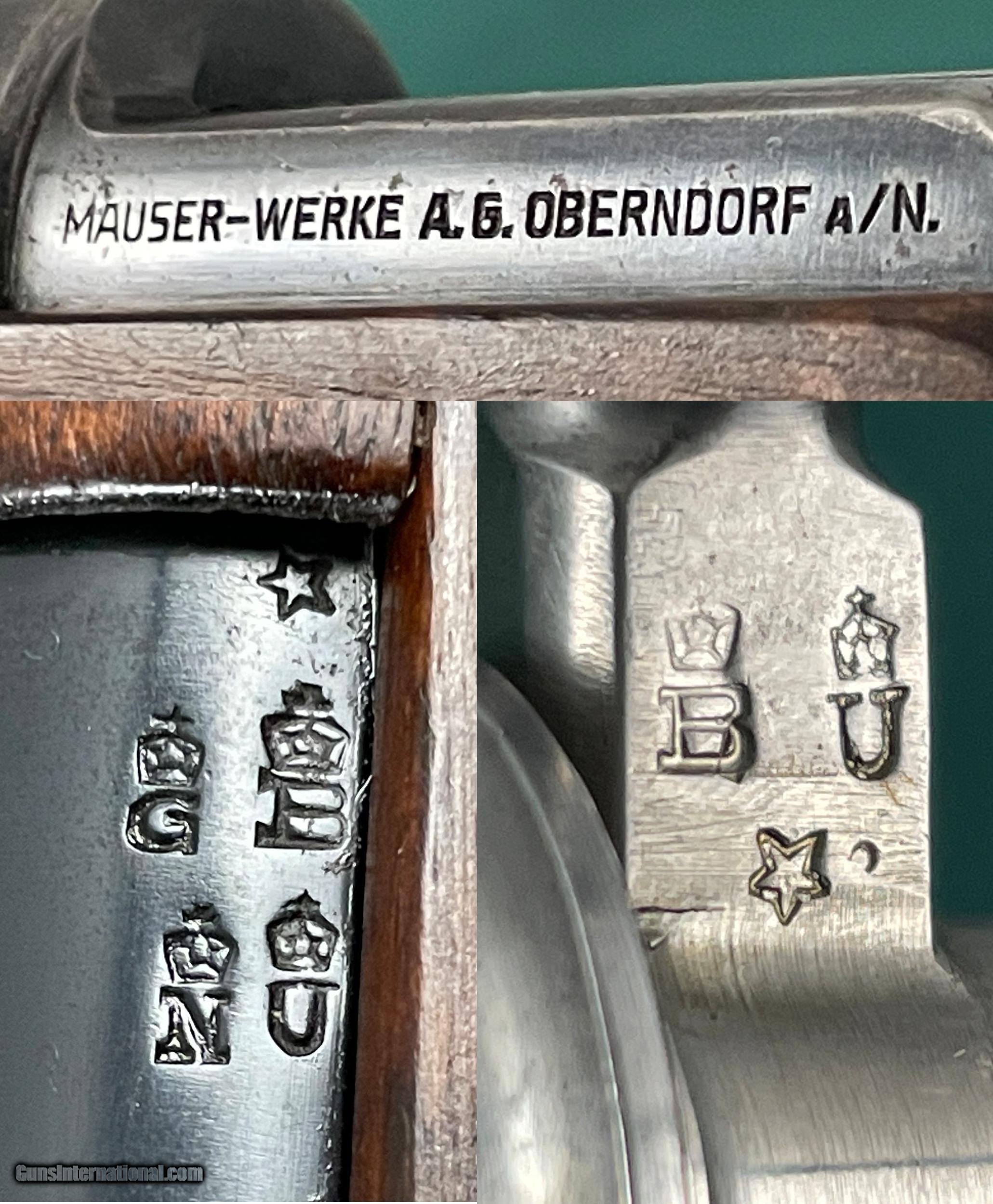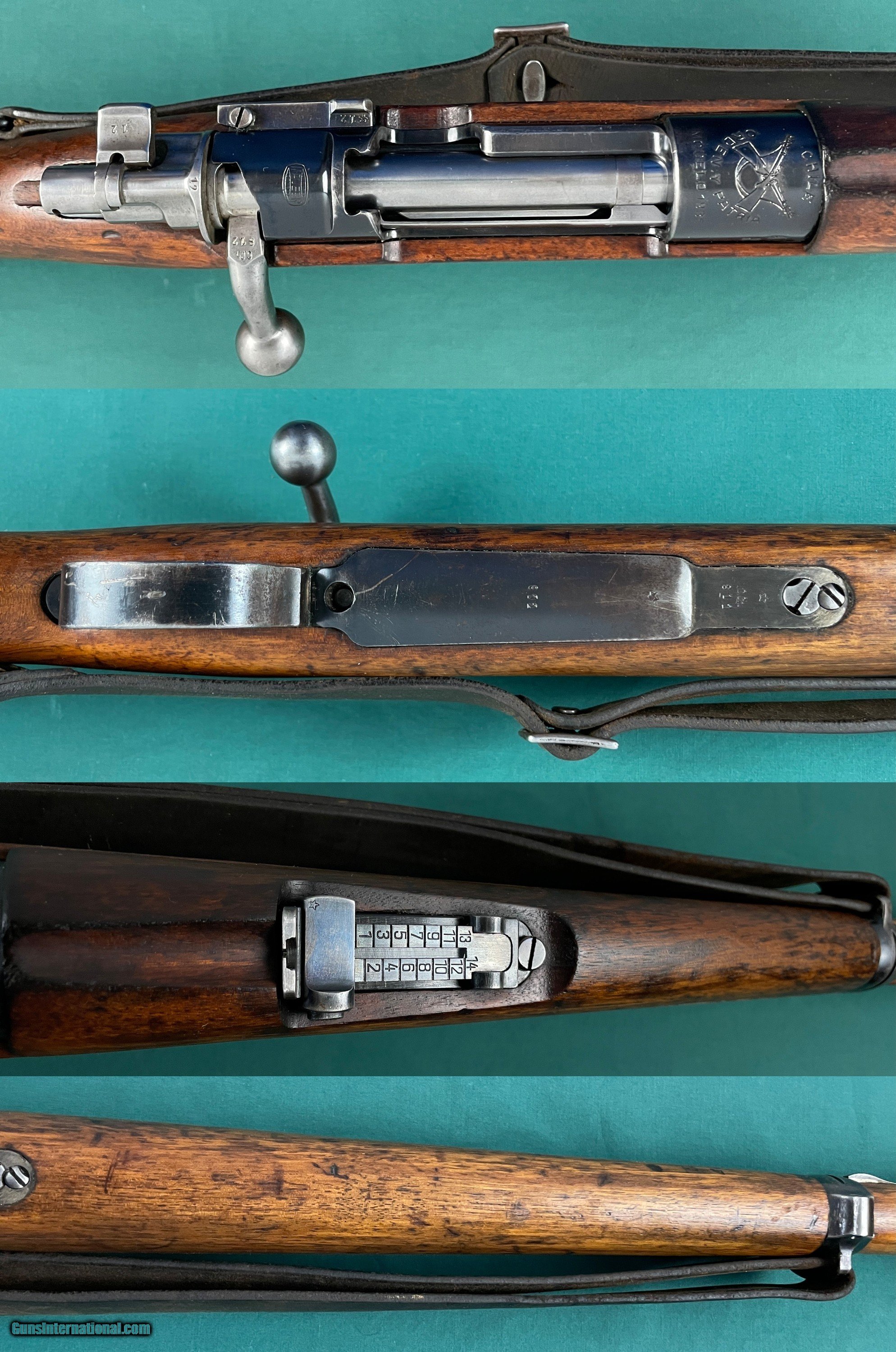 Description: 1935 CHILEAN CARABINEROS POLICE MAUSER BANNER CARBINE ALL MATCHING, 7x57mm ONLY 10,000 made. Superb carbine with crisp-detailed markings and cartouches, coming from my private collection; the best example I had seen in 15 years of collecting! The includes the carbine with the sling, a very rare Police Carabineros side arm (Alex Coppel); a Police Carabineros Orden Y Patria plate in a case and a Carabineros patch. In 1935, Mauser OBERNDORF was contracted by the government of Chile to build 10,000 new carbines. The guns were specially made and provided to the Carabineros de Chile, a military styled investigative POLICE force under the Ministry of the Interior. The Carabineros covered much of the rugged and remote countryside by horseback, and the side mounted sling was handy. The crossed rifle logo of the police force is nicely stamped on the receiver ring, with the slogan "ORDEN Y PATRIA", which translates to honor and homeland. Chile’s MODELO 1935 in 7x57mm rifle is unique. It is actually labeled as a carbine while having the 21.50-inch barrel of the short rifle. It is based on the Mauser Model 1898 action, but this time Chile returned to Germany for manufacture at Mauser-Werke in Oberndorf and carries the MAUSER BANNER LOGO on the rear of the receiver as used during the 1930’s. The stock has pistol grip and sling swivels on the stock’s left side of the Chilean Model 1935 rifles. Out of the 10,000 made, a very small number of these rifles were imported to the US meanwhile, a good quantity still remains in Chile to use for parades and training purposes. Condition: From my personal collection. Overall in Excellent condition, very clean gun with NO visible pitting above woodline. Well defined, deep markings, inspection marks and cartouches. Appearing ALL ORIGINAL, ALL CORRECT MILITARY CONFIGURATION, ALL MATCHING NUMBERS (receiver, barrel, all exposed parts of the bolt, magazine floor plate, barrel bands, cleaning rod, butstock and wood handguard. Appearing to have the original bluing very nice bright deep, clean on the receiver and on the rear bridge; although there is some edge wear, fading and thinning on the exposed forward portion of the barrel, floor plate, trigger guard and bands exhibiting some smooth grayish-plumb even pleasing patina, scratches-handling marks, scattered very few tiny aging spots in the barrel between barrel bands. Beautiful CROSS RIFLES Orden Y Patria CARABINEROS Crest on the reciver ring and the MAUSER BANNER logo on the rear of the receiver. Bright Bent bolt as manufactured, with the bolt face clean without a ring around the firing pin hole. Buttplate has aging spots specially on the upper part; scratches-handling marks. The original MATCHING German walnut stock has NO CRACKS, NO GAUGES, NO CHIPS; it has nicely marked cartouches, and because of the beautiful grain the cartouches are crisp and well defined; showing the usual discoloration, stains, tiny dents, scuffs, scratches, bruises, nicks, handling marks (also commonly found firing pin dents from officers servicing the carbine on the field). Stock has NO CRACKS, NO GAUGES, NO CHIPS. Action is nice and crisp appearing in good working order. To the naked eye, the bore is smooth, bright with good rifling, light gray groves. It has a tiny discreet import mark on the right side of the barrel above the bayonet lug. The sling swivels are in good condition. It Includes the original leather sling in good supple condition with some expected wear and minor creases; stitching is good. This rifle seems to have been carry more than it has been shot; the bolt face is clean with NO ring around firing pin. Crisp markings; "crowned B" (Beschuss-fired), " crowned G" (geschoss-projectile), "crowned N" (nitrocellulose) and the "crowned U" (untersuchung-examination) besides the MAUSER-WERKE A.G. OBERNDORF A/N on the side of the receiver. Book pictures for reference only. SIDE ARM: Carabineros Yataghan 1908. Sidearm is made from the ALEX COPPEL French M1874 Gras sword bayonet and scabbard.This sidearm utilizes the blade and crosspiece of the French M1874 Gras sword bayonet, mated to a cast brass hilt. The blade is shortened and the muzzle ring adjustment screw ground flush. The M1874 scabbard has the French frog loop replaced with a stylized brass frog stud and a brass chape added to close the shortened scabbard body. According to the Museo Histórico Carabineros de Chile (Carabineros Historical Museum of Chile), this sidearm was designated Carabineros Yataghan 1908. They indicate that these were produced by the German firm Alex Coppel of Solingen for the Policías Fiscales (Fiscal Police). Increasing unrest and protests by Marxists gave rise to the need for a national police force. The Policías Fiscales were established in 1896 and became Chile’s first professional police. Although a police force, the Policías Fiscales also were involved in social policy related to children, establishing evening schools to educate poor children and their working parents; and shelters to keep orphaned and abandoned children away from street crime. In 1927, the Policías Fiscales and Arma dei Carabinieri (a mounted rural paramilitary police) merged to create the Carabineros de Chile, Chile’s present-day national police. The side arm brass handle has the Chilean Coat of Arms. Blade is bright with few tiny scattered pits, aging spots, scratches-handling marks as well as the scabbard. The scabbard fits the side arm well; it has finish loss, scratches and aging spots. Overall this rifle is an outstanding specimen of a very scarce CARBINE-SHORT rifle (21.5" which it makes it very desirable for its maneuverability) . ONLY 10,000 made (very few made it to the US). 1935 BANNER MAUSER rifle for the CHILEAN POLICE OBERNDORF German made with the ORDEN Y PATRIA cross rifle on the receiver ring in ALL MATCHING; ALL ORIGINAL COMPLETE (with cleaning rod and sling) CORRECT MILITARY CONFIGURATION very hard to upgrade that would make a fine add