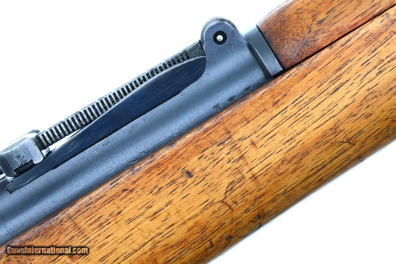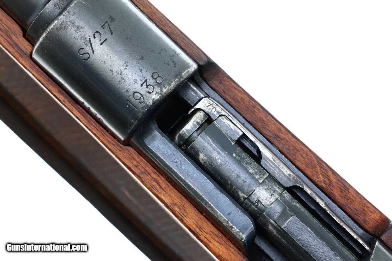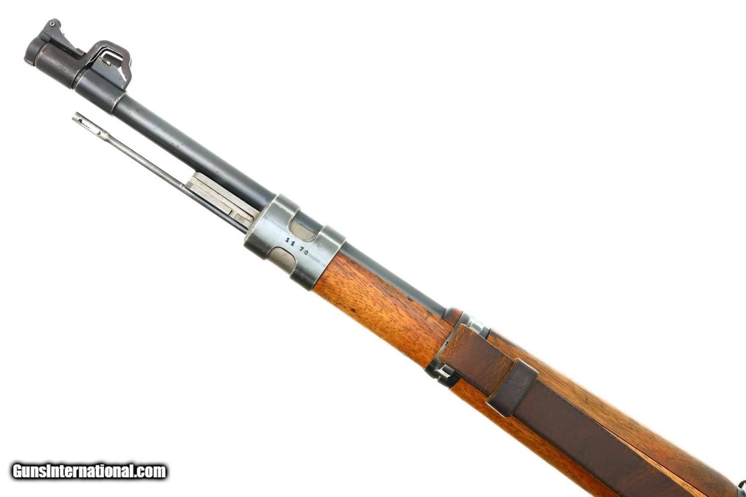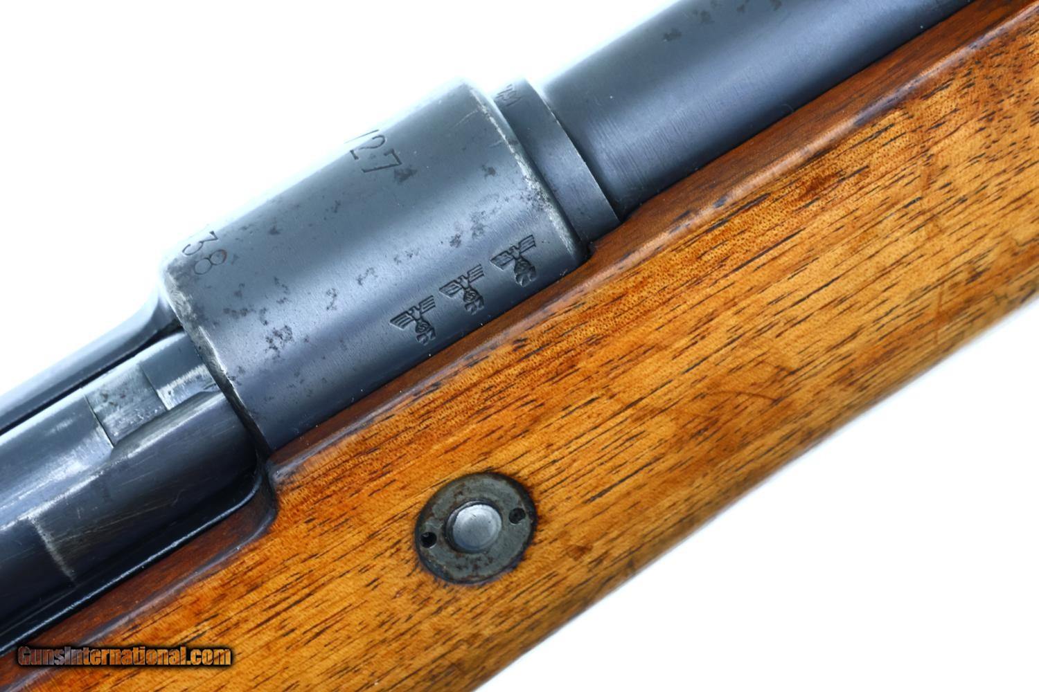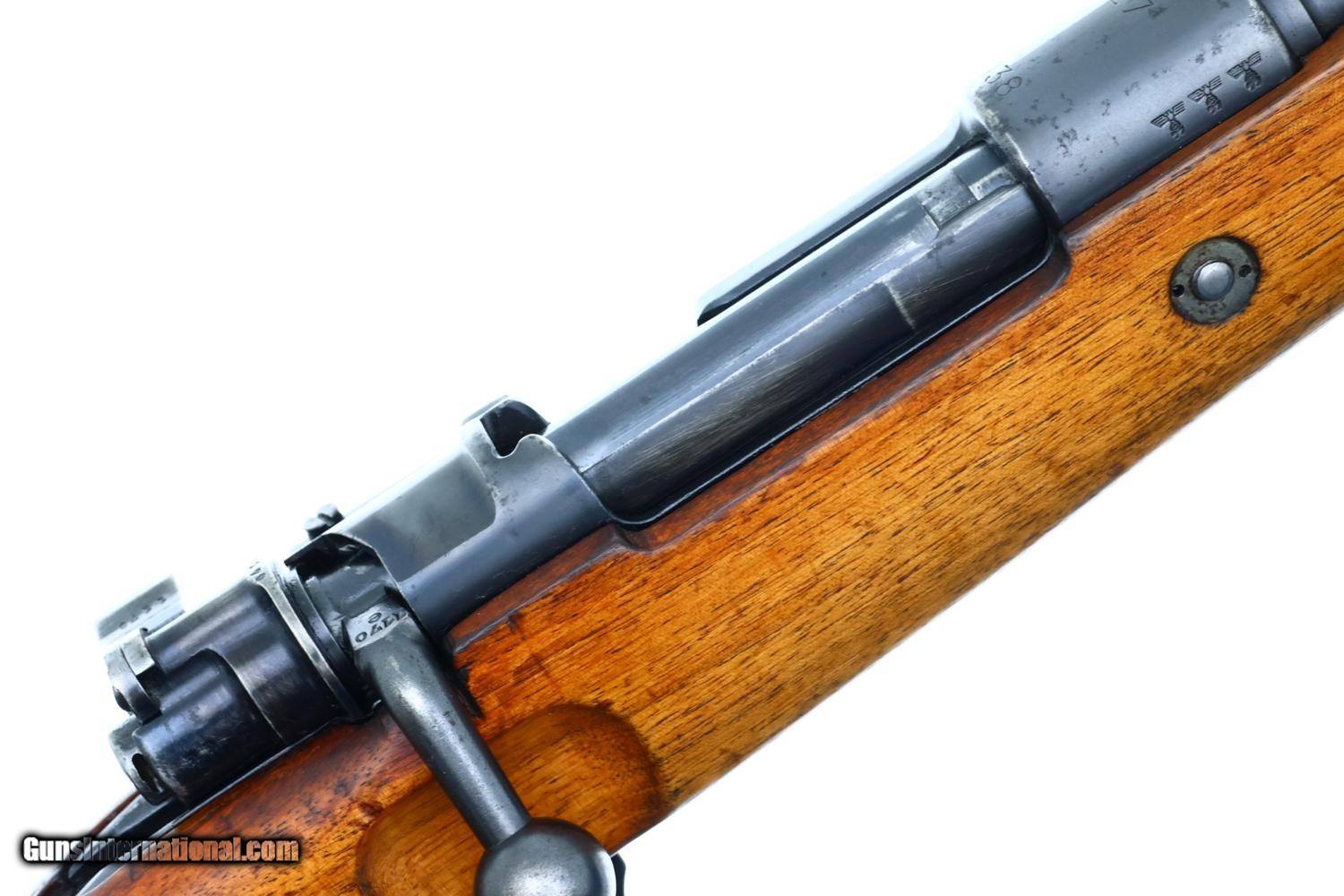 Standard configuration Mauser K98k military rifle cal 8mm made by ERMA with chamber code S/27 as used from 1935-1938, this example dated 1938, SN: 1170e, all visible serial numbers matching, with original walnut military stock, serrated ramp drift adjustable front sight and a tangent rear sight graded 1-20. Left side of the receiver marked with the full serial number and Mod. 98. A scattering of Eagle/77 acceptance markings along sides of receiver, barrel, floorplate, and stock. All parts matched to the four digits of serial number, including cleaning rod, both barrel bands, tangent sight, all components of the bolt, trigger guard assembly/floorplate, buttplate, and stock. Unmarked muzzle cap and correct sling.