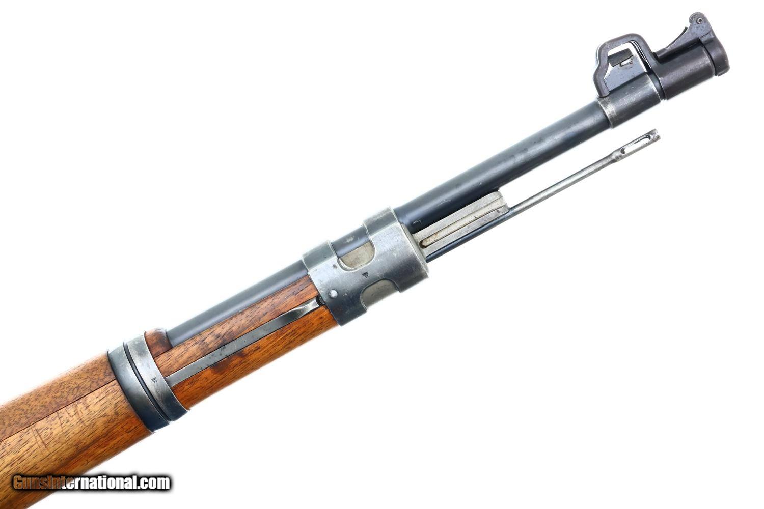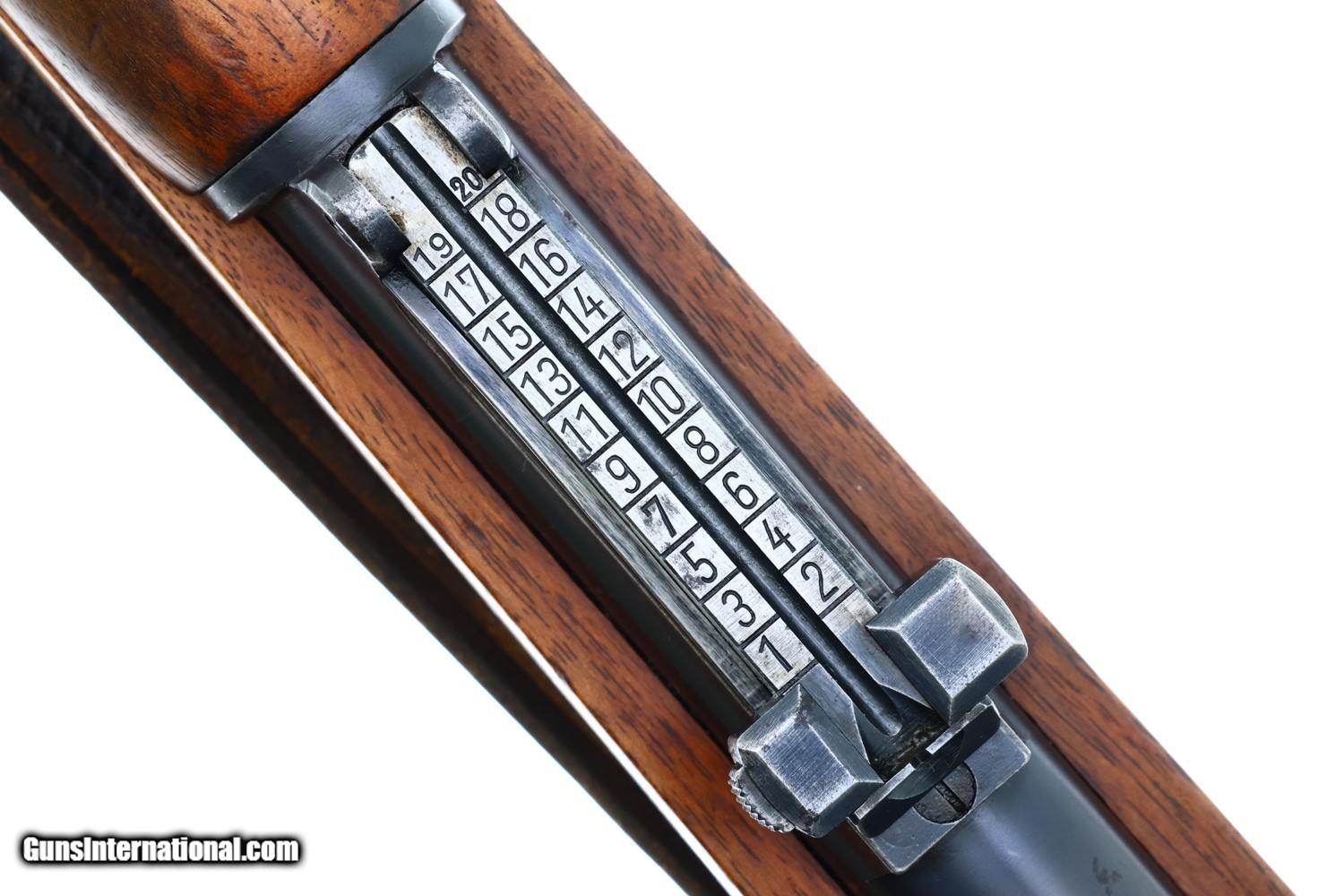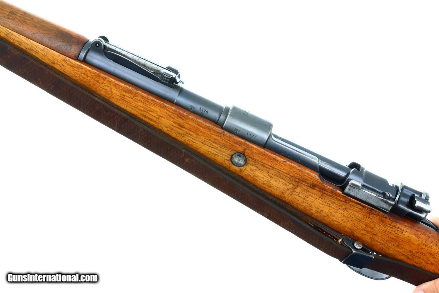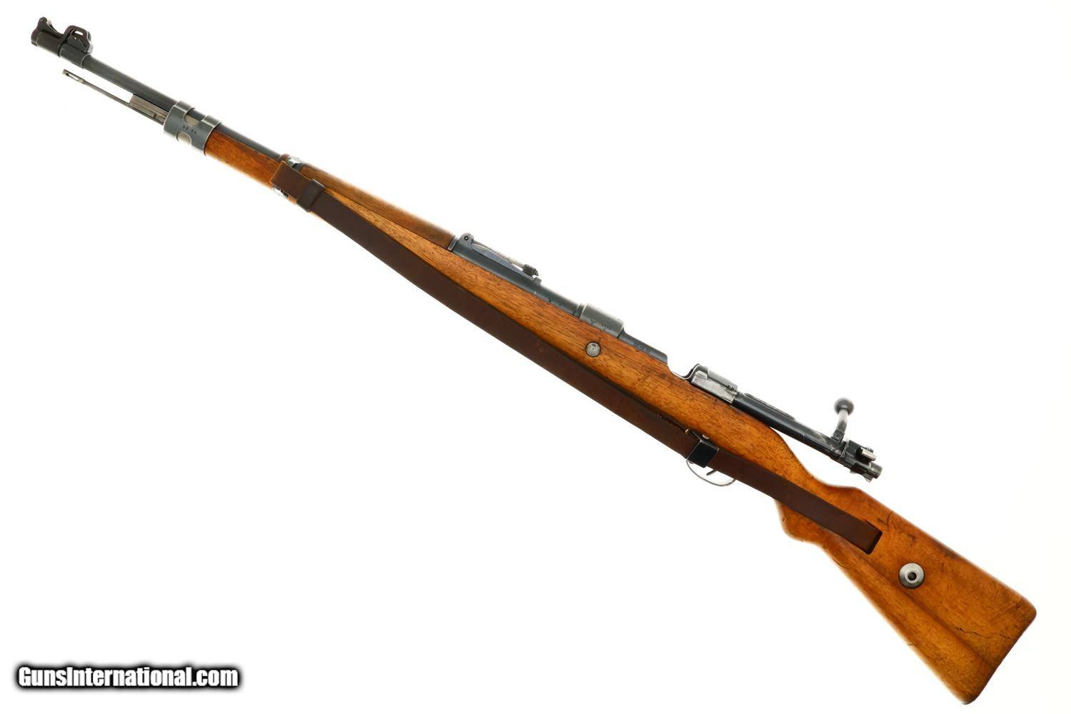 Standard configuration Mauser K98k military rifle cal 8mm made by ERMA with chamber code S/27 as used from 1935-1938, this example dated 1938, SN: 1170e, all visible serial numbers matching, with original walnut military stock, serrated ramp drift adjustable front sight and a tangent rear sight graded 1-20. Left side of the receiver marked with the full serial number and Mod. 98. A scattering of Eagle/77 acceptance markings along sides of receiver, barrel, floorplate, and stock. All parts matched to the four digits of serial number, including cleaning rod, both barrel bands, tangent sight, all components of the bolt, trigger guard assembly/floorplate, buttplate, and stock. Unmarked muzzle cap and correct sling.