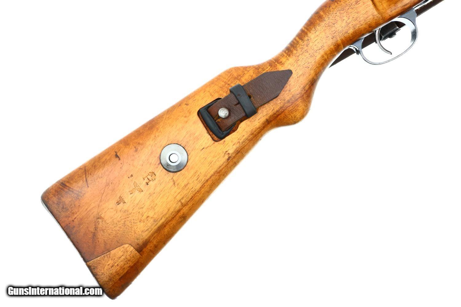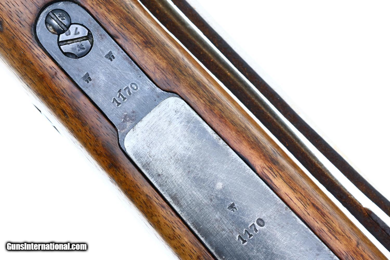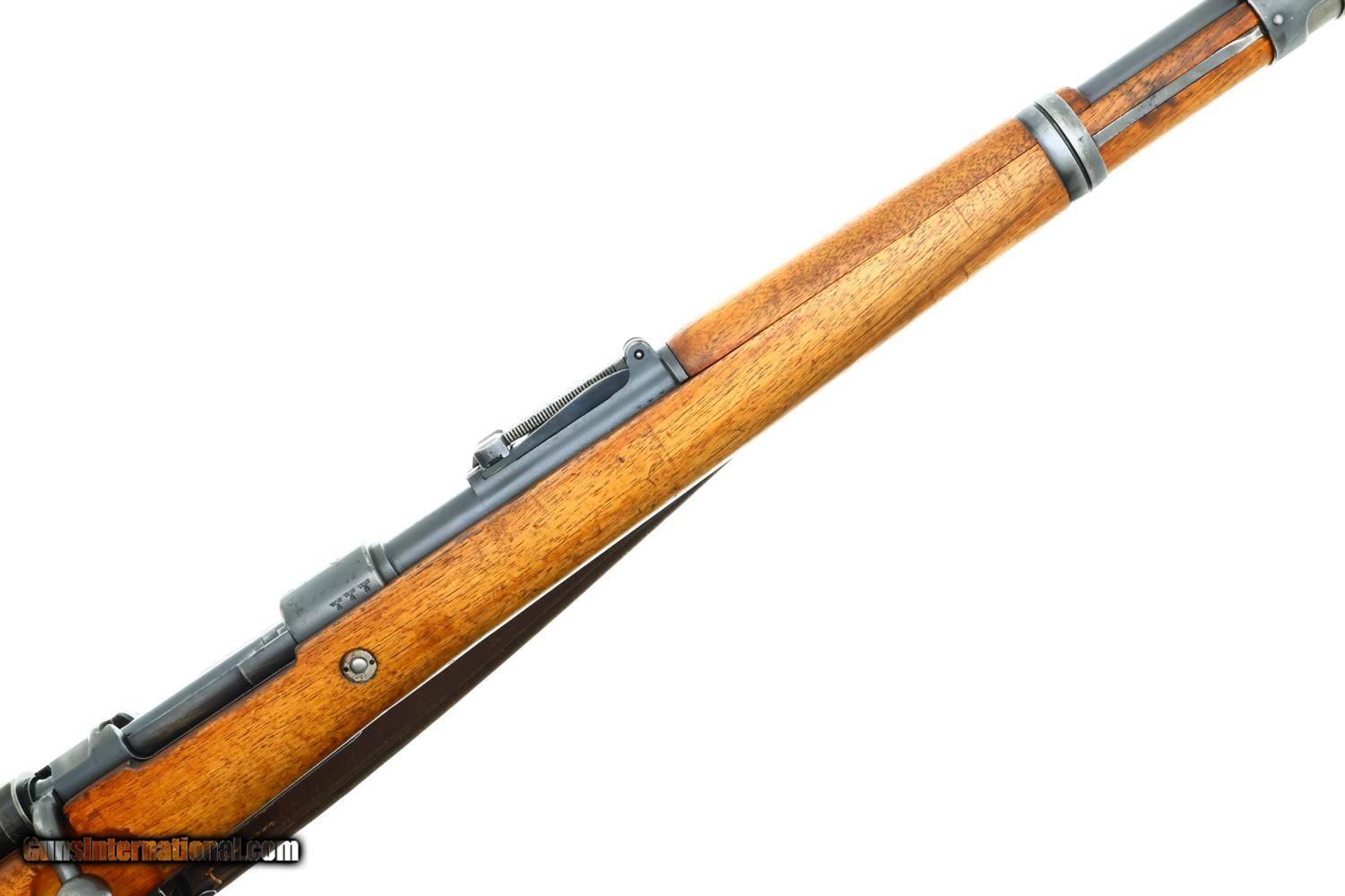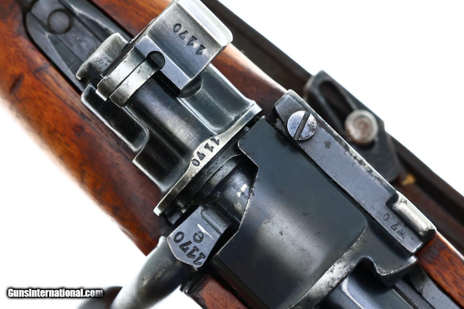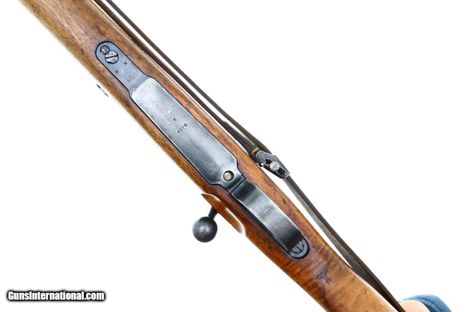 Standard configuration Mauser K98k military rifle cal 8mm made by ERMA with chamber code S/27 as used from 1935-1938, this example dated 1938, SN: 1170e, all visible serial numbers matching, with original walnut military stock, serrated ramp drift adjustable front sight and a tangent rear sight graded 1-20. Left side of the receiver marked with the full serial number and Mod. 98. A scattering of Eagle/77 acceptance markings along sides of receiver, barrel, floorplate, and stock. All parts matched to the four digits of serial number, including cleaning rod, both barrel bands, tangent sight, all components of the bolt, trigger guard assembly/floorplate, buttplate, and stock. Unmarked muzzle cap and correct sling.