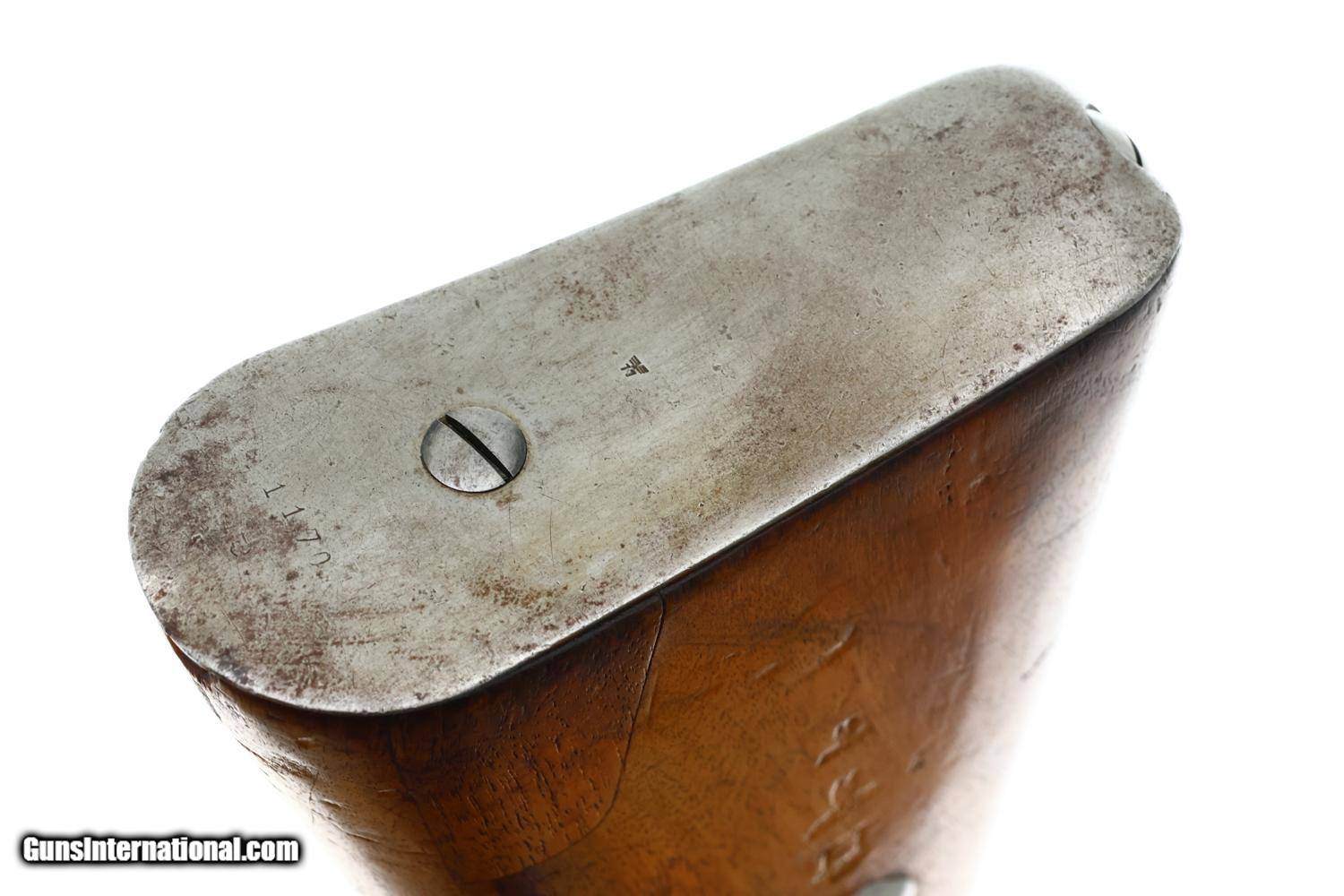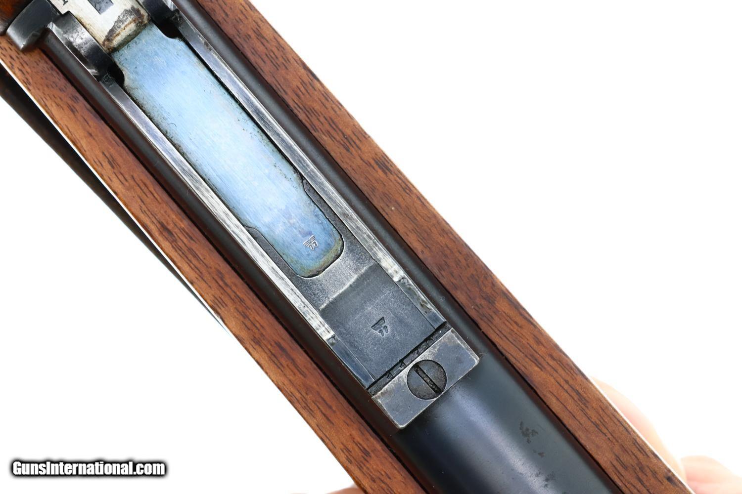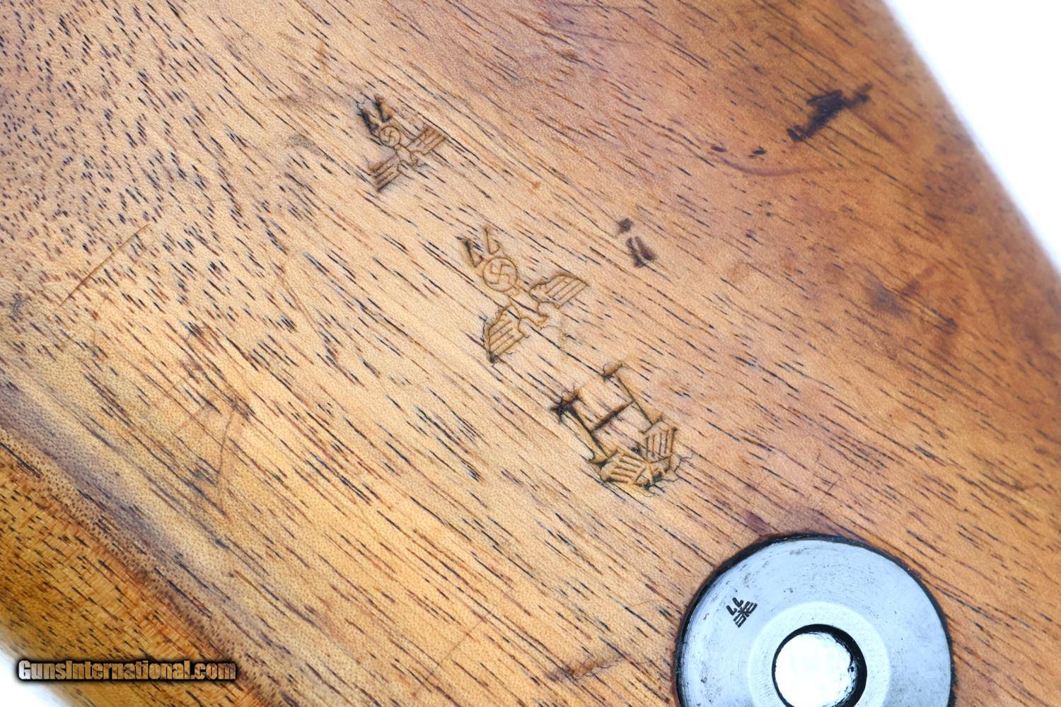 Description: Synopsis: This Erma K98k is a WWII German military bolt-action rifle made in 1938, chambered in 8mm, with all matching serial numbers, a mirror bore, and an original walnut stock, in VG+ condition. Description: Standard configuration Mauser K98k military rifle cal 8mm made by ERMA with chamber code S/27 as used from 1935-1938, this example dated 1938, SN: 1170e, all visible serial numbers matching, with original walnut military stock, serrated ramp drift adjustable front sight and a tangent rear sight graded 1-20. Left side of the receiver marked with the full serial number and Mod. 98. A scattering of Eagle/77 acceptance markings along sides of receiver, barrel, floorplate, and stock. All parts matched to the four digits of serial number, including cleaning rod, both barrel bands, tangent sight, all components of the bolt, trigger guard assembly/floorplate, buttplate, and stock. Unmarked muzzle cap and correct sling. Condition: VG+ original salt blue with sharp edge wear and thinning in usual handling locations as befitting a military rifle that saw moderate service use throughout World War II. Stock lightly sanded with old refinish, markings remaining sharp. Mirror bore with sharp rifling. Correct manual mechanics. A very nice and all matching K98k rifle with original salt blue made by ERMA in 1938 with a lightly refinished stock retaining well defined markings. SOLD Curio/Relic: Yes Manufacturer: ERMA Model: K98K Serial Number: 1170e Caliber Info: 8mm Condition: VG |