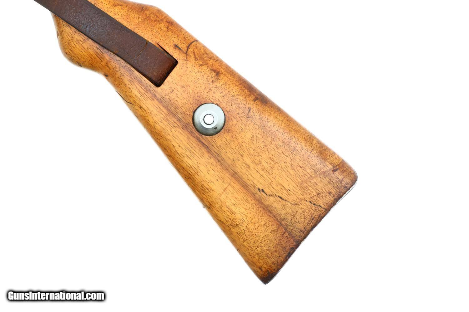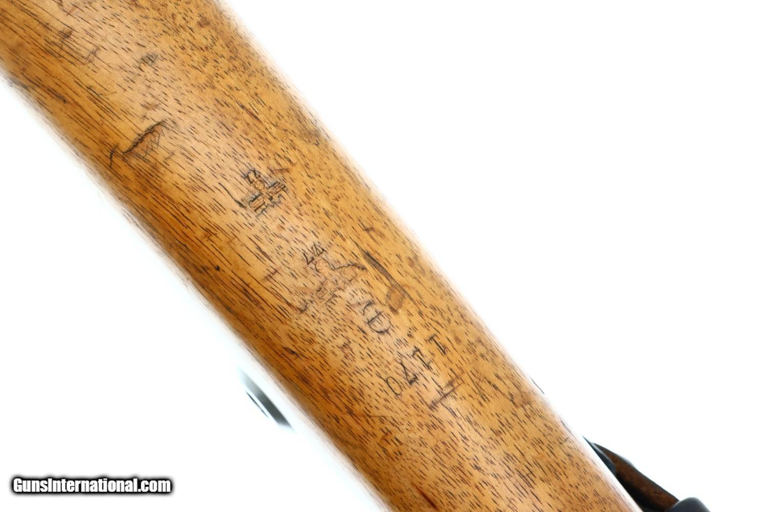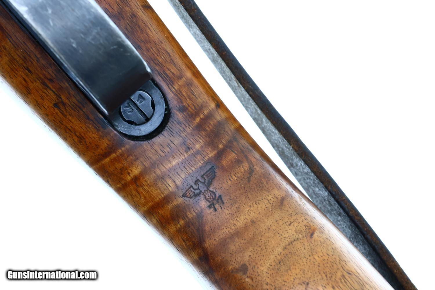Description: Synopsis: This Erma K98k is a WWII German military bolt-action rifle made in 1938, chambered in 8mm, with all matching serial numbers, a mirror bore, and an original walnut stock, in VG+ condition. Description: Standard configuration Mauser K98k military rifle cal 8mm made by ERMA with chamber code S/27 as used from 1935-1938, this example dated 1938, SN: 1170e, all visible serial numbers matching, with original walnut military stock, serrated ramp drift adjustable front sight and a tangent rear sight graded 1-20. Left side of the receiver marked with the full serial number and Mod. 98. A scattering of Eagle/77 acceptance markings along sides of receiver, barrel, floorplate, and stock. All parts matched to the four digits of serial number, including cleaning rod, both barrel bands, tangent sight, all components of the bolt, trigger guard assembly/floorplate, buttplate, and stock. Unmarked muzzle cap and correct sling. Condition: VG+ original salt blue with sharp edge wear and thinning in usual handling locations as befitting a military rifle that saw moderate service use throughout World War II. Stock lightly sanded with old refinish, markings remaining sharp. Mirror bore with sharp rifling. Correct manual mechanics. A very nice and all matching K98k rifle with original salt blue made by ERMA in 1938 with a lightly refinished stock retaining well defined markings. SOLD Curio/Relic: Yes Manufacturer: ERMA Model: K98K Serial Number: 1170e Caliber Info: 8mm Condition: VG |
