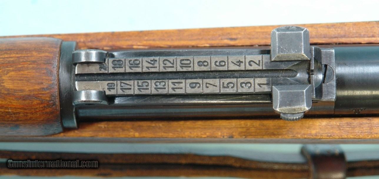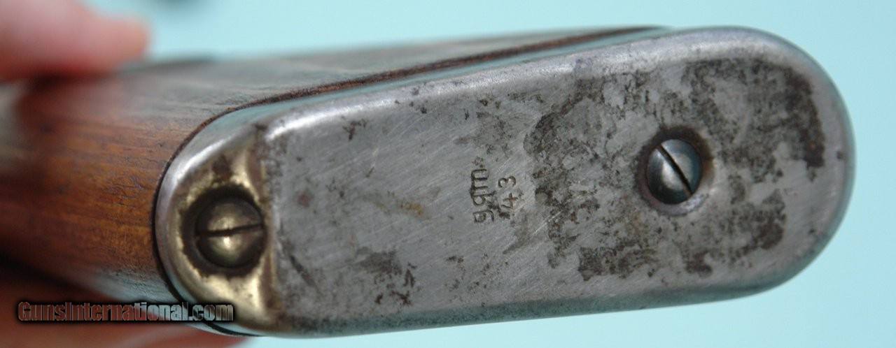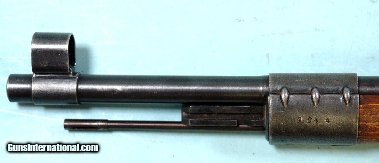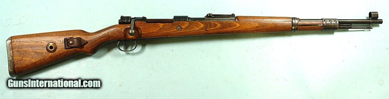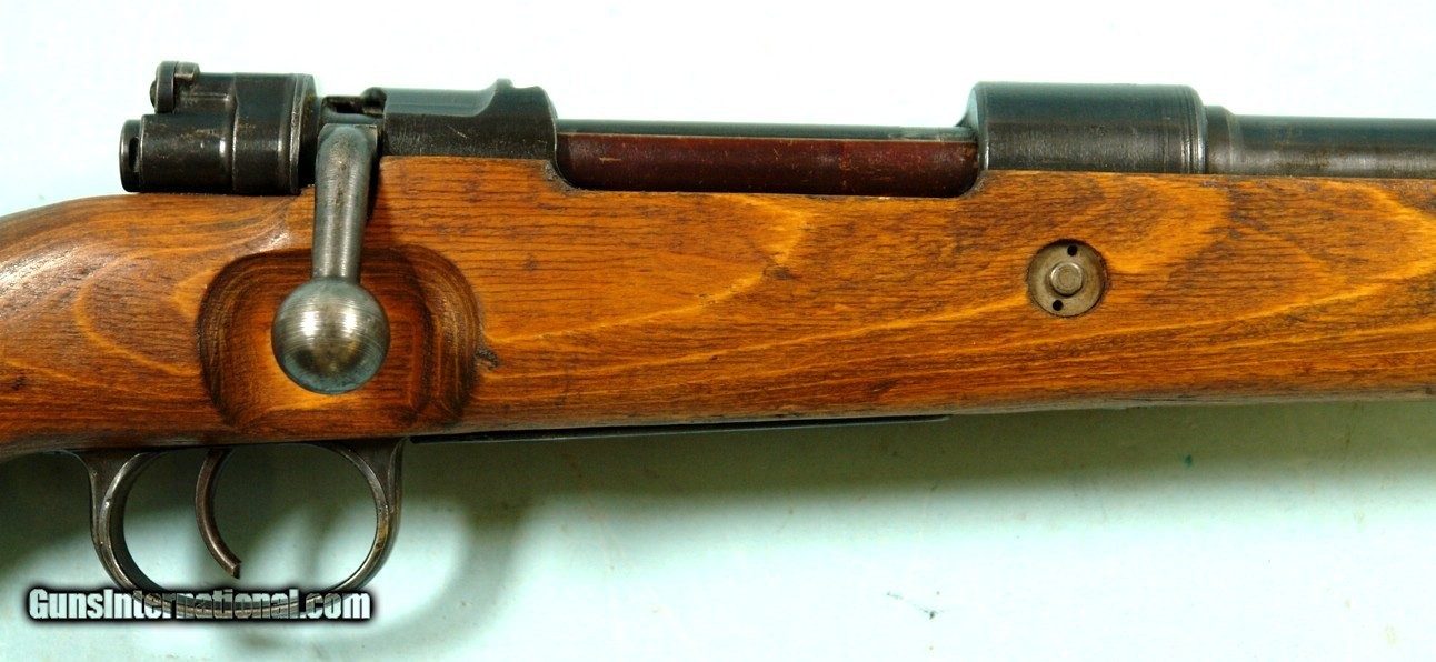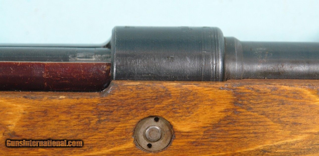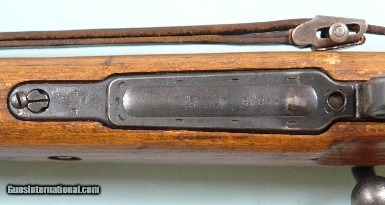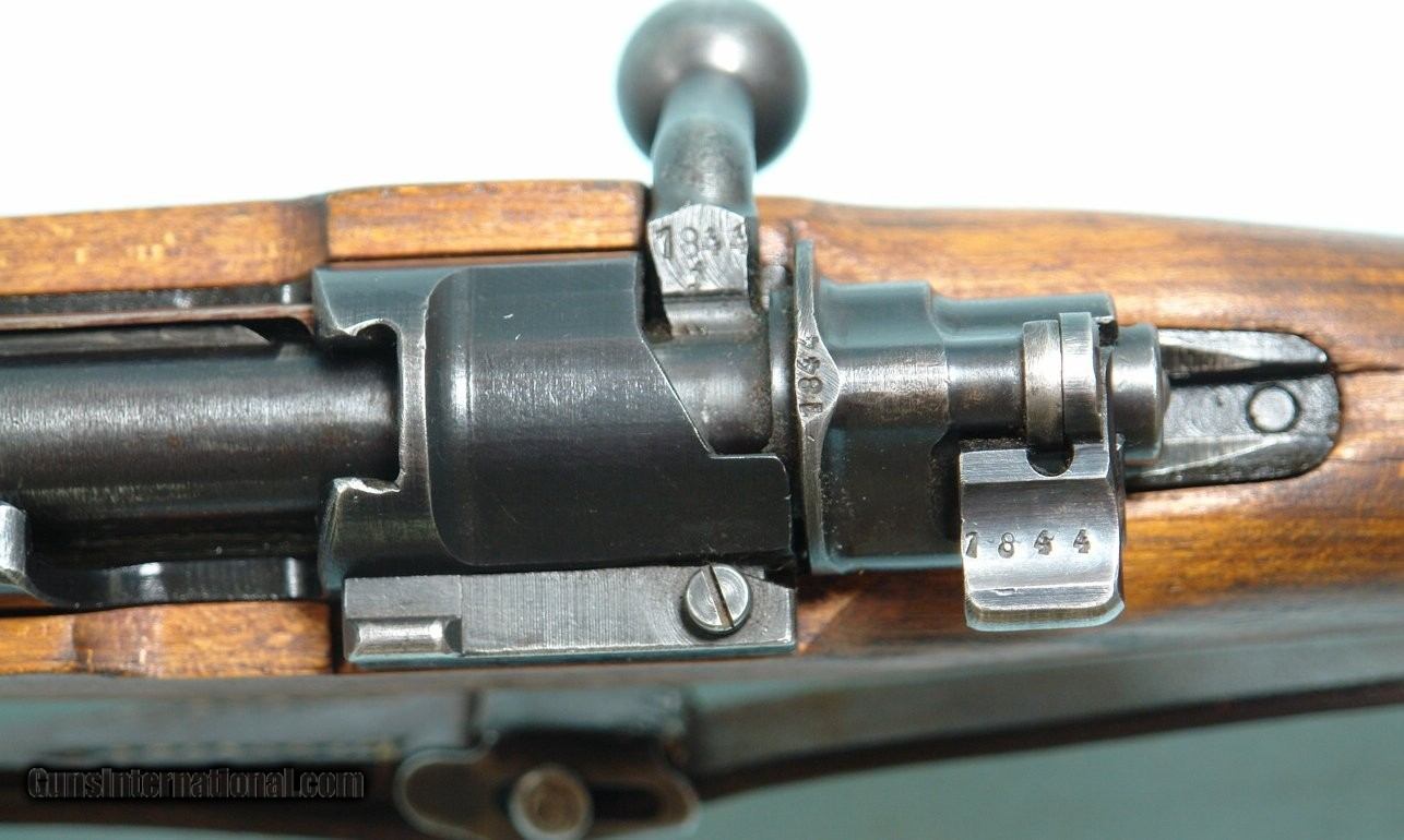 Description: 33104-EXCELLENT WW2 WWII GERMAN MAUSER BYF/44 BYF 44 K98k 8MM RIFLE W/ORIG. SLING. All original and correct and all matching in superior condition. Receiver stamped “BYF/44”. Nazi Waffenampts and “EAGLE/SWASTIKA” Ordnance acceptance stamps on receiver and barrel. Stock with matching hand guard and with Waffenampt stamp behind trigger guard. Has seen only very well cared use with 99% original arsenal military black finish. Wood with original finish as well. Bright bore with sharp rifling. Original sling and cleaning rod. No import stamps. Exceptional all correct and original example. $3900. Curio/Relic: Yes Rifle Caliber: 7.92x57mm Mauser Price: $3,900.00 Contact Seller |