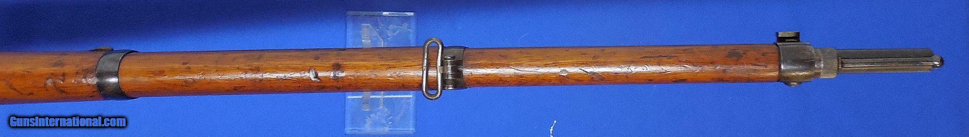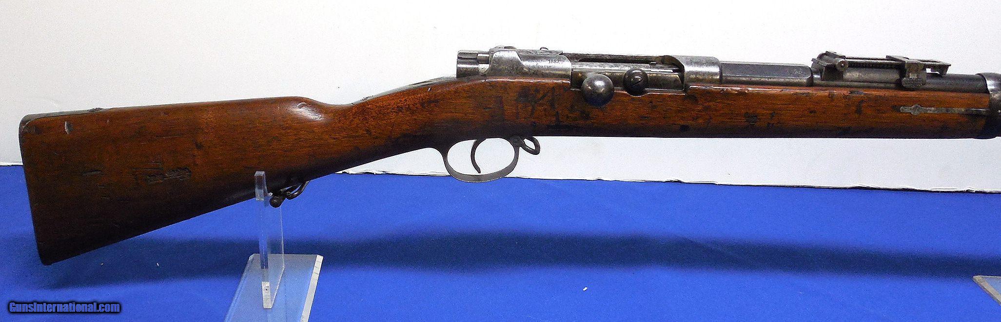 Description: German Model 1871/84 Rifle, made by SPANDAU, serial # 8242, cal. 11mm , 31 1/2 barrel with a very good bright bore, this 1887 dated rifle with receiver graying and a good amount of original blue on the barrel, matching numbered bolt is still somewhat bright along the body, handle and cocking-piece, walnut stock is in very good condition with the cartouches and stamps still crisp and clear and exhibits scattered small handling marks and minor blemishes under its military oil finish, the butt plate has some minor surface oxidation, rifle is unit marked on the upper buttplate G.S.R. / 226.. This rifle is matching except for the forward band and two trigger screws that are on its receiver under the wood. Overall this is a good plus plus - very good example of a Mauser 71/84 and would make a nice addition to any Military Collection. Inv.: # 22-176 SOLD Antique: Yes |