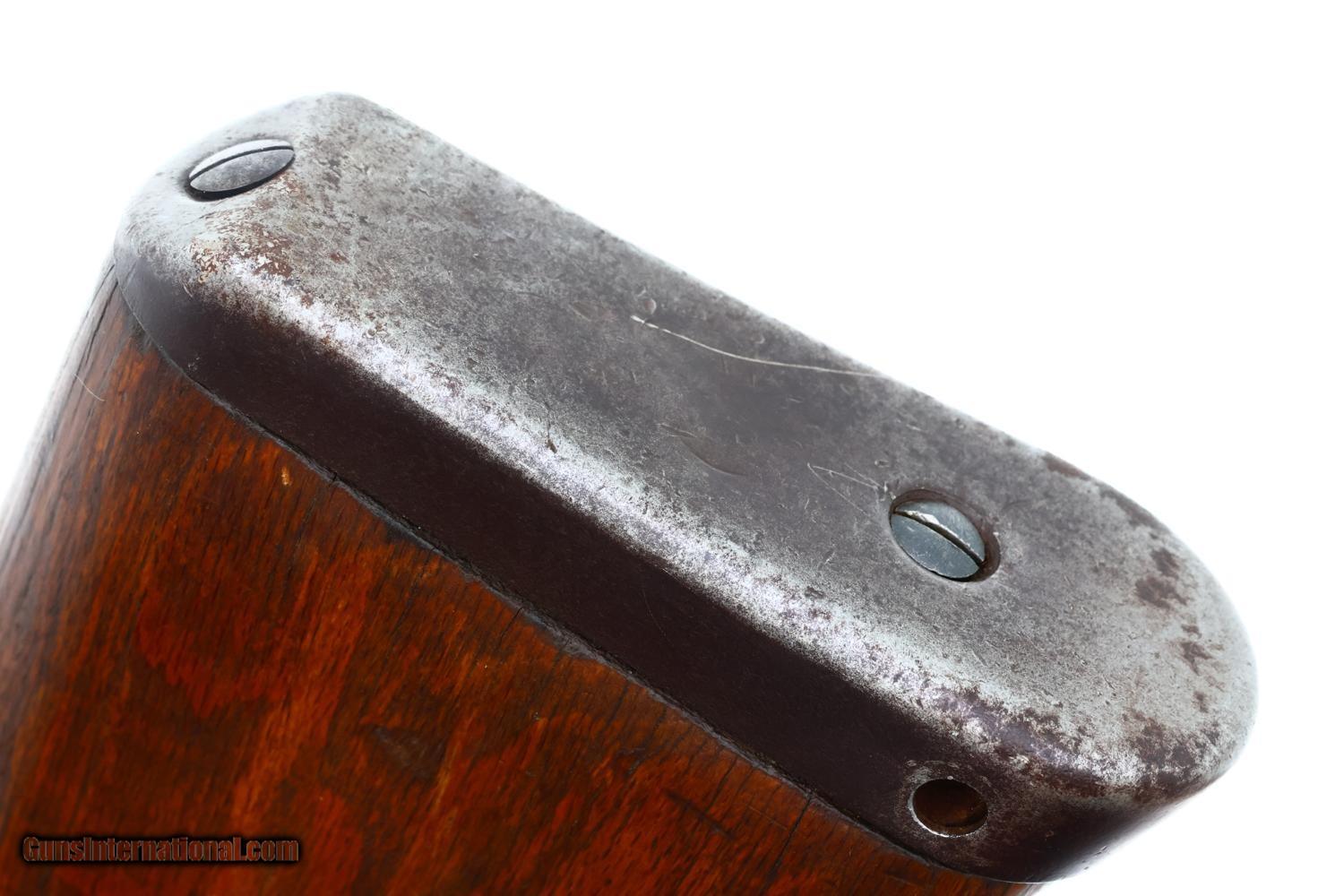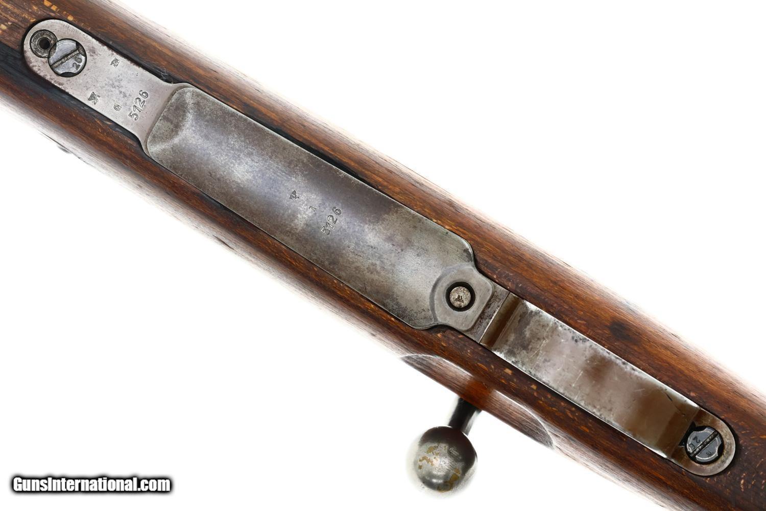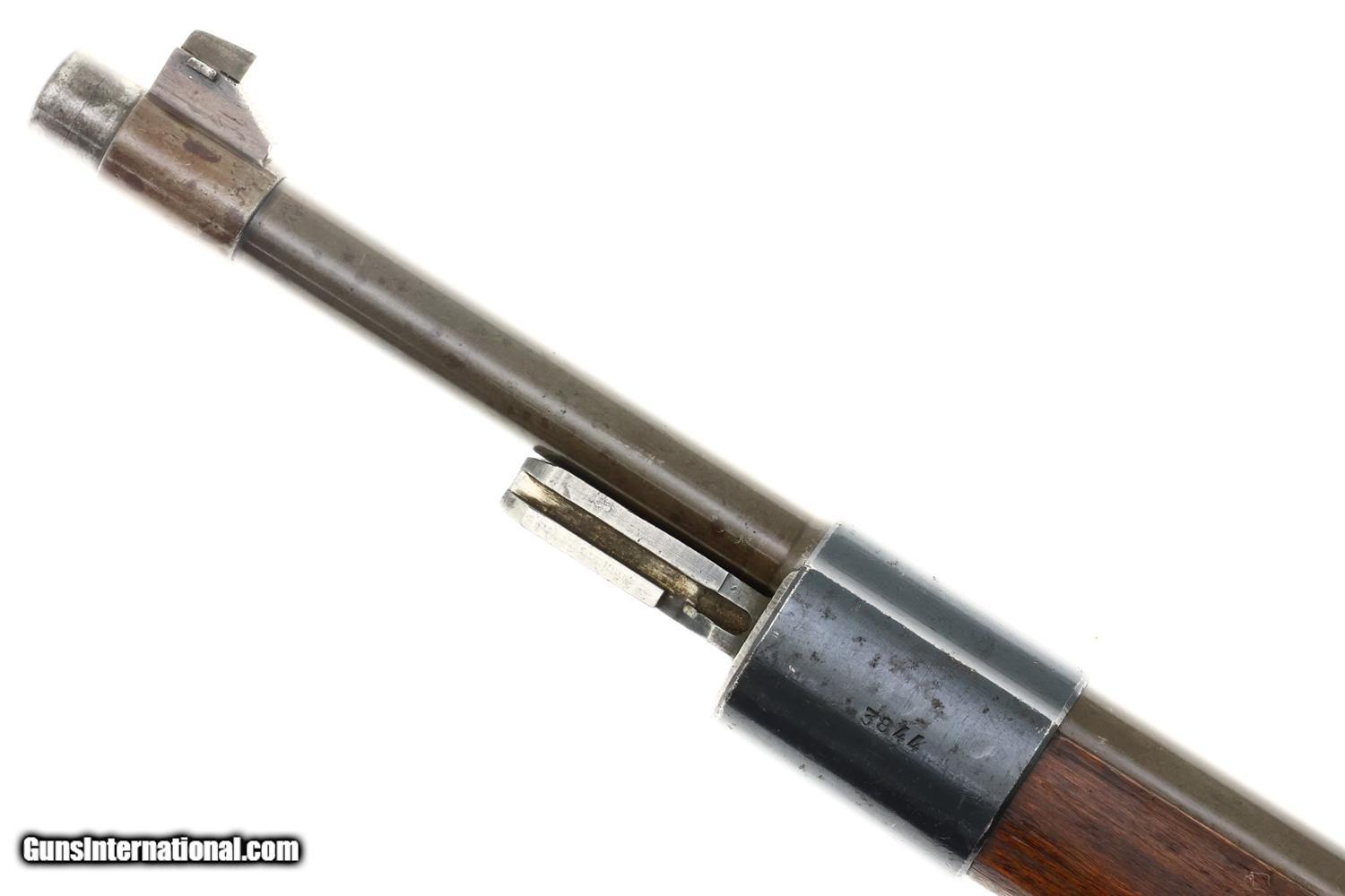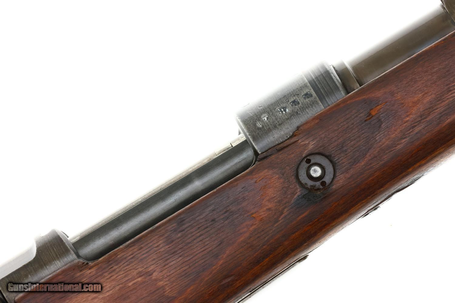 As one of the primary producers of the Karabiner 98k, the Gustloff Werke plant in Weimar supplied large quantities of rifles to the German military during WWII. This rifle was manufactured with the "337" chamber code in 1940, cal. 7.92x57 Mauser, SN: 5126i, now reworked with several mismatched parts. Standard military configuration with drift adjustable front sight set on a serrated ramp and tangent rear sight graduated 1-20. Receiver is marked “337” over “1940” Left side of barrel and receiver ring numbered: 5126i with matching numbers on rear sight/cursor, trigger guard, magazine floorplate, the last two digits on the magazine follower and various screws. Bolt handle numbered "126" in large, shallow numerals. Forward barrel band "3844", second band of sheet metal "9905", unnumbered bayonet lug, safety lever "3950", bolt head with an electropenciled "83". Finely laminated handguard and stock, the latter externally unmarked and without disassembly disc. The cupped buttplate with a third transverse bolt hole near toe.