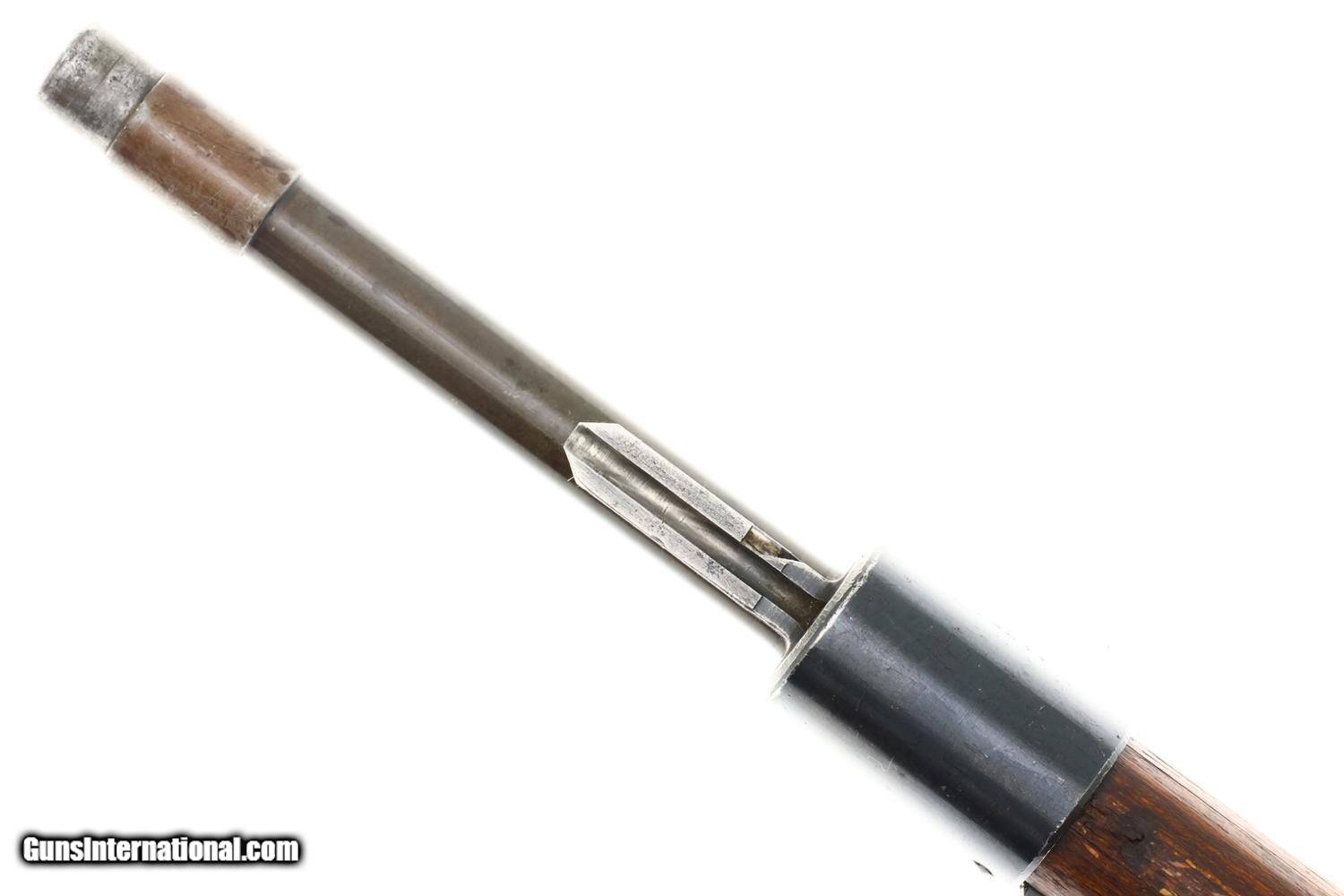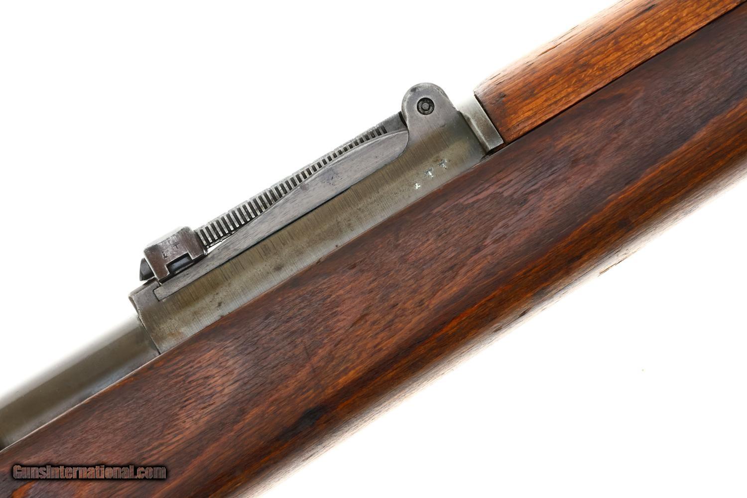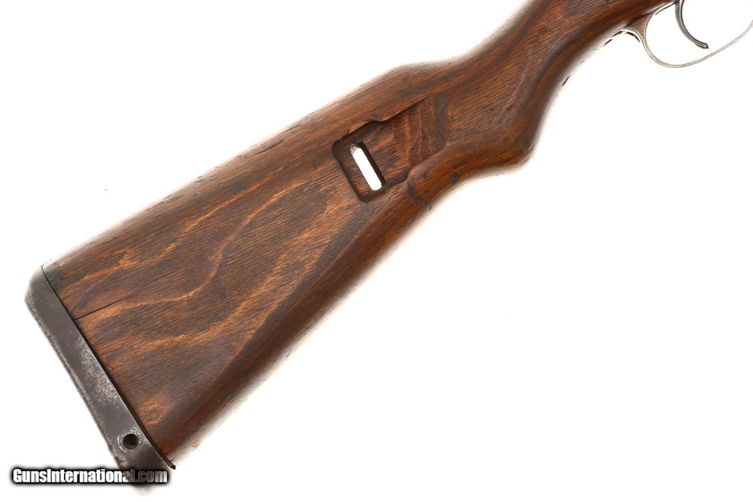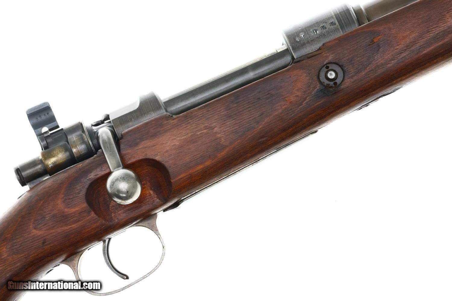 As one of the primary producers of the Karabiner 98k, the Gustloff Werke plant in Weimar supplied large quantities of rifles to the German military during WWII. This rifle was manufactured with the "337" chamber code in 1940, cal. 7.92x57 Mauser, SN: 5126i, now reworked with several mismatched parts. Standard military configuration with drift adjustable front sight set on a serrated ramp and tangent rear sight graduated 1-20. Receiver is marked “337” over “1940” Left side of barrel and receiver ring numbered: 5126i with matching numbers on rear sight/cursor, trigger guard, magazine floorplate, the last two digits on the magazine follower and various screws. Bolt handle numbered "126" in large, shallow numerals. Forward barrel band "3844", second band of sheet metal "9905", unnumbered bayonet lug, safety lever "3950", bolt head with an electropenciled "83". Finely laminated handguard and stock, the latter externally unmarked and without disassembly disc. The cupped buttplate with a third transverse bolt hole near toe.