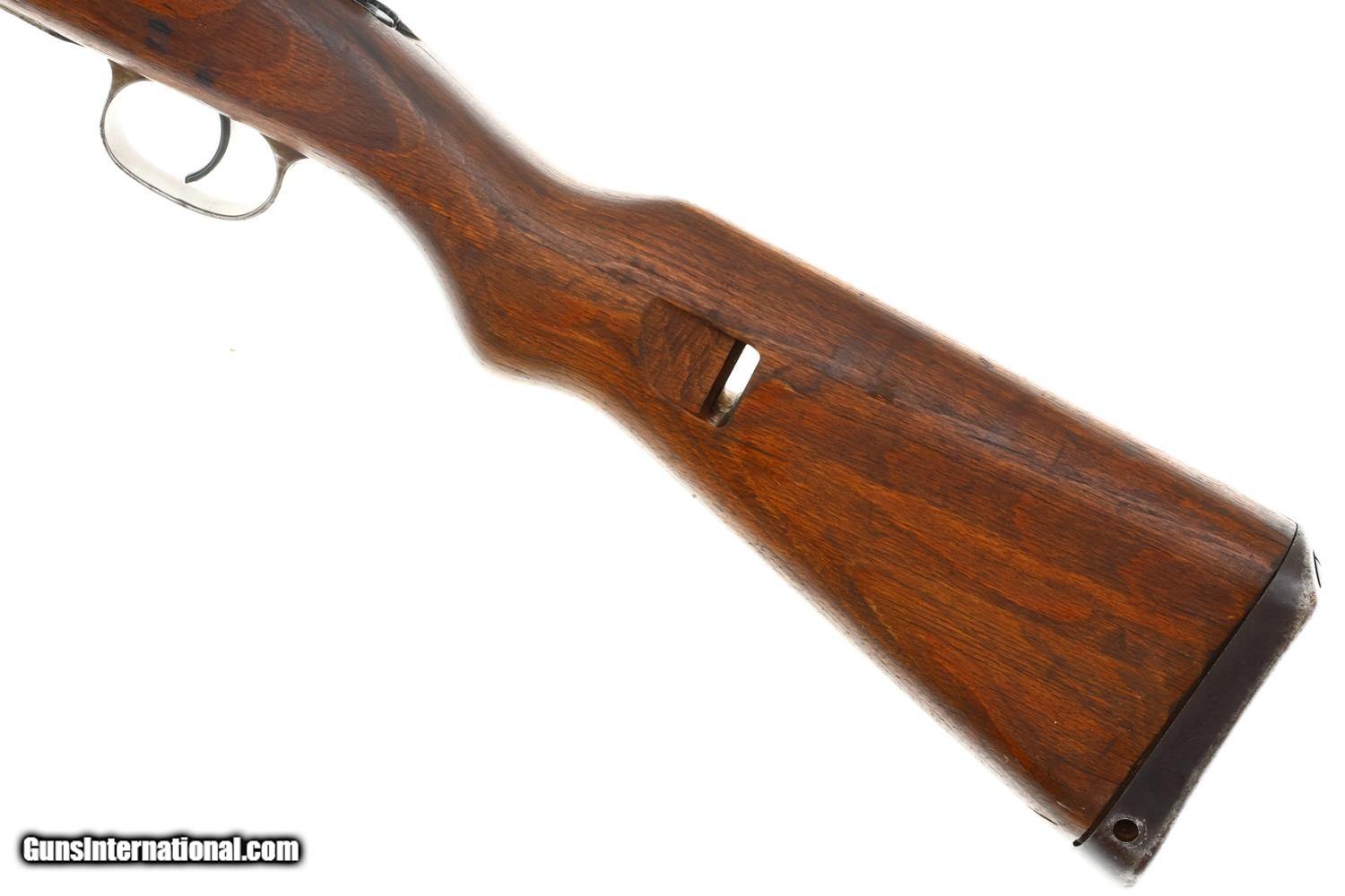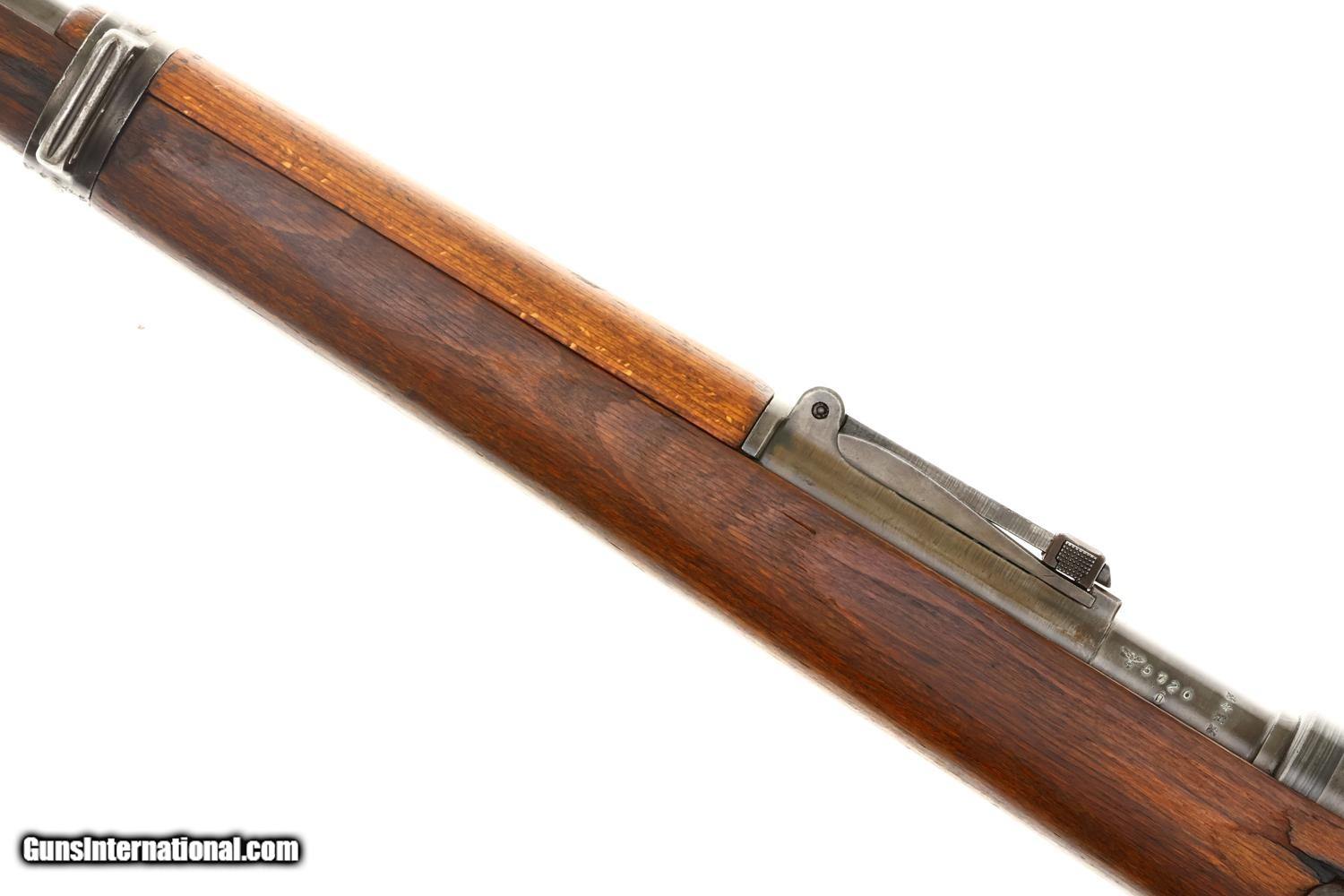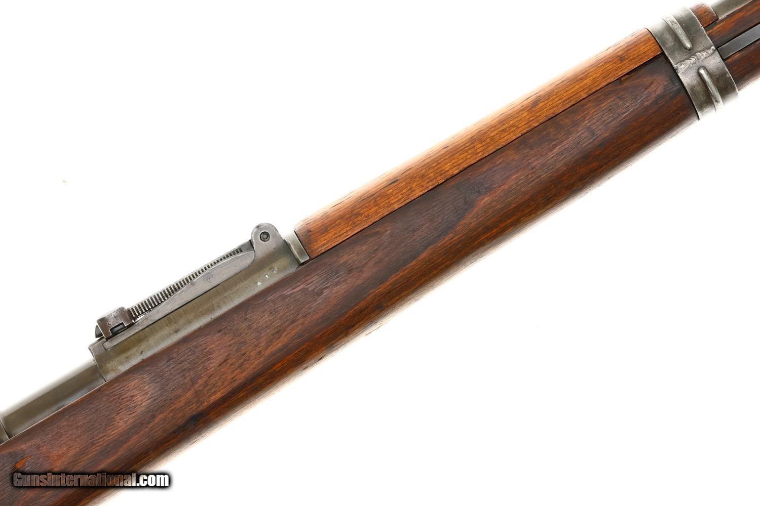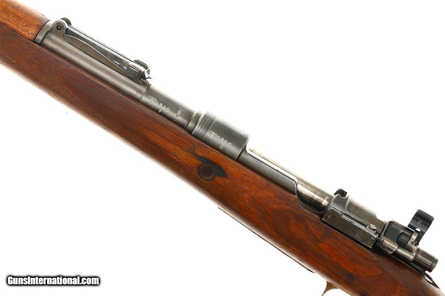 As one of the primary producers of the Karabiner 98k, the Gustloff Werke plant in Weimar supplied large quantities of rifles to the German military during WWII. This rifle was manufactured with the "337" chamber code in 1940, cal. 7.92x57 Mauser, SN: 5126i, now reworked with several mismatched parts. Standard military configuration with drift adjustable front sight set on a serrated ramp and tangent rear sight graduated 1-20. Receiver is marked “337” over “1940” Left side of barrel and receiver ring numbered: 5126i with matching numbers on rear sight/cursor, trigger guard, magazine floorplate, the last two digits on the magazine follower and various screws. Bolt handle numbered "126" in large, shallow numerals. Forward barrel band "3844", second band of sheet metal "9905", unnumbered bayonet lug, safety lever "3950", bolt head with an electropenciled "83". Finely laminated handguard and stock, the latter externally unmarked and without disassembly disc. The cupped buttplate with a third transverse bolt hole near toe.