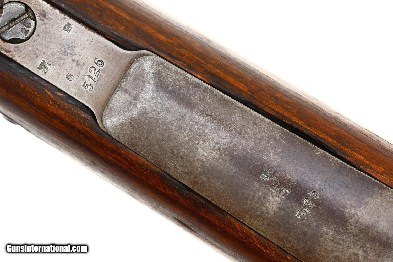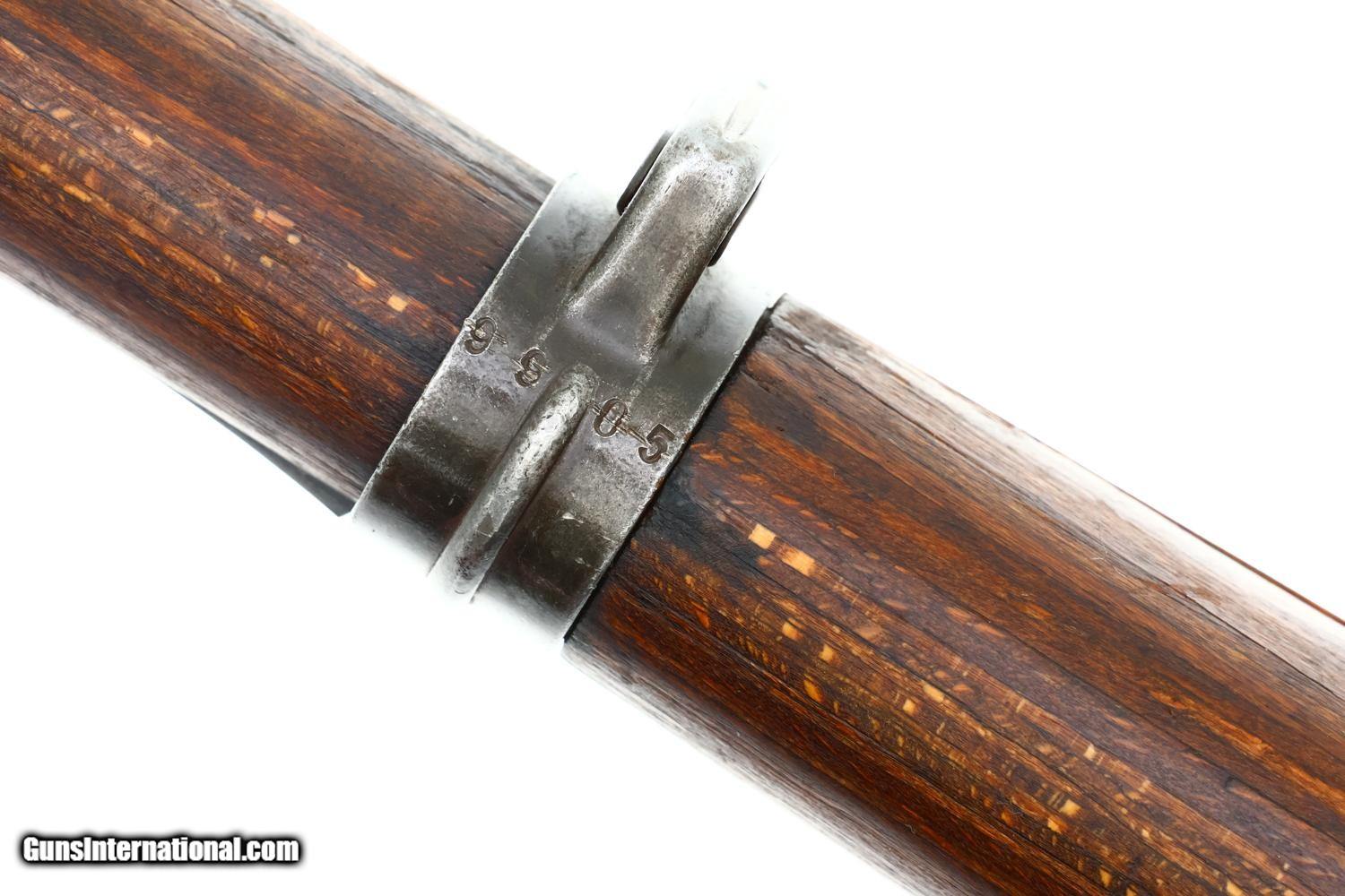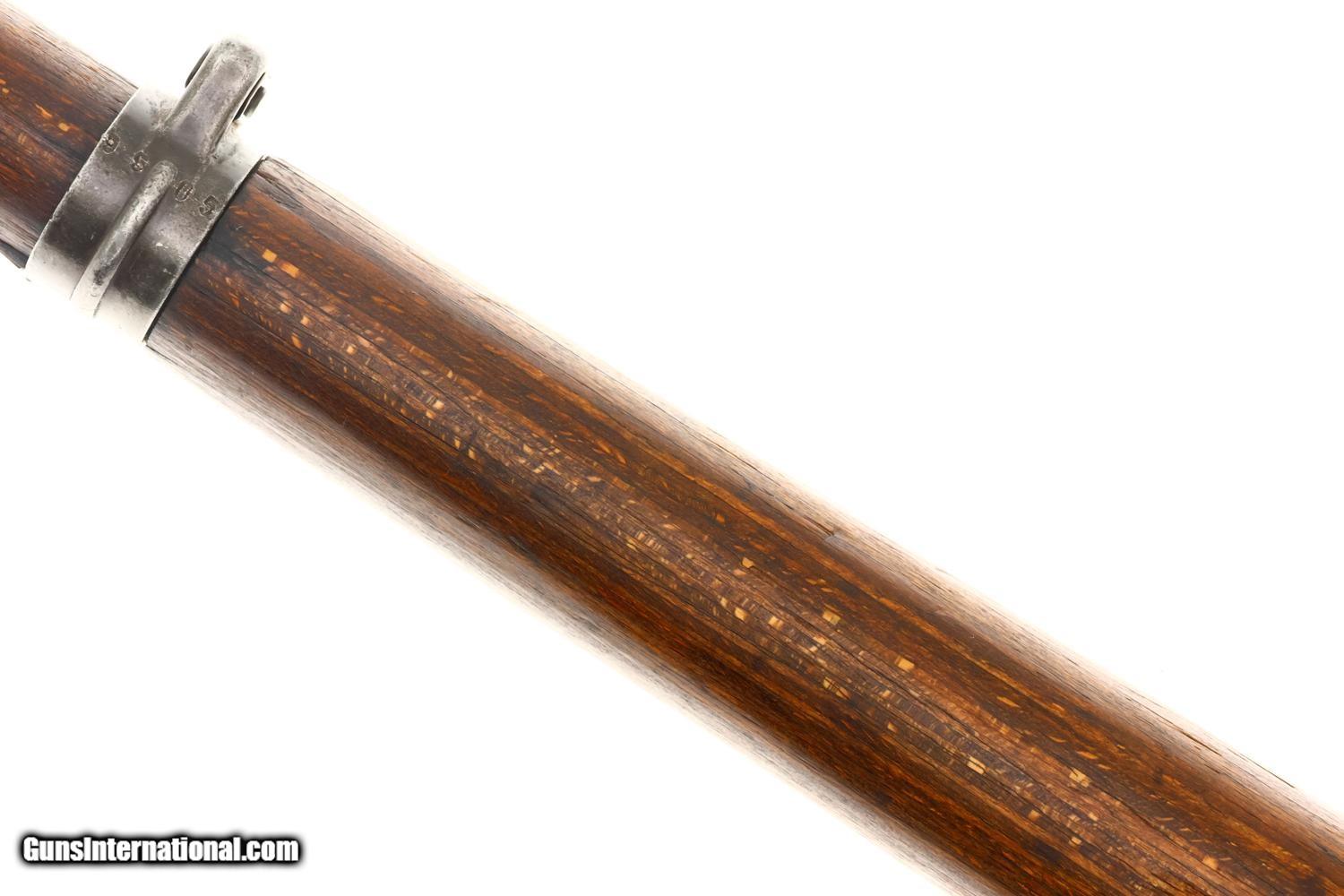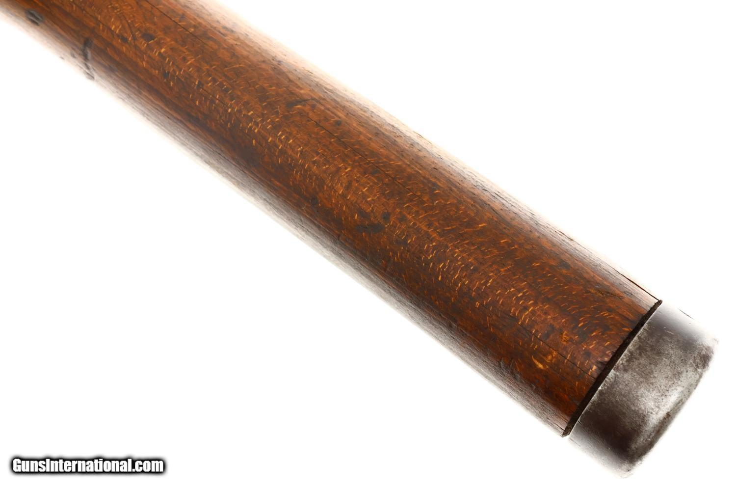 Generously G with finish having faded to blue/grey/ brown and the rebuild reflected by many mismatched/unnumbered parts and a missing retaining screw in the forward trigger guard. Laminated stock has been sanded with laminated cracking on the left side near the reinforcing bolt. No cleaning rod. Cupped buttplate secure but ill-fitting with transverse hole near toe as previously mentioned. Bright bore with sharp rifling. Correct manual mechanics. Scarce chamber code but gets a "D-" for serious collectability.
