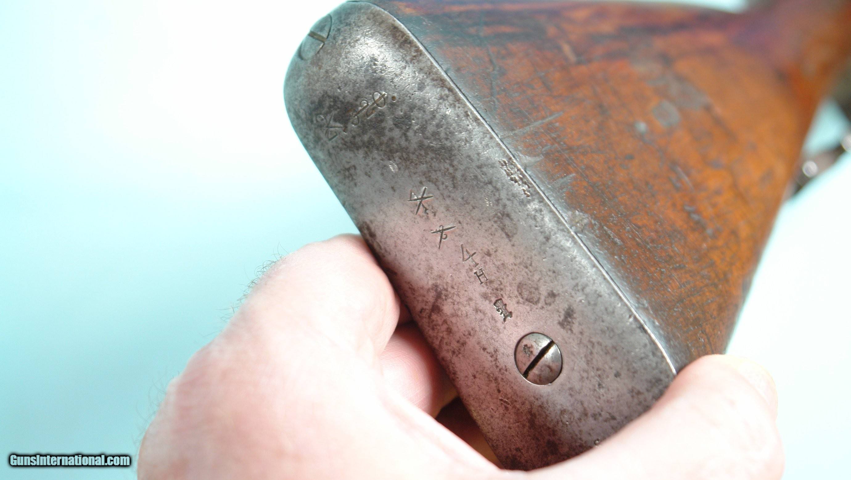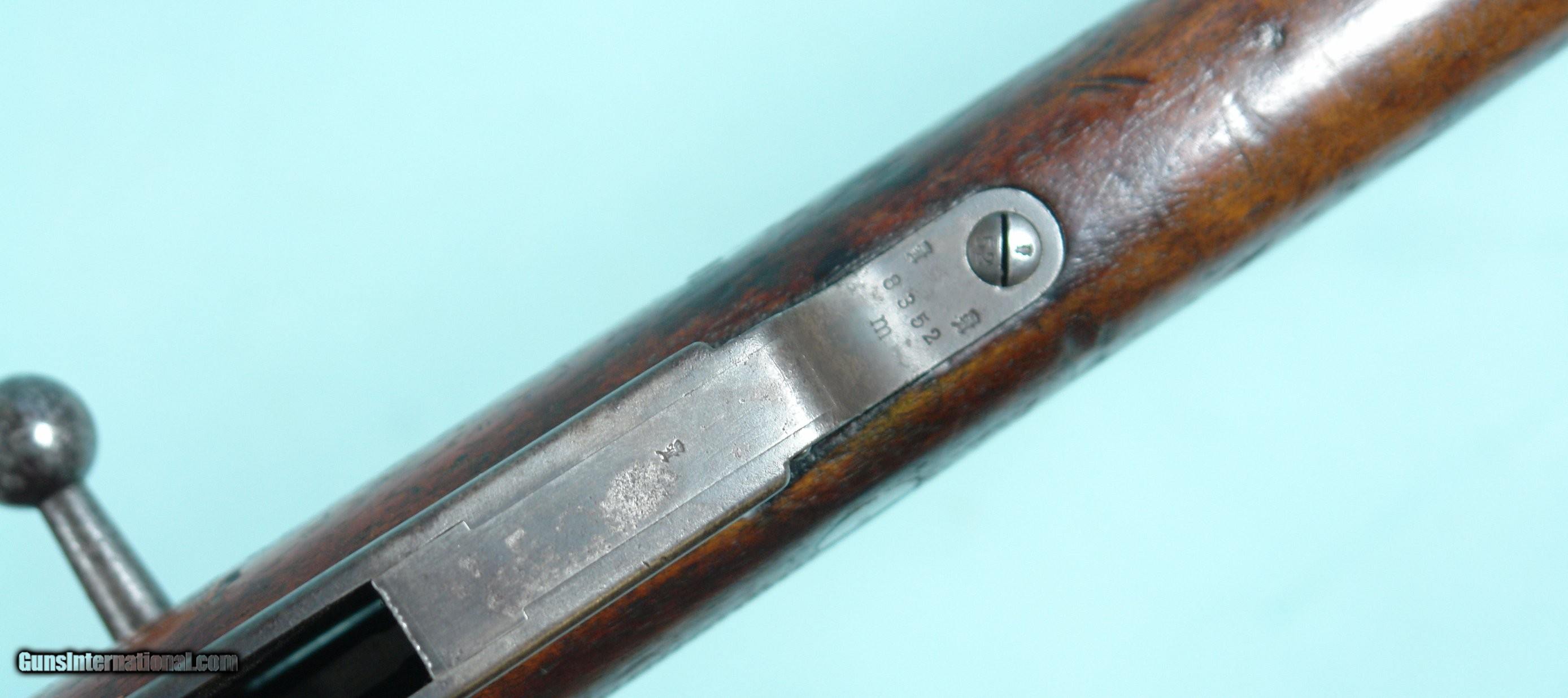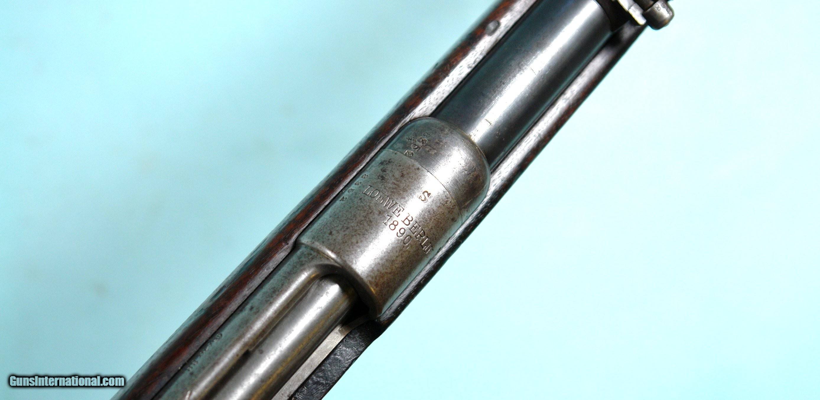 Description: 32271-IMPERIAL GERMAN LOEWE / BERLIN MAUSER GEW 88 G88 8MM INFANTRY COMMISSION RIFLE DATED 1890. 29 ½” barrel. All original and matching. Receiver ring stamped ‘LOEWE BERLIN/1890”. Imperial German proofs on all major parts. Very good to fine overall with approximately 90% original blue. Original wood finish. Shows use overall but superior to most we have seen. Perfect working order and excellent plus bright bore with very sharp rifling. $1100. SOLD Antique: Yes Rifle Caliber: 7.92x57mm Mauser |