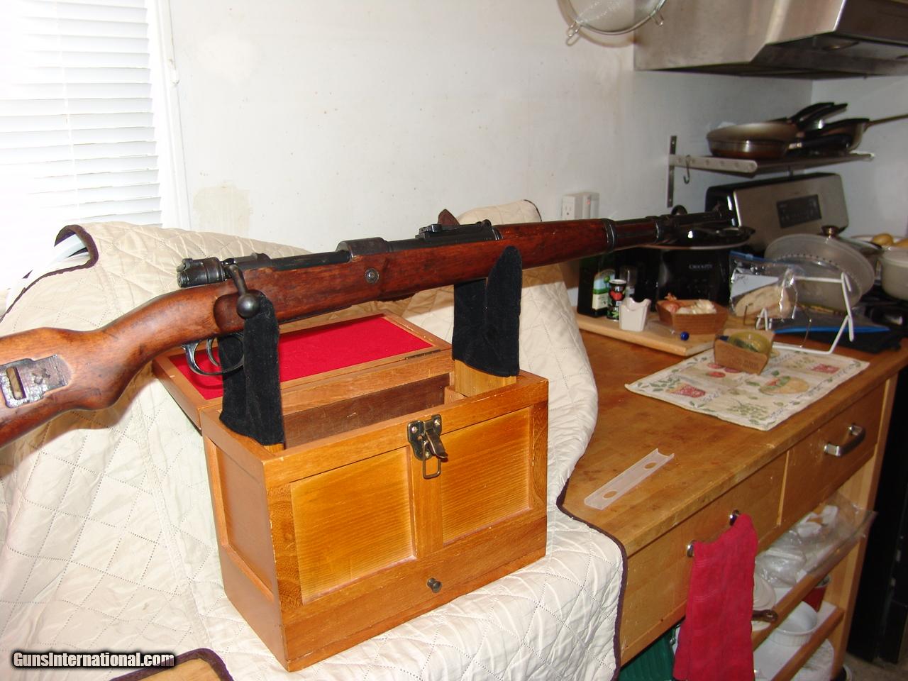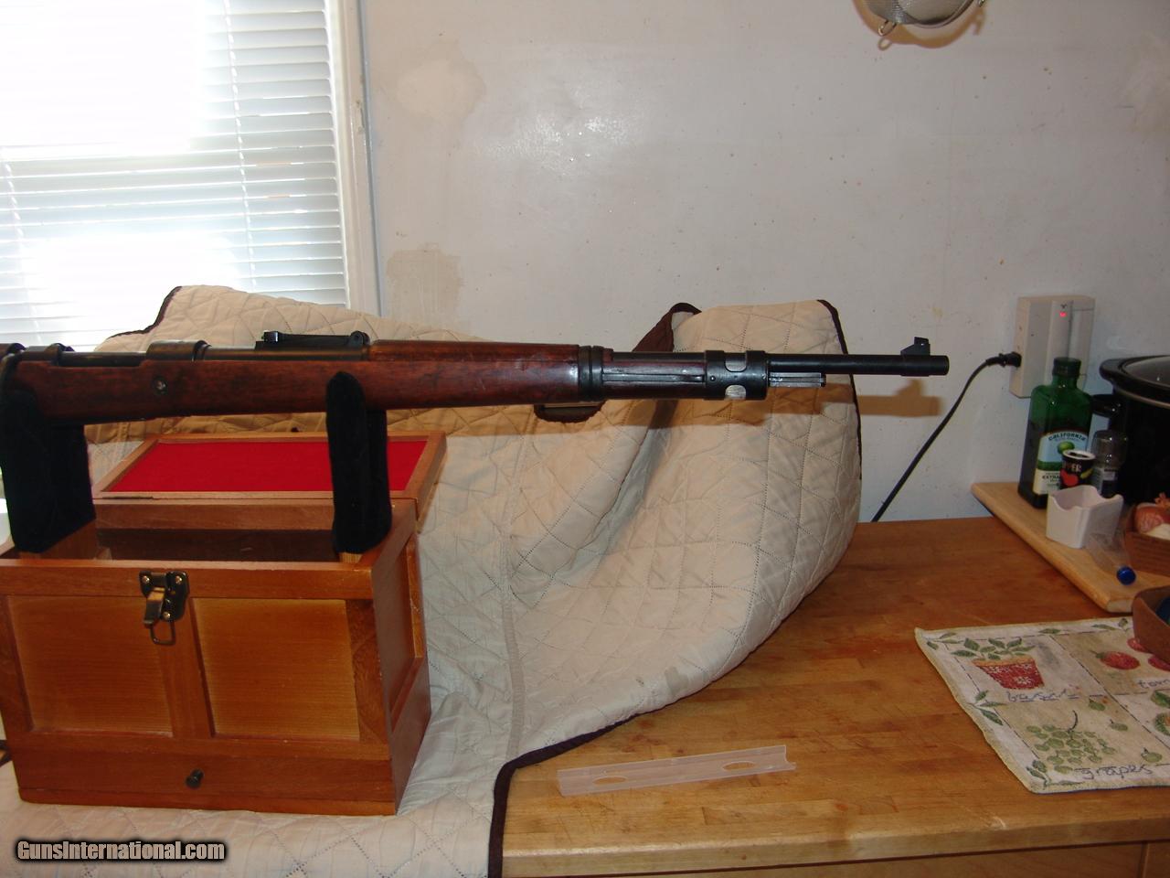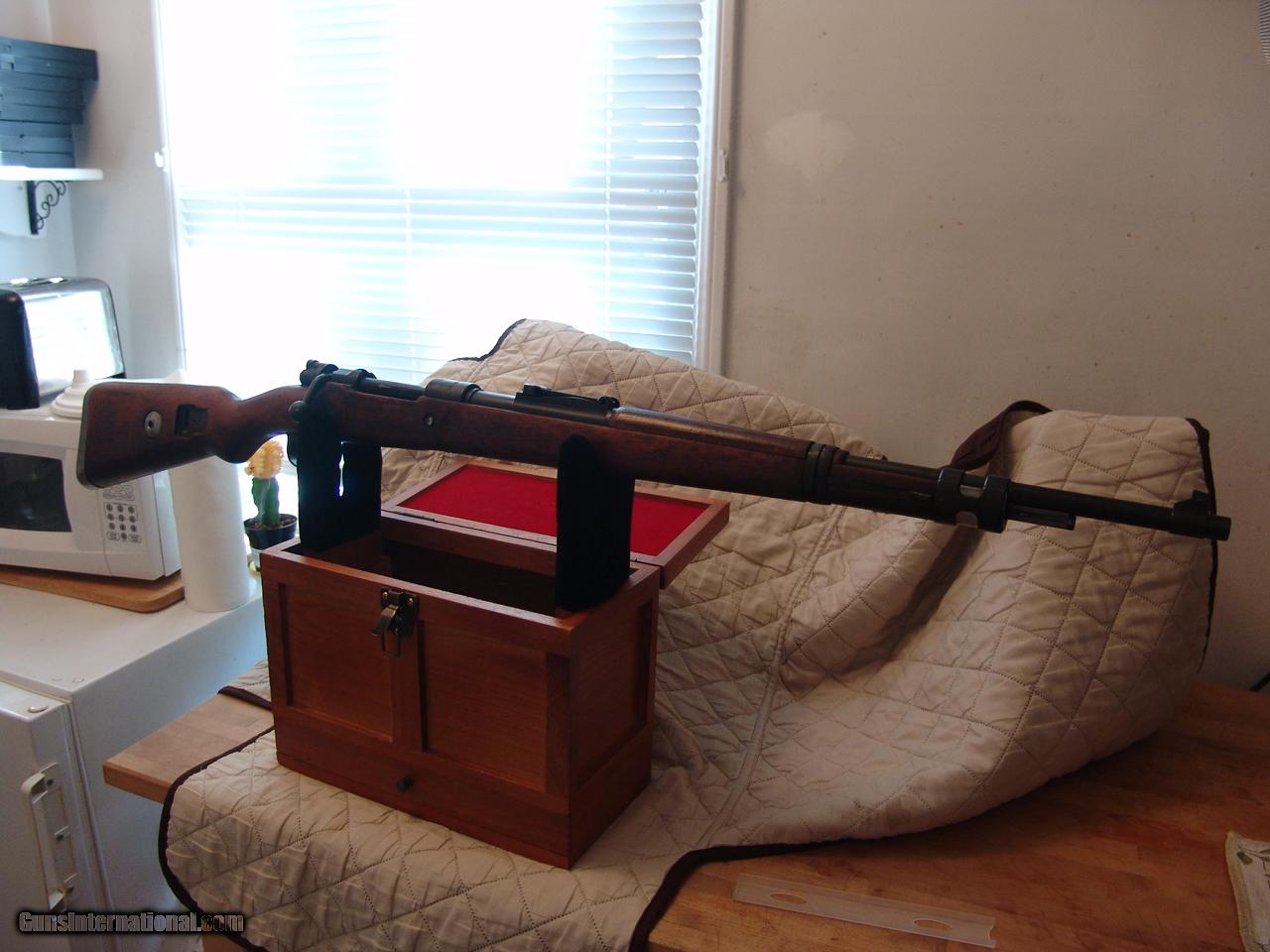 Description: Ok, these rifles were not owned by Hitler or any other famous person. They are just lovely shooters. They have been in storage for 50 years. So there is no secret value or infamous history with them. They are simply what you see and what you get. Charlie Manson did not autograph them !!!!!!!!! 1937 S/243 German Mauser with barrel and receiver matching numbers. Excellent condition through out with three possible bird figures stamped on the right side. SOLD Curio/Relic: Yes Caliber Info: 8mm Bore: excellent Condition: Very Good Metal Condition: very good Wood Condition: very good Bore Condition: excellent |