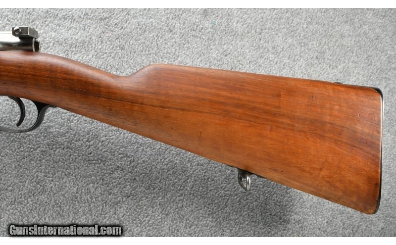 Description: The 1891 Argentine Mauser is a beautifully made rifle and the 7.65x53mm cartridge is a first-generation smokeless, rimless, bottleneck rifle cartridge developed in 1889. Cases can easily be formed from .30-06 brass for reloading 7.65x53mm Mauser SOLD Chambers: 7.65x53mm Argentine in a five round box magazine bolt action rifle Metal Condition: "Very good, Crest is ground-off per Argentine government requirement after 1935 Wood Condition: "Very good, no significant blemishes Bore Condition: "Very good, strong, clean rifling Barrels: 29 Triggers: Factory Stock Dimensions: 13" LOP Fore End: "Plain walnut full length with upper handguard, barrel band with sling swivel and fore end metal tip with bayonet lug and cleaning rod Butt Pad: Metal Weight: 8 lbs. 12 oz. Sights: "Barleycorn style front blade drift adjustable, ladder style rear sight graduated to 2,000 meters Item Location: Grand Junction, CO |