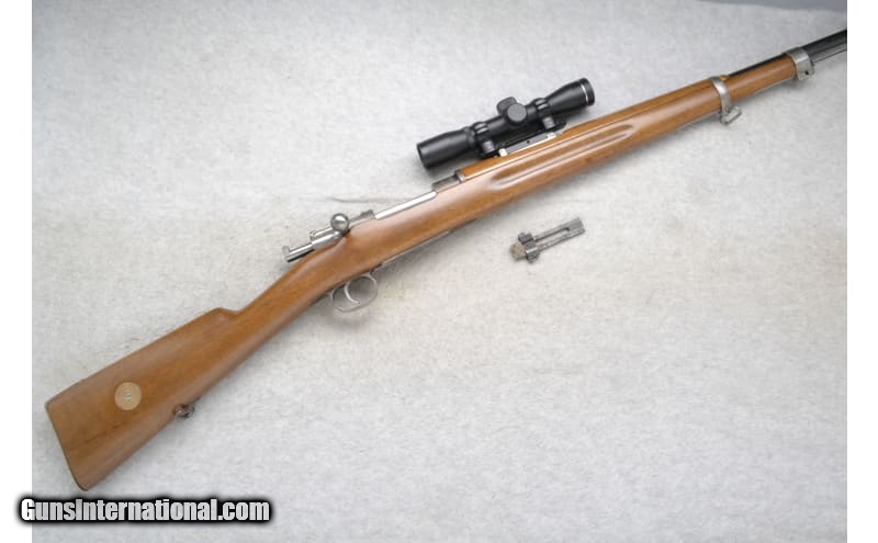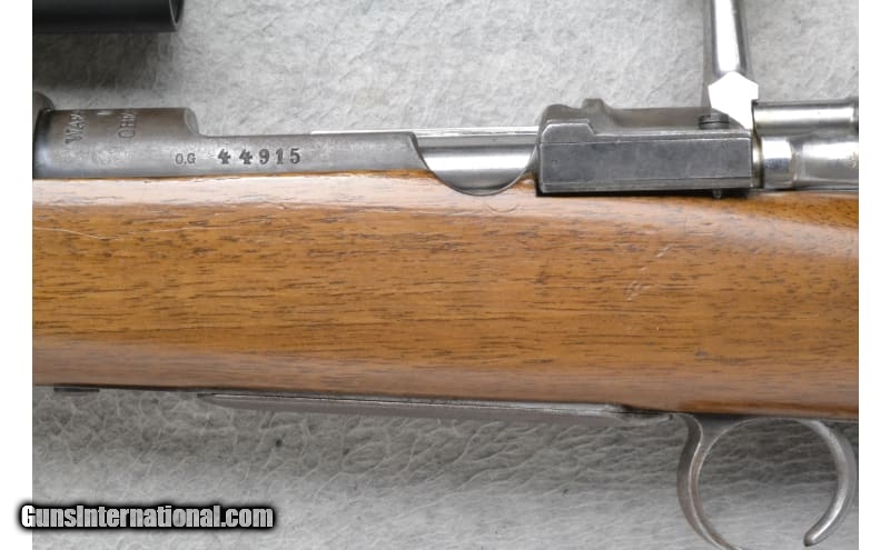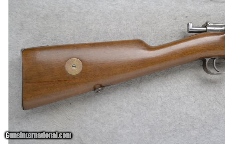 Description: This Mauser Model 1900 is a right hand bolt action rifle in 6.5x55mm Cal. It has a 24 inch barrel and blade front sight. The scope is a NcSTAR 2.5x30. The forearm is smooth two piece hard wood with finger grooves. The butt stock is smooth hardwood with medallion. The grip is a smooth hardwood pistol grip. S/N 44915. 6.5x55mm SOLD Chambers: 5 round internal magazine Metal Condition: Very good with mild handling marks and some freckling Wood Condition: Excellent with handling marks Bore Condition: Very good Barrels: 24 inches Stock Dimensions: LOP 14 inches Fore End: Smooth two piece hardwood with finger groves Butt Pad: Smooth metal butt plate Weight: 8 lbs. 10 ozs. Sights: "Blade front sight, NcSTAR 2.5x30 scope Item Location: Richfield, WI |