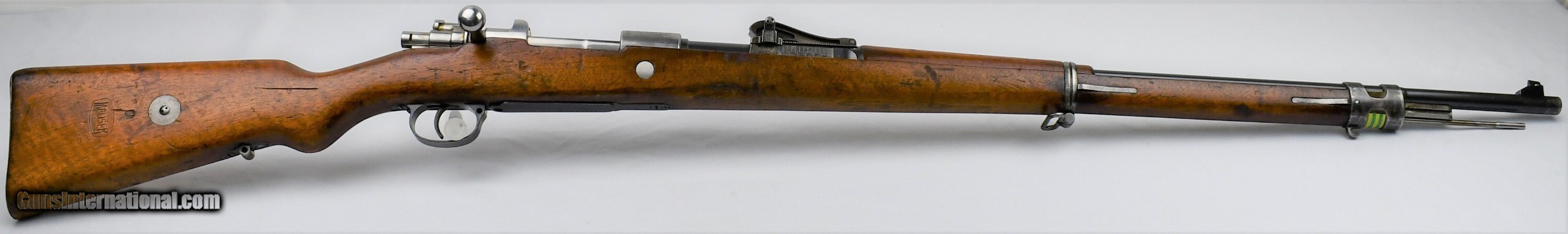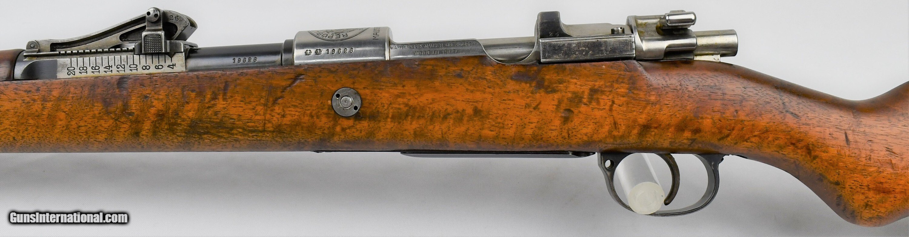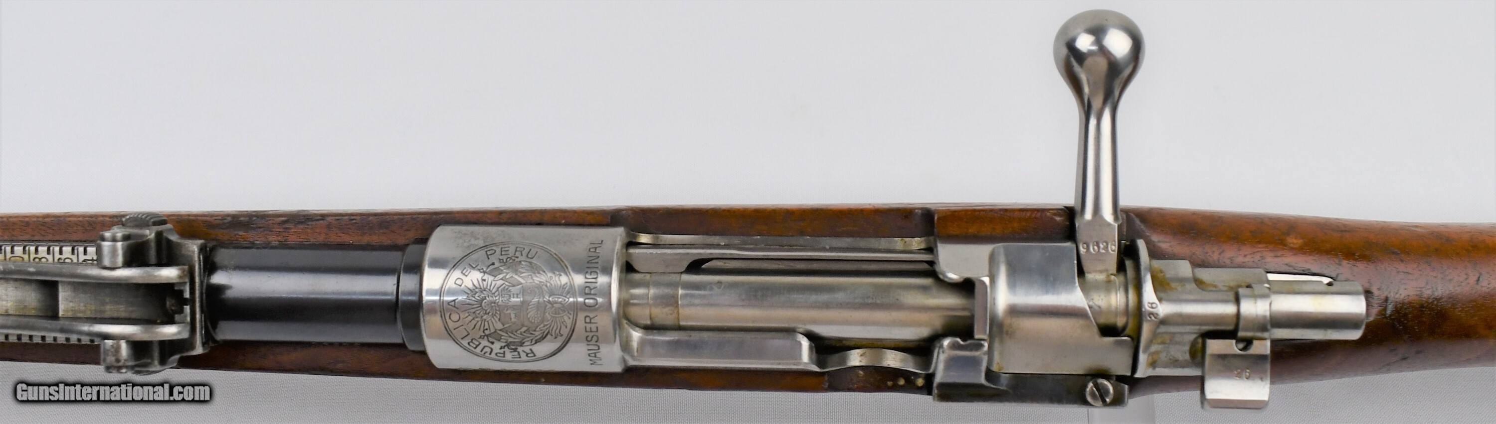 Description: Mauser, Model 1909, Peruvian Contract, 7.65mm, 29.5“ Barrel, Blue, Bright In White (Receiver, Bolt, Springs, Disc, Rod, Butt Plate), Nitre Blue (Bolt Release, Screws), All Visible Numbers Match, Cleaning Rod Unnumbered, Made In Oberndorf Germany, “Mauser Original” 1898, Serial # 19626, Condition: Very Good, with scattered scratches, finish thinning (most notably on bands and rear sight), Bore: Bright. Very nice example. **************************************C&R*************************************19040014/57*************************************C&R************************************* *******Free Shipping(Lower 48 States only)*********************Layaway Available************************Trades Considered*******************FIREARMS MAY HAVE FOREIGN PROOF AND IMPORT MARKS******* If you are the winning , you will receive payment instructions in a confirmation email • Payment: We accept United State Postal Service Money Orders or Credit Cards Add 3.5% Service Fee- Visa, MasterCard & Discover.