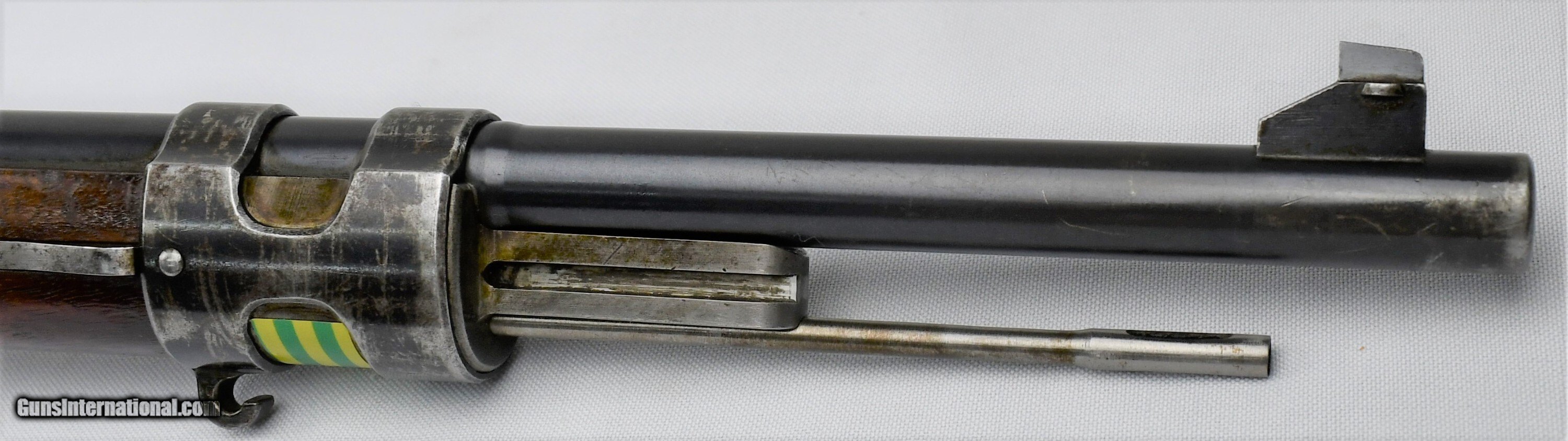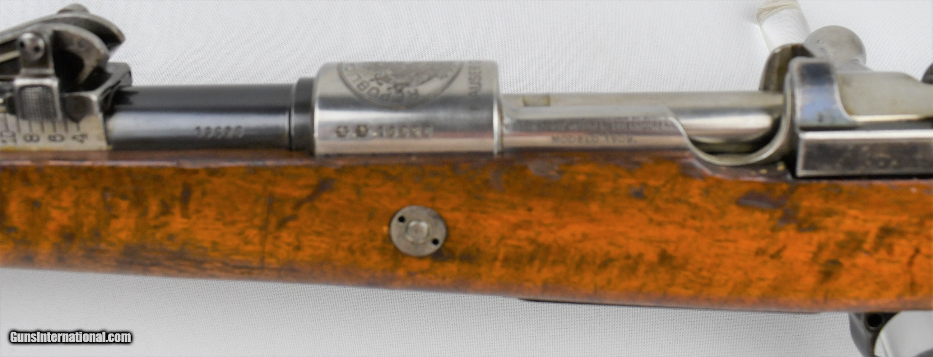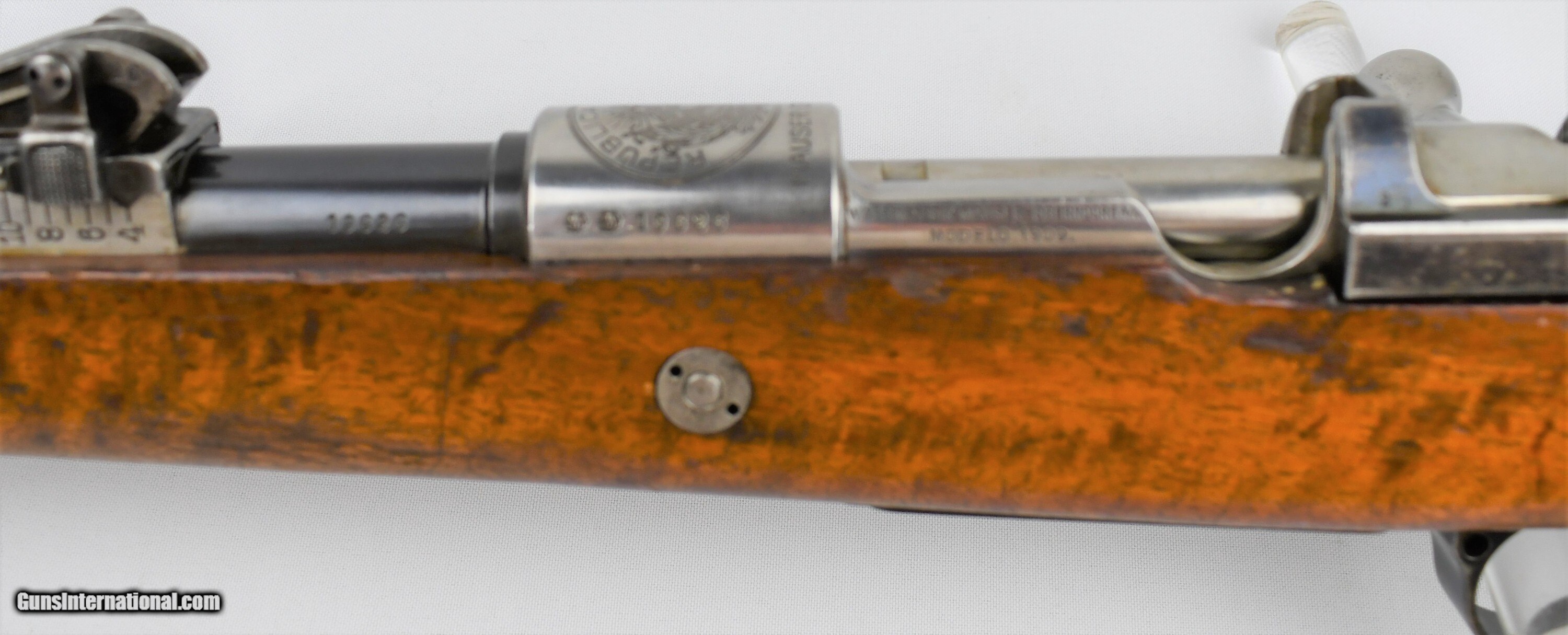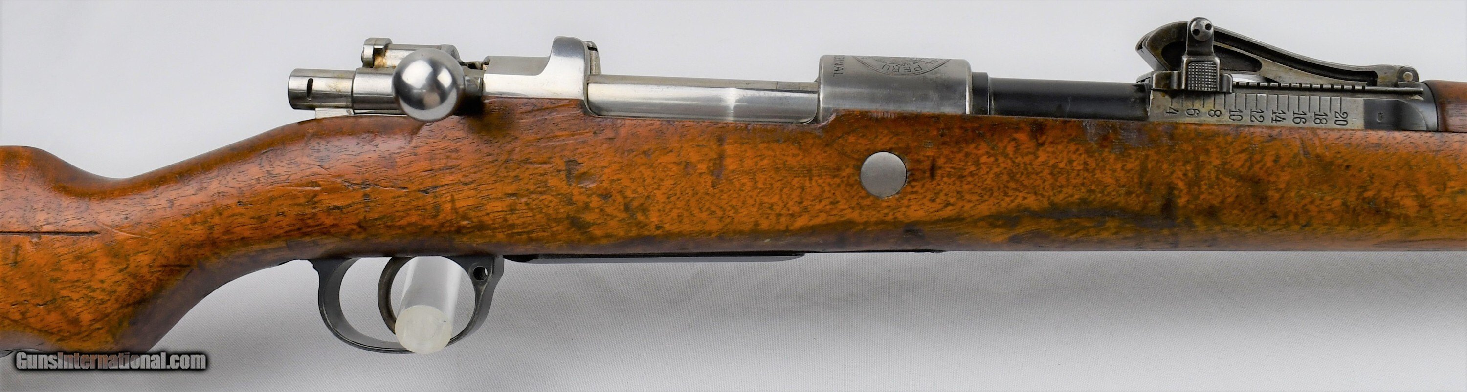 Description: Mauser, Model 1909, Peruvian Contract, 7.65mm, 29.5“ Barrel, Blue, Bright In White (Receiver, Bolt, Springs, Disc, Rod, Butt Plate), Nitre Blue (Bolt Release, Screws), All Visible Numbers Match, Cleaning Rod Unnumbered, Made In Oberndorf Germany, “Mauser Original” 1898, Serial # 19626, Condition: Very Good, with scattered scratches, finish thinning (most notably on bands and rear sight), Bore: Bright. Very nice example. **************************************C&R*************************************19040014/57*************************************C&R************************************* *******Free Shipping(Lower 48 States only)*********************Layaway Available************************Trades Considered*******************FIREARMS MAY HAVE FOREIGN PROOF AND IMPORT MARKS******* If you are the winning , you will receive payment instructions in a confirmation email • Payment: We accept United State Postal Service Money Orders or Credit Cards Add 3.5% Service Fee- Visa, MasterCard & Discover.