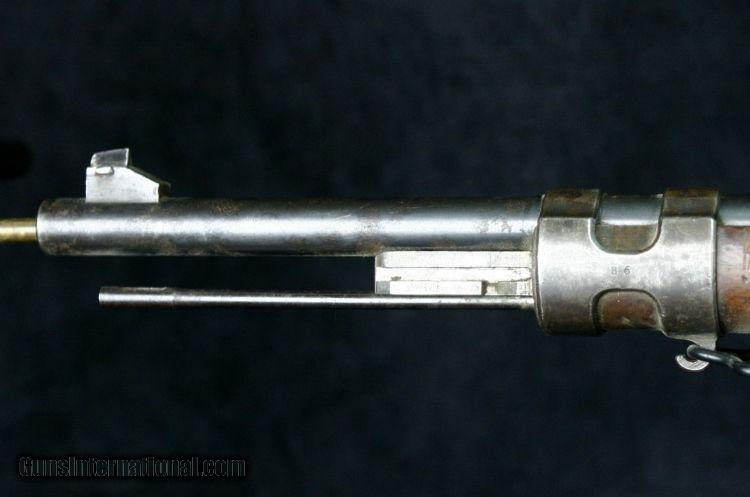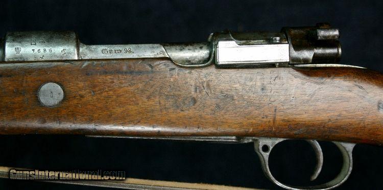 Description: 7X57, #7686, 29 1/2 inch baerrel, blue finish, wooden military stock, original sights, contemporary sling, bolt numbered 7258, marked Berlin 1916, with bayonet and sheath, marked Schleutermann Pemscheid (?). Condition: excellent sharp bore, 90% dull blue on barrel, action is silver, excellent mechanically, excellent marks. SOLD Curio/Relic: Yes |