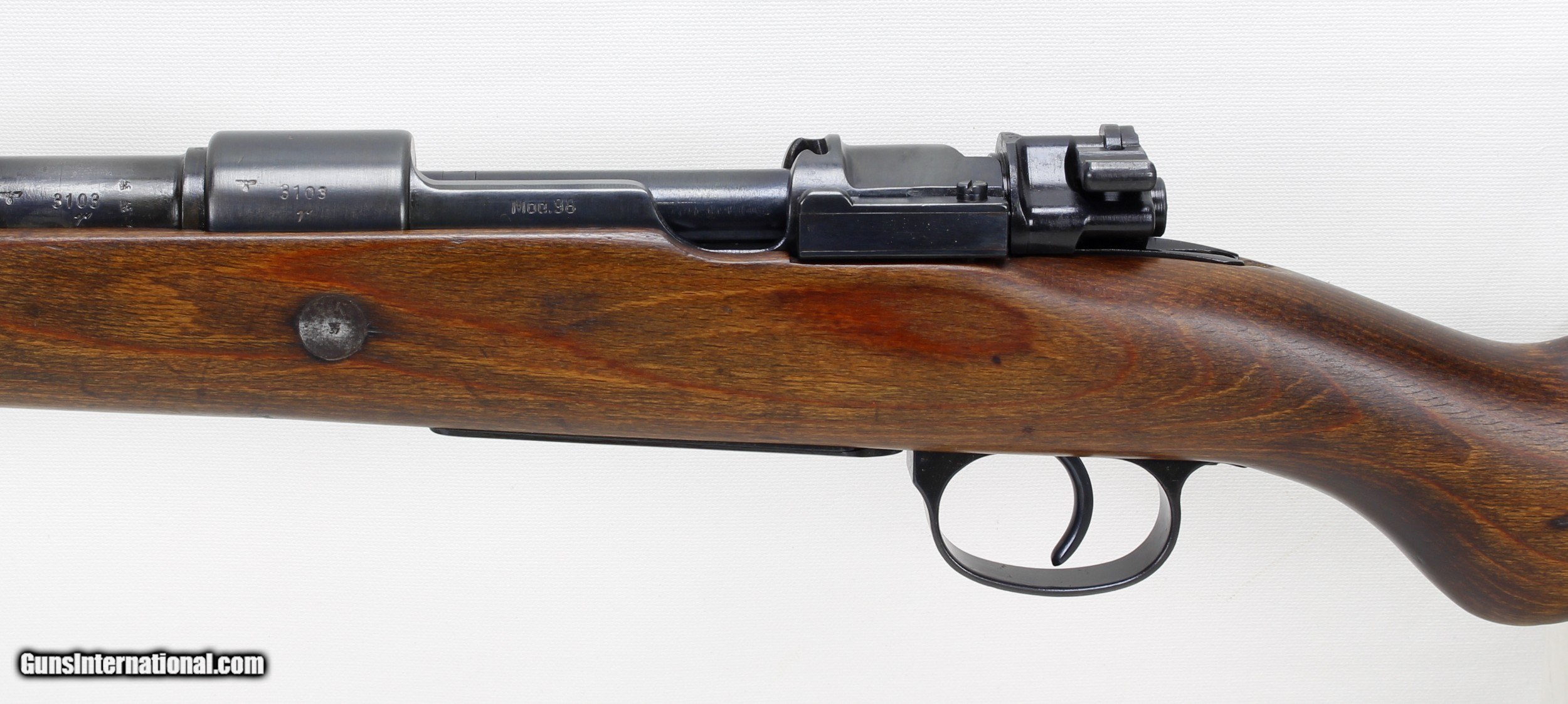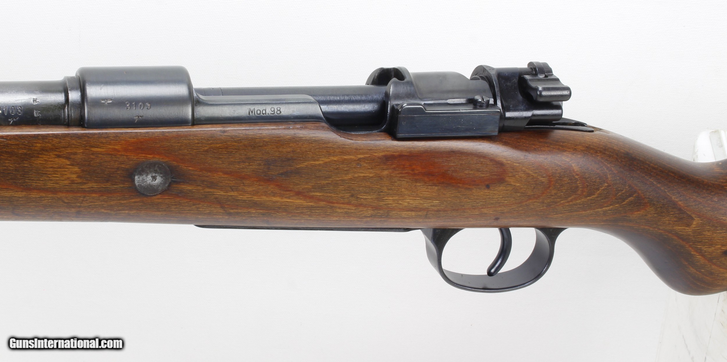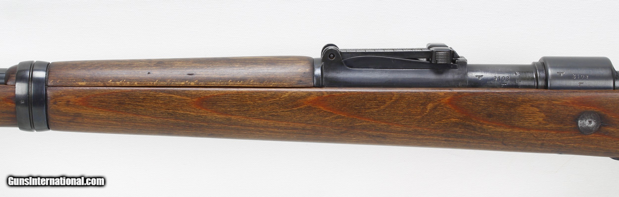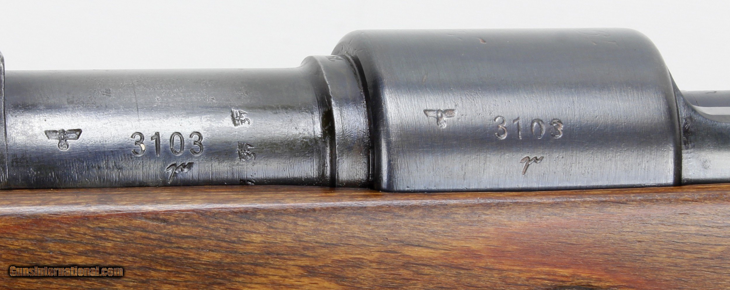 Description: Mauser K98 147 Rifle, Mfg. by J.P. Sauer, in 8MM. SN #3103r. Mfg. in 1940. All matching numbers. LOP 13". 24" barrel with a Very Good bore, strong rifling with slight frosting. The metal has been re-blued and all the Stampings and Nazi Markings are very clear. The wood has been nicely re-finished. Weight 8.7 Lbs. Very sharp all around and not easy to find one that has all matching numbers. More photos available upon request. Ships to Lower 48 W/ Insurance $40.00. SOLD Curio/Relic: Yes Rifle Caliber: 7.92x57mm Mauser Manufacturer: J.P. Sauer Model: 98K Mauser Serial Number: 3103r Barrel Length: 24 Condition: Excellent Metal Condition: Refinished Wood Condition: Refinished Bore Condition: VG Action: Bolt Action LOP: 13 Finish: Blue Weight: 8.7 Lbs. Manufacture Date: 1940 |