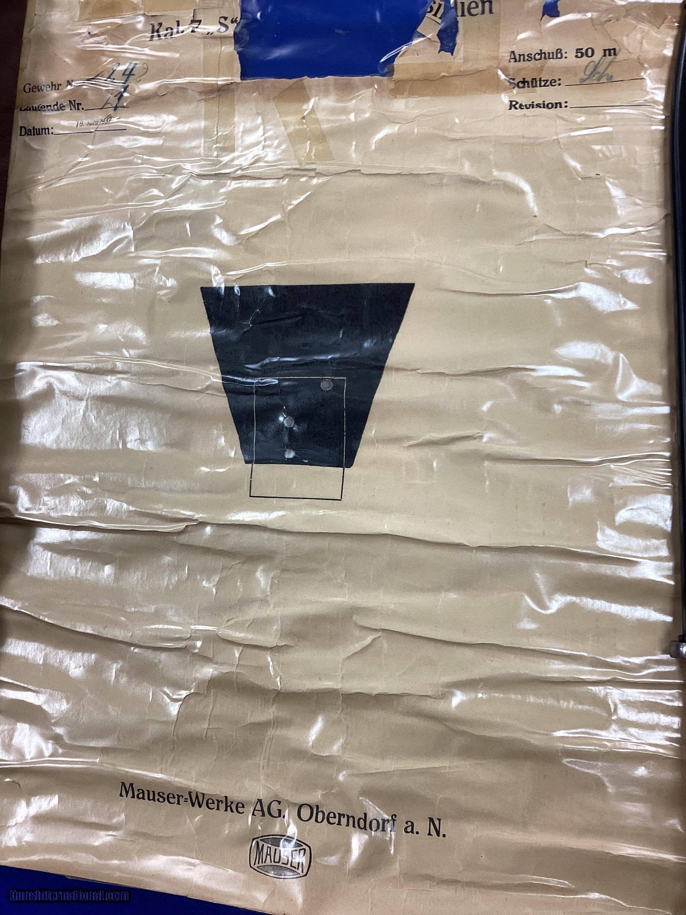 Description: PRE-WWII (1937 Mfgr.) ‘’MAUSER BANNER’’ BRAZILIAN model 1935 long rifle complete set! MFGR. ‘’MAUSER-WERKE, OBERNDORF’’ Cal. 7mm (Standard 7 X 57 Mauser), SN 6,242. ALL MATCHING & ORIGINAL! Unfired and unissued remains as factory new, rating 99% and not import marked. This Mauser Banner comes complete with its mint factory matching serial numbered bayonet and scabbard, cleaning rod, muzzle cover, original sling and Mauser factory matching serial numbered test target (dated April 19, 1937). This complete set also comes with an original picture of the freshly opened crate of the model 1935 Mausers, which included this actual rifle. Everything original, museum quality and absolutely beautiful! Truly an 87 year old time capsule! THE FINEST WE HAVE EVER HAD! A Great Collector Opportunity! This example has only a few ever so slight marks in all its 87 years of existence! If you are a very discriminating Collector this should fit your requirements to a ‘’T’’ as it simply Does NOT Get Any Better Than This! These Brazilian Model 1935 Mauser-Werke, Oberndorf Mauser rifles were manufactured in the 1935/1937 PRE-WWII period being un-questionably of the highest un-equaled Mauser quality and workmanship that would rival any of the finest commercial sporting firearms ever manufactured! MAUSER-WERKE FACTORY TEST TARGET: This is the ‘’icing on the cake’’ so to speak and is dated April 19, 1937! It typically shows its age and fragility being frayed somewhat but still appx. 95% intact. Luckily, it was laminated in the past for protection! Just to find the complete Rifle, Bayonet Set and All Accessories are a Rare find in itself to say the least, but finding a 99% condition complete set such as this PLUS Factory Test Target is simply Un-believable! Book Reference: Please refer to the fine books such as ‘’The Standard Catalog of MILITARY FIREARMS The Collector’s Price and Reference Guide’’ under Brazil/Rifles on page 48 (our copy is the 3rd Edition, and it includes many items from our Collection). As far as Pricing is the FACT that shown in the above Listed ‘’Reference Book ‘’The Standard Catalog of MILITARY FIREARMS The Collector’s Price and Reference Guide’’ under Brazil/Rifles on page 48 it shows information from Rock Island December 2001 (OVER 20 YEARS AGO) where a similar Mod 1935 sold at for $3450.00! Again, that was 20 years ago in yesterday’s Dollar! Matching/Originality: ALL MAUSER-WERKE, ORBENDORF (1935/37) FACTORY MATCHING and 100% FACTORY ORIGINAL, UNFIRED and UNISSUED thru out! Finish & %: The untouched and absolute 100% Mauser Factory finish ALL rates easily at 99.9% overall as does each and every part! The Receiver itself and complete Bolt Assembly are also still 100% Factory Original ‘’in the white’’ un-touched, never cleaned, or re-polished and again Factory MINT! Even after all these 85+ years all the Very Fragile Mauser Factory ‘’Fire Blued’’ parts still rate MINT/MINTY! Very magnificent and unequaled original metal finish all in the long-gone old-world quality and workmanship that cannot be duplicated today! Proofs/Markings: All are absolutely perfect and untouched exactly as struck in 1937 at Mauser-Werke, Oberndorf as follows: The top front receiver ring is perfectly marked with the ‘’BRAZILIAN CREST’’ (See page 48 of the above reference book) and though not shown see in this picture is the perfect deep, sharp and crisp ‘’MAUSER BANNER’’ that is on the top rear Receiver Ring! On the left receiver left rail is the perfectly marked ‘’MAUSER-WERKE AG, OBERNDORF AN.’’! All stampings, markings, Proofs, etc. are absolutely Factory perfect, untouched, deep, sharp and crisp as the day in 1937’ that they were stamped at the Mauser Factory! Simply magnificent and un-equaled markings thru out! Bore: The BORE is MINT as is the magazine follower and receiver feeding ramp. The Cal. on this variation is the unequaled/standard Mauser 7mm (7 X 57). Action/Mechanically: It is absolutely Factory/New/Perfect thru out with the unequaled Pre-WWII Mauser-Werke 98 Action, and these are world famous for their smooth as silk action! (The quality of these Mauser actions were so very high sought-after that many of these magnificent Rifles such as this variation were forever destroyed having their actions used to build high end sporting rifles) Wood set: As with all else on this most Historic ‘’MAUSER BANNER’’ Brazilian Model 1935 Mauser Long Rifle the Factory Walnut wood set is simply Magnificent and un-equaled and other than only (virtually none) the slightest minor storage/handling marks in all its 85+ years rates as MINT being a stained medium walnut color and absolutely untouched and simply a magnificent wood set! Both stock and hand guard match absolutely perfect in all respects in its wood, grain, color, fit and finish, etc. On the center right rear butt stock is the untouched original metal (in the white and also proof of NEVER being issued never stamped or numbered) ‘’ID DISC’’ with the ‘’Fire Blued Screw assembly’’ and it too is again totally untouched/perfect! Also of another special note is the FACT that attesting to this Rifle BEING UN-ISSUED it Does NOT have the issuing ‘’BRAZILIAN STAR in CIRCLE’’ Proof/Cartouche markings! Even the butt plate is untouched and other than simple expected storage/rack marks through all these 85+ years rates as close to minty as possible with both its screw slots MINT and un-touched! As with all else the wood set cannot be up graded! Bayonet/Scabbard Set and Accessories: FACTORY ORIGINAL and MATCHING SERIAL NUMBERED Long Bayonet and Scabbard Set which also rates as MINT the same as the Rifle itself, unequaled and cannot be up graded! The Mint/untouched blade is of course unsharpened! Also still with this magnificent Long Rifle is its Mint Original Metal and Brass Muzzle Cap/Cover that also protects the front sight. Mint Cleaning