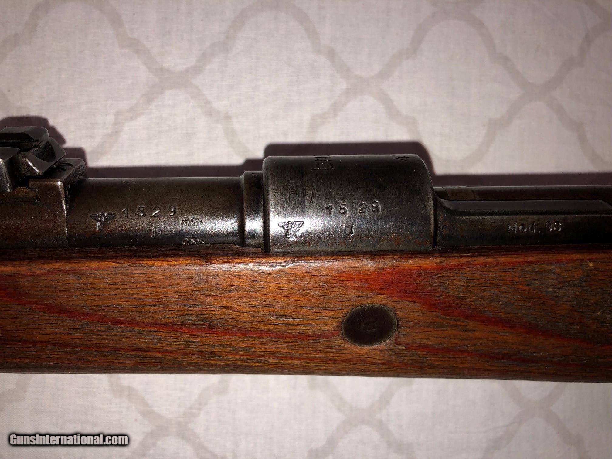 Description: 1941 Mauser K98, 8mm. Receiver marked BNZ 41, Steyr manufacture. Serial numbers do not match on the bolt and floor plate. It does have nazi eagle/swastika stamping. Rifle has been function tested and cleaned by a gunsmith. Please refrence pictures for rifles condition. Bore is bright. Rifling looks good. Rifle has an import stamp. Great piece of history. SOLD Rifle Caliber: 8x57mm J Manufacturer: Steyr Model: K98 Serial Number: 1529 Barrel Length: 24 |