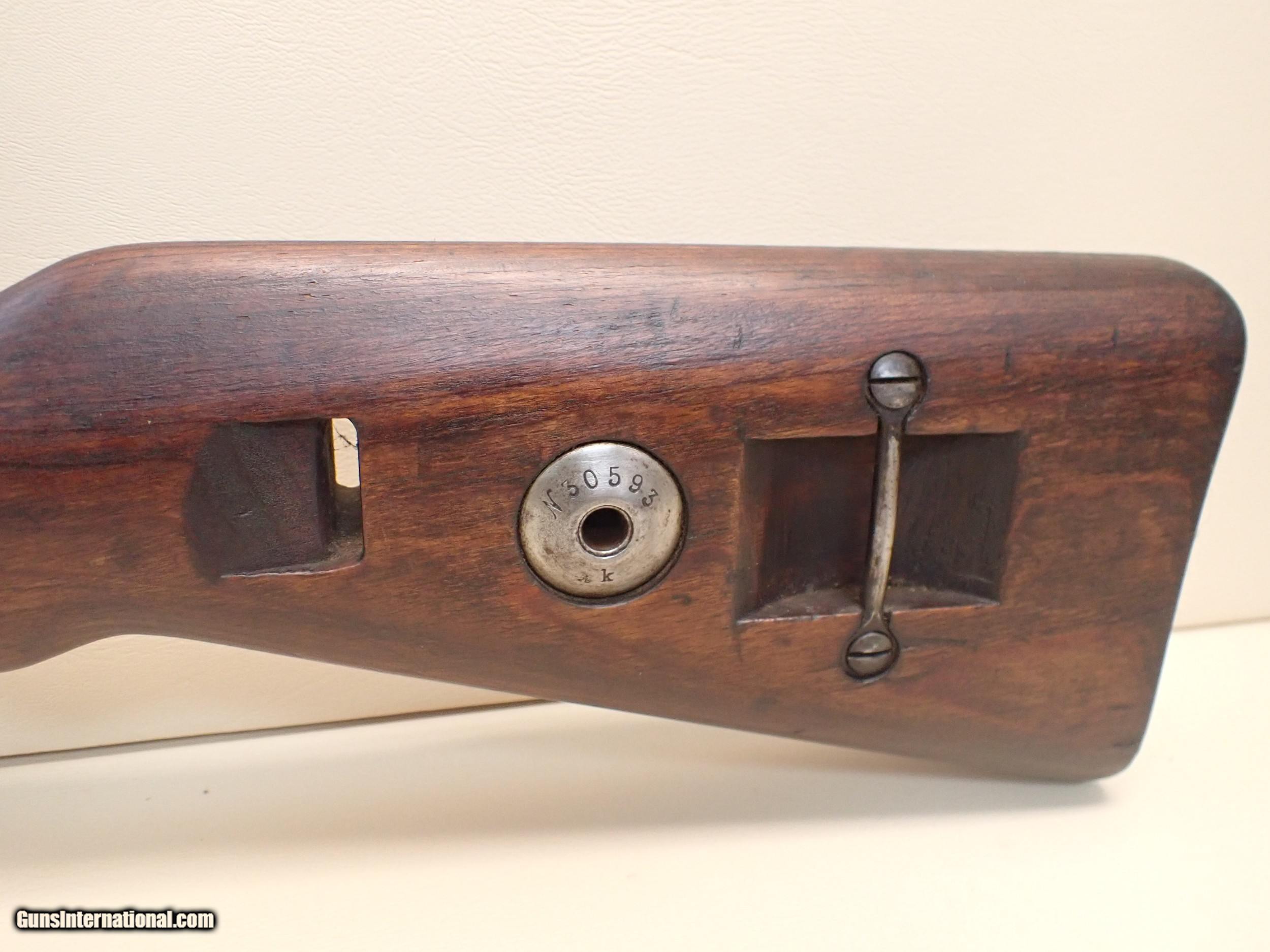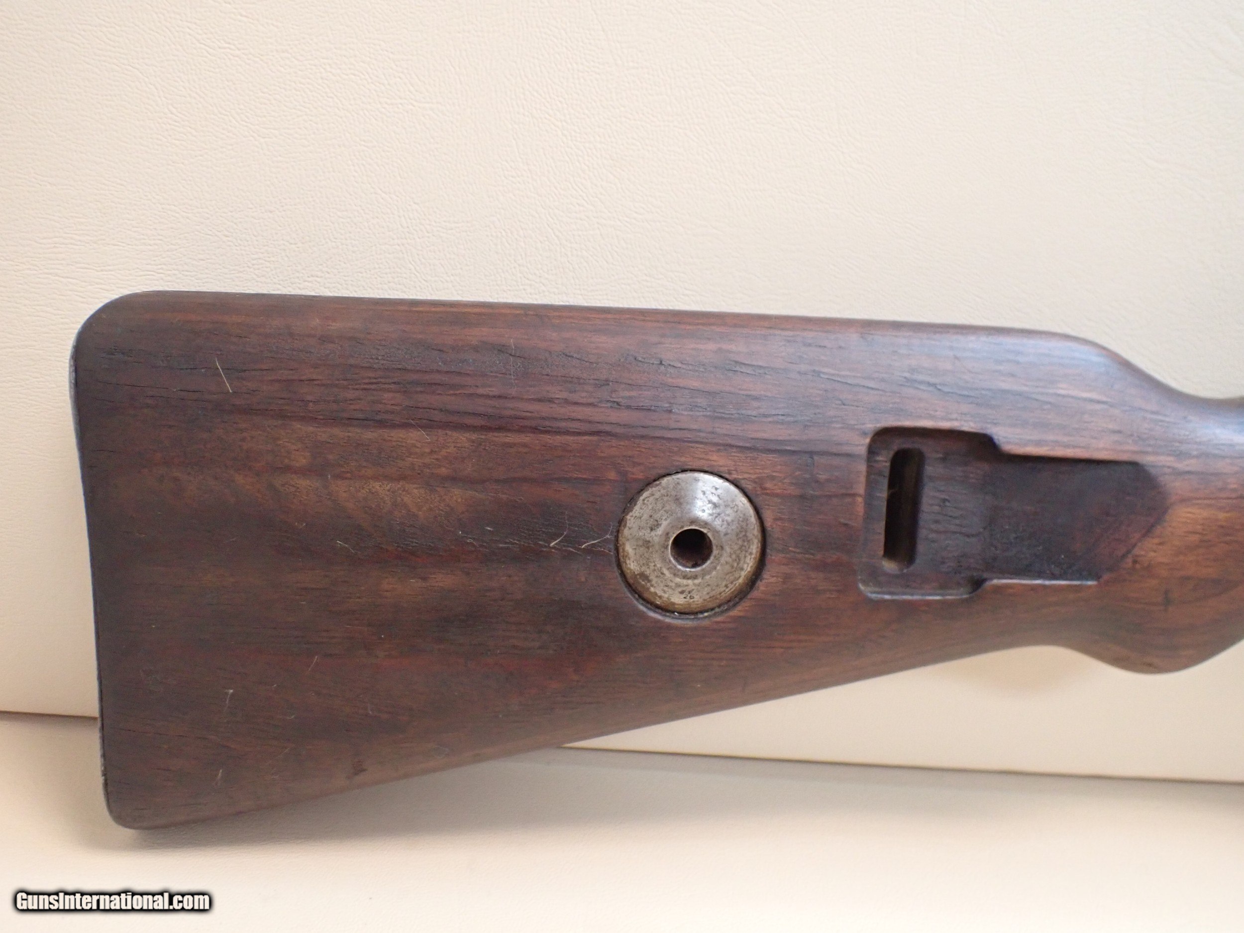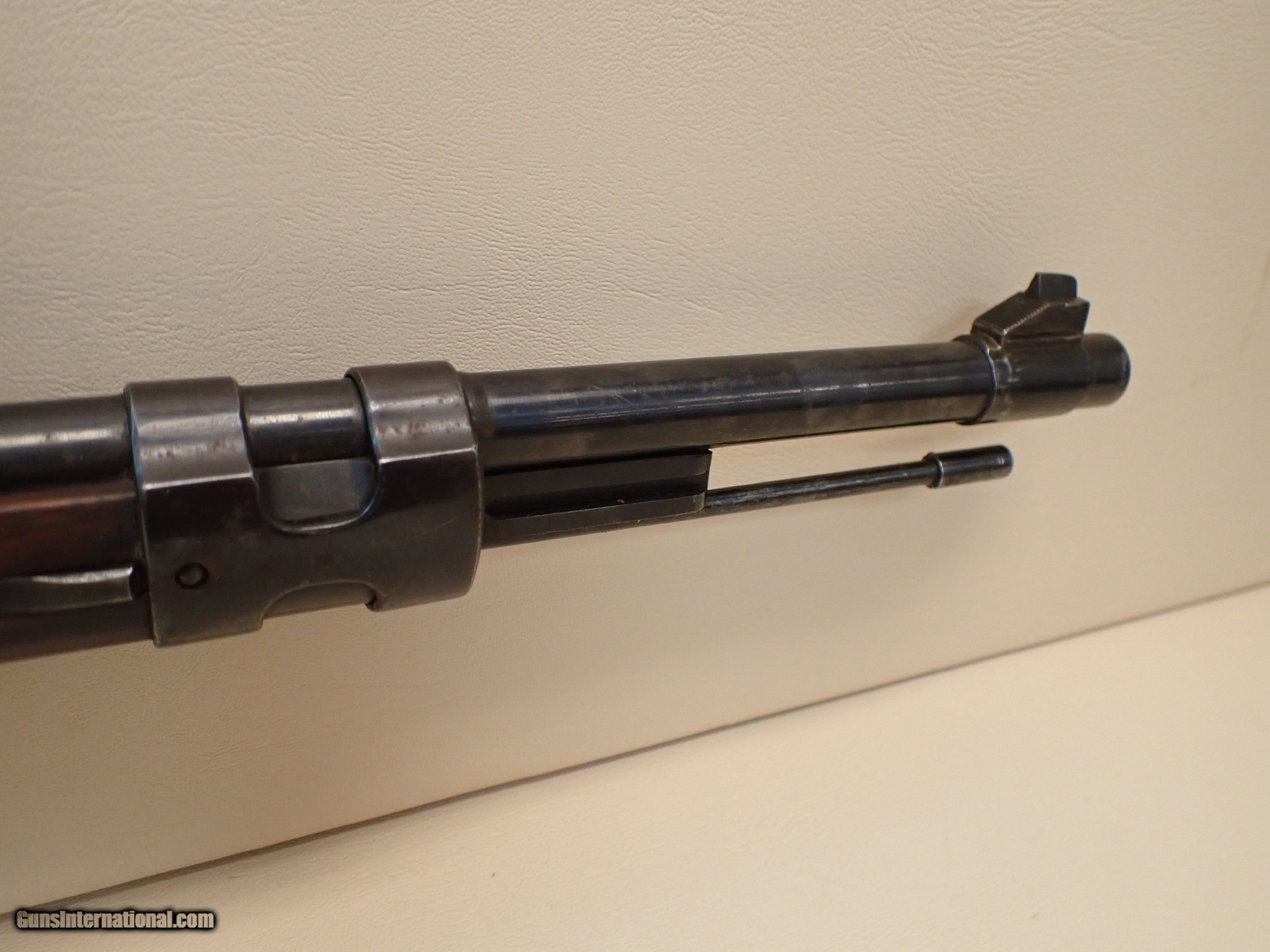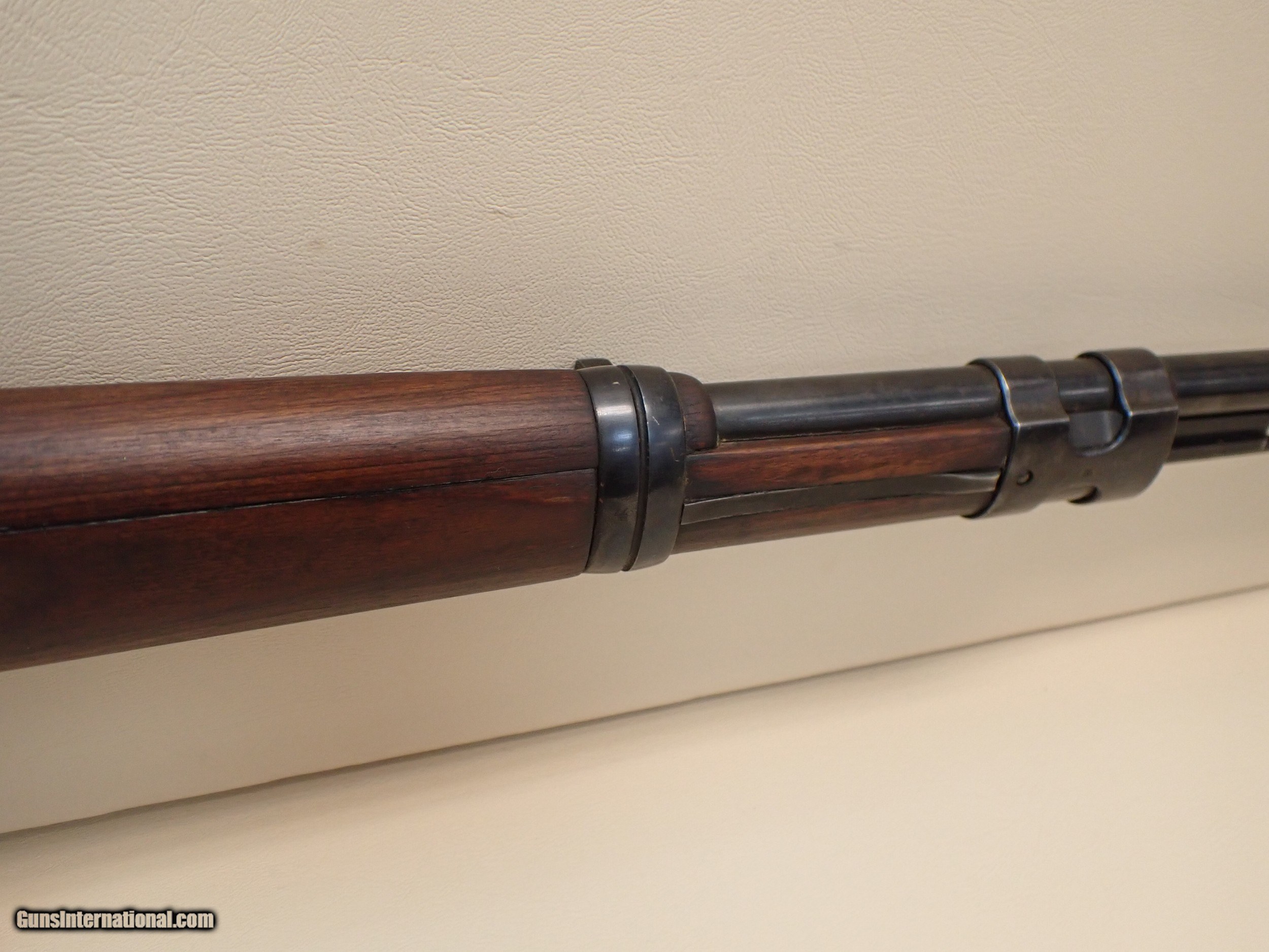 Description: ***SOLD*** Mauser K98k 8mm Mauser bolt action WWII German service rifle, dated to 1940. This rifle features a full length laminated hardwood stock and handguard, with a blued finish on the hardware, and the iconic Mauser-designed bolt action mechanism with internal magazine. The rifle appears to have all of its original matching parts, with matching numbers, as shown in the photos. The rifle is in good working order with a smooth action and operable trigger mechanism. The bore has some mild corrosion, with visible rifling underneath, and with some work/solvents, could become a nicer bore. The extractor and other flat springs are dispalying a red-ish tone, likely a result of the heat treating method they underwent during production. The stock has two small splits, one right behind the receiver tang, and one by the top of the butt plate, and both appear to be stable. Some evidence of finish wear and evidence of old surface rust is visible as well. Please refer to the photos to further assess the condition of the rifle. A wonderful collectible rifle for a WWII small arms enthusiast, and could make for a great shooter! C&R OK. SOLD Manufacturer: Mauser Model: K98k Serial Number: 8928 Caliber Info: 8mm Mauser |