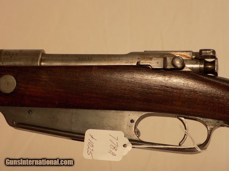 Description: MAUSER KAR 88 CARBINE, 17 1/2" bbl., 8 MM, SN 59XX, all matching, top of receiver marked "VC Schilling Suhl 1891", military flip up rear sight, blade front, exc. bore, S stamp on top of the receiver denoting the diameter of the bullet, 90% bbl. blue, receiver mostly bright metal, exc. wood, spoon handle bolt. SOLD Antique: Yes |