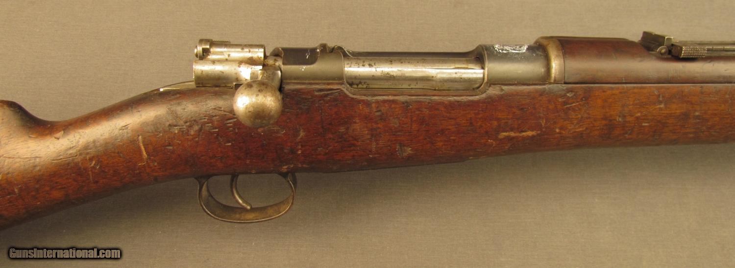 Description: Serial #B5903, 7mm Mauser, 29" barrel with an excellent, bright bore. The barrel, receiver, and furniture retain 85-90% of the original blue finish with areas of silvering at the muzzle, fading along the exposed edges and projections, and evenly scattered spots of freckling and pinprick pitting on the otherwise armory bright bolt (not numbered to the gun). The walnut stock and handguard have numerous light-moderate handling marks and blemishes scattered throughout the re-applied military oil finish as well as some minor chips missing from around some of the inletting edges. The cartouche on the LT side of the butt is still visible but indistinct and there is heavy wear at the toe of the butt. Nevertheless, this is a very good plus small ring military Mauser that was made prior to 1899 and would make a nice addition to a collection. Antique SOLD Antique: Yes Manufacturer: Mauser Model: 1895 Serial Number: B5903 Caliber Info: 7mm Gauge Info: 7mm |