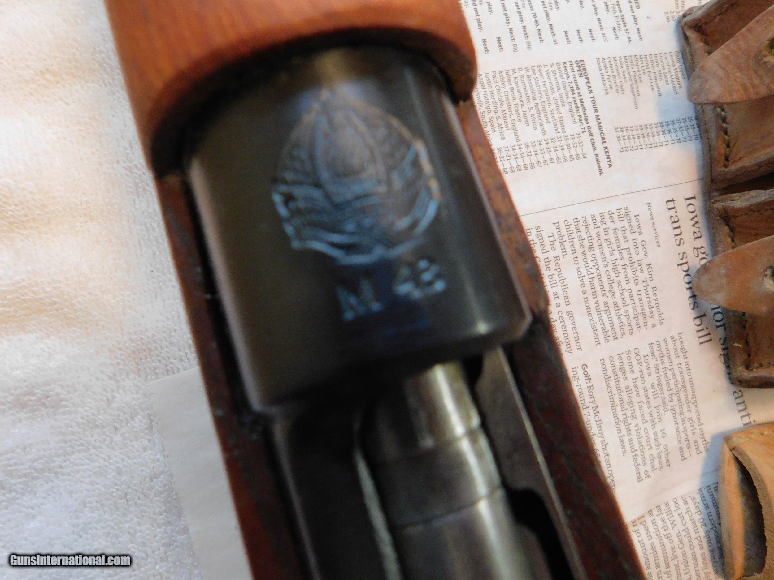 Description: Collectors quality. Yugo M48 mauser unissued with box. unissued bayonet and complete kit. Milled machined metal . made 1951. Comes with Spam can 8mm ammo. All numbers match. NOT MITCHELLS MAUSER Bayonet with scabbord, leather frog for bayonet, sling with brass divits, Dual leather ammo pouch, field cleaning kit. 75.00 freight charage includes gun with kit and seperate shipment of ammo spam can. C&R of FFL required. Rifle and bayonet has been cleaned but still has light layer of cosomalene to preserve Grease in receiver and barrel must be thourghly cleaned before shooting. SOLD Curio/Relic: Yes Rifle Caliber: 8x57mm J Manufacturer: Yugo mauser Condition: New old stock |