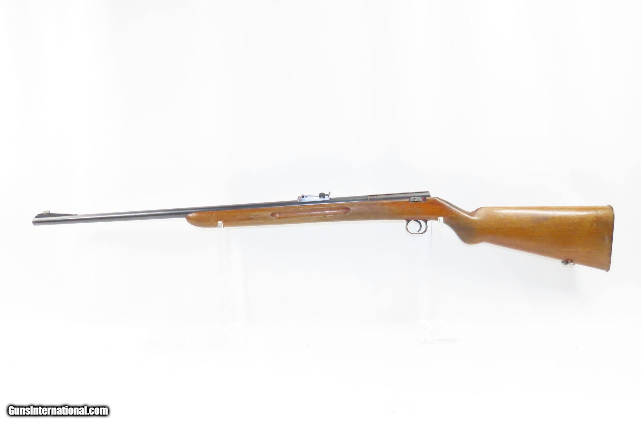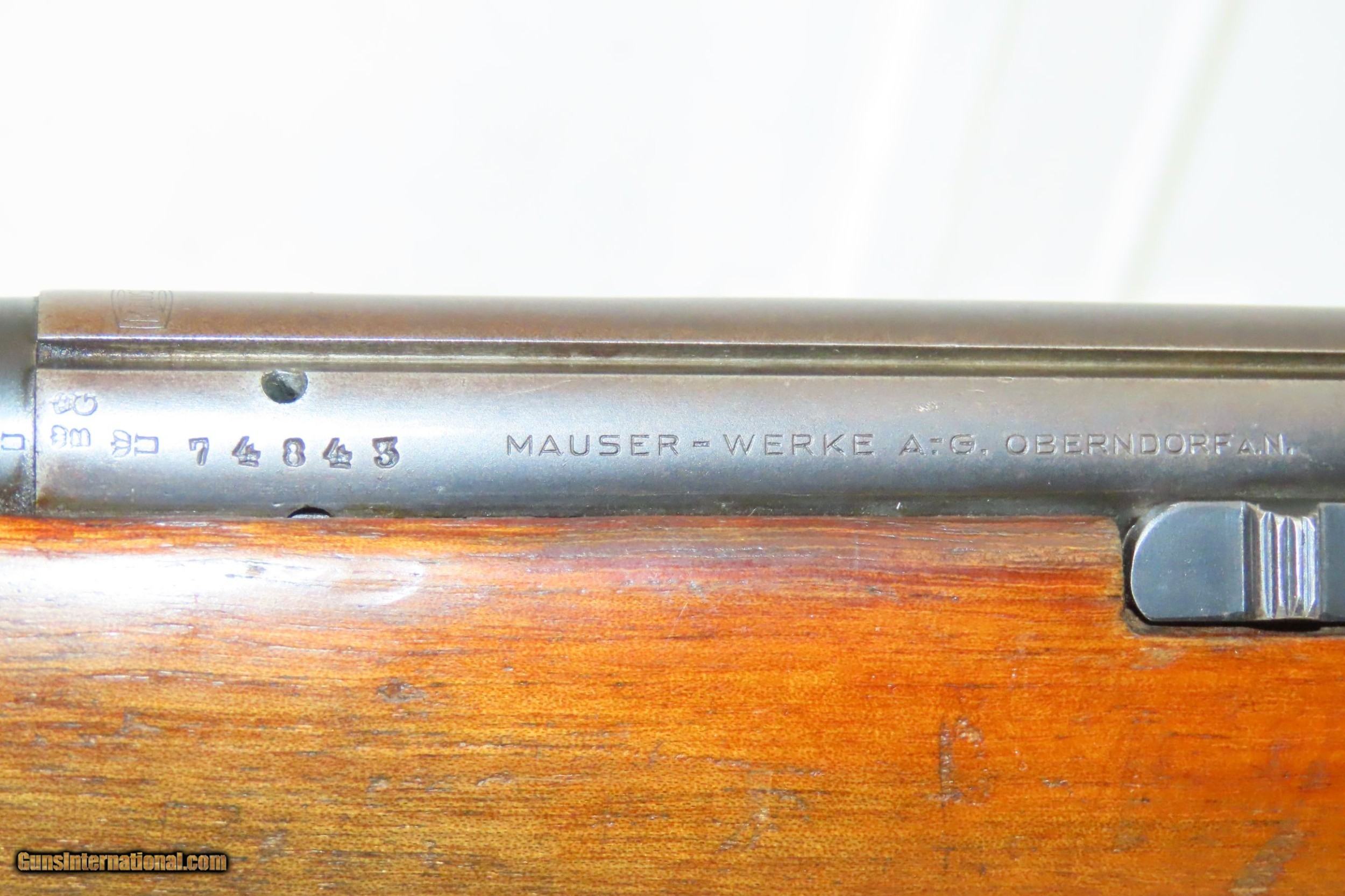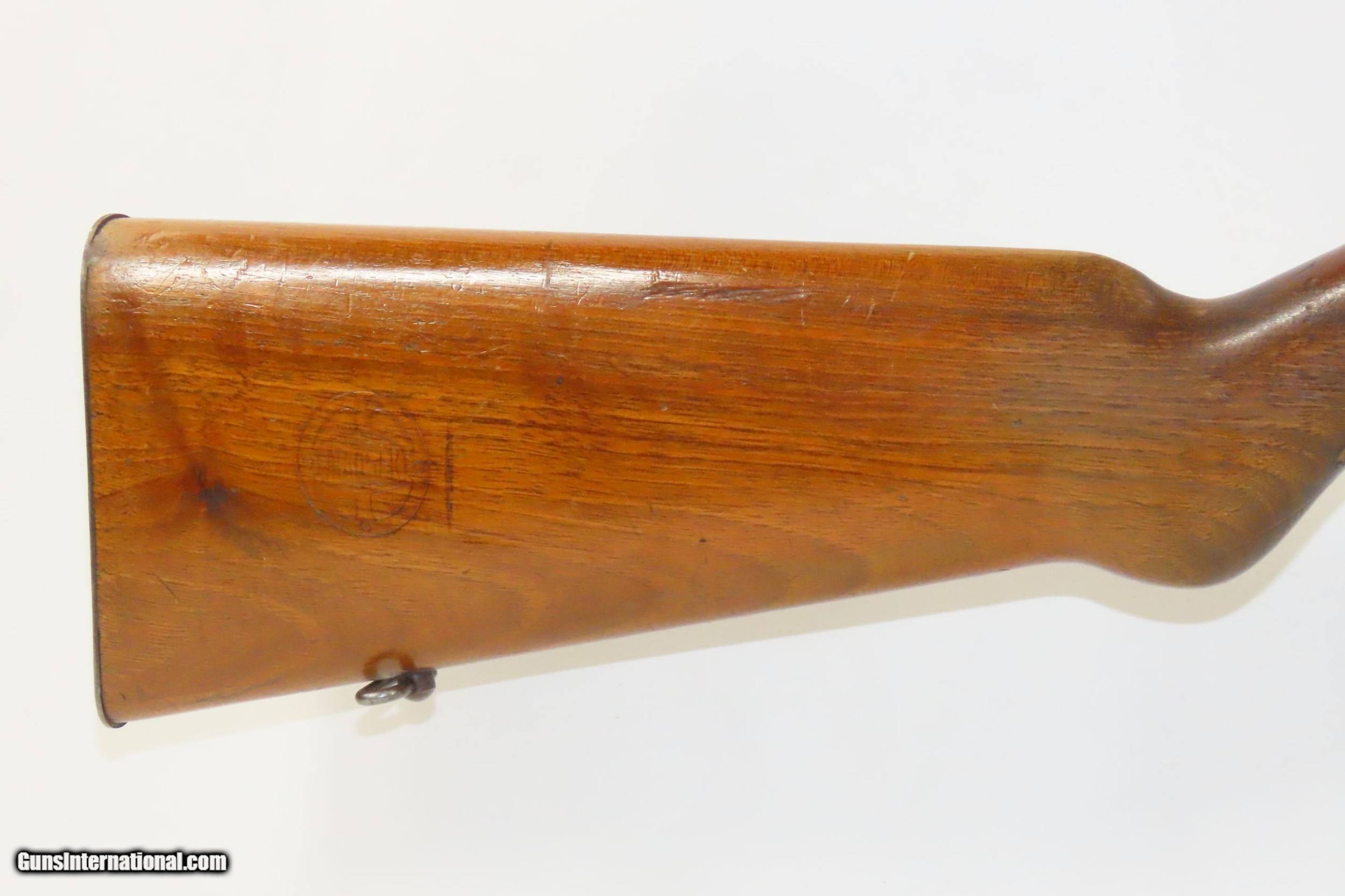 Description: Pre-WORLD WAR II German MAUSER Model 350 Series PATRONE Bolt Action Rifle SINGLE SHOT Training/Target Rifle Here we present a C&R German Mauser Werke Model 350 Series Patrone Rifle manufactured circa the 1930s. This single shot bolt action Mauser Werke rifle was manufactured in Oberndorf, Germany and was used primarily as a target or training rifle, though of course even a .22 rimfire would have been a useful weapon to a partisan or civilian during the war. The Mauser logo is on top of the action and the receiver wall is marked “MAUSER WERKE A.G. OBERNDORF A.N.”, along with various proof marks. The right side of the stock is clearly stamped with the Mauser logo. The overall condition is very good. Original blue preserved. Strong action. Nice 2-stage trigger. Bright, nicely rifled bore. Solid stock containing and expected amount of wear. The numbers match and visible markings are sharp. No import markings lends credence to the possibility of this being a bring-back by a GI. This is a neat little piece of German and military history. This firearm is classified as a Curio & Relic. Barrel is 25-1/2 inches. Caliber: .22 Long Rifle Rimfire Overall condition as seen in photos. Very Fast. Very Safe. FREE SHIPPING. Will need to be sent to your local FFL or C&R licensee. This firearm is classified as a Curio & Relic. Guaranteed AUTHENTIC & Includes CERTIFICATE OF AUTHENTICITY. ancestryguns $1250 #217552 SOLD Curio/Relic: Yes |