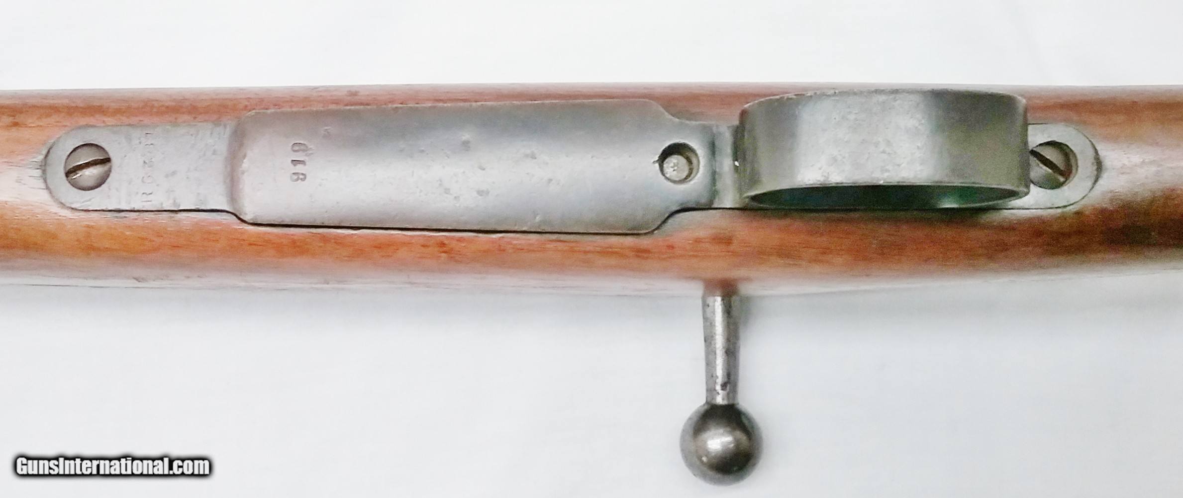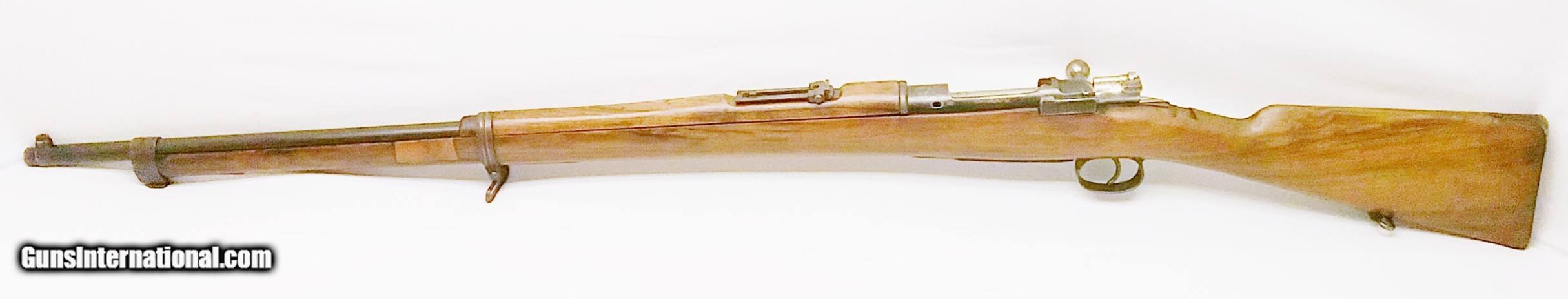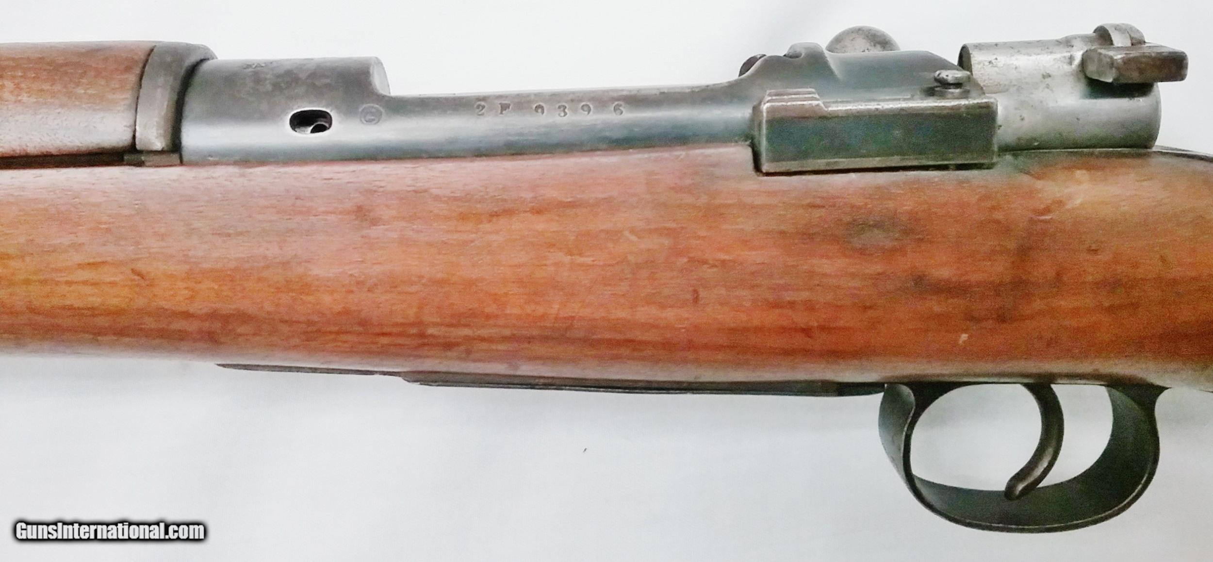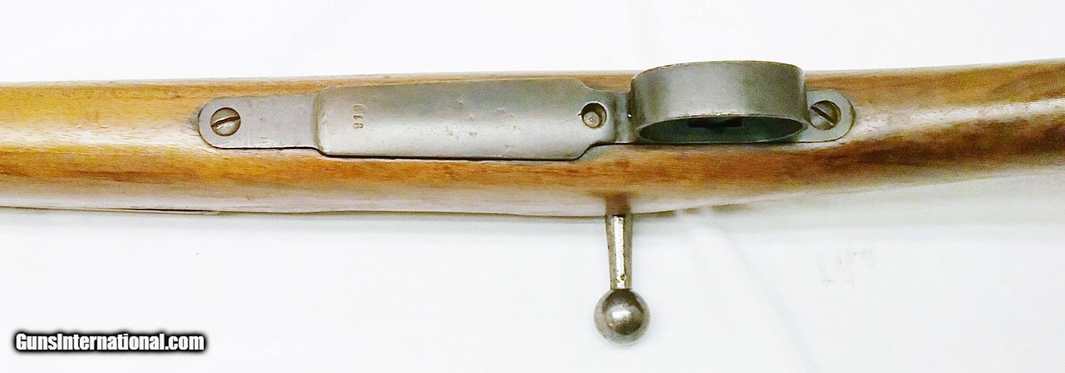 Description: This 7x57mm Spanish Mauser Model 1893 has a 29-1/4” blued tapered round barrel mounted with an adjustable rear sight and a drift-adjustable front sight. The top of the receiver is stamped with a crown and “Fabrica De Amas Oviedo” and is dated 1921. The rear left side of the receiver has a circle G stamp and the serial number. The bore is good. The Select Hardwood stock with handguard are in good condition with the exception of the removal of some wood near the rear of the receiver, and some scratches and handling marks. There is also a repaired section where a new piece of wood was spliced forward of the rear barrel band. The gun features 2 military sling swivels and a bayonet lug. The numbers on this gun are non-matching. Length of pull is 13”, overall length is 48-1/4”, weight is 8.4 lbs. Our stock number is A924. Will ship to any FFL, anywhere in the United States. Buyer pays freight and insurance. SOLD Manufacturer: Fabrica De Amas Oviedo Model: Mauser Model 1893 Caliber Info: 7x57mm Bore: Rifled Condition: Good Wood Condition: Good Bore Condition: Good Barrels: One Barrel Type: Tapered Round Action: Bolt Action Triggers: One Stock: Select Hardwood Butt Pad: Metal LOP: 13 Finish: Blued Weight: 8.4 lbs Sights: Adjustable Item Location: OR |