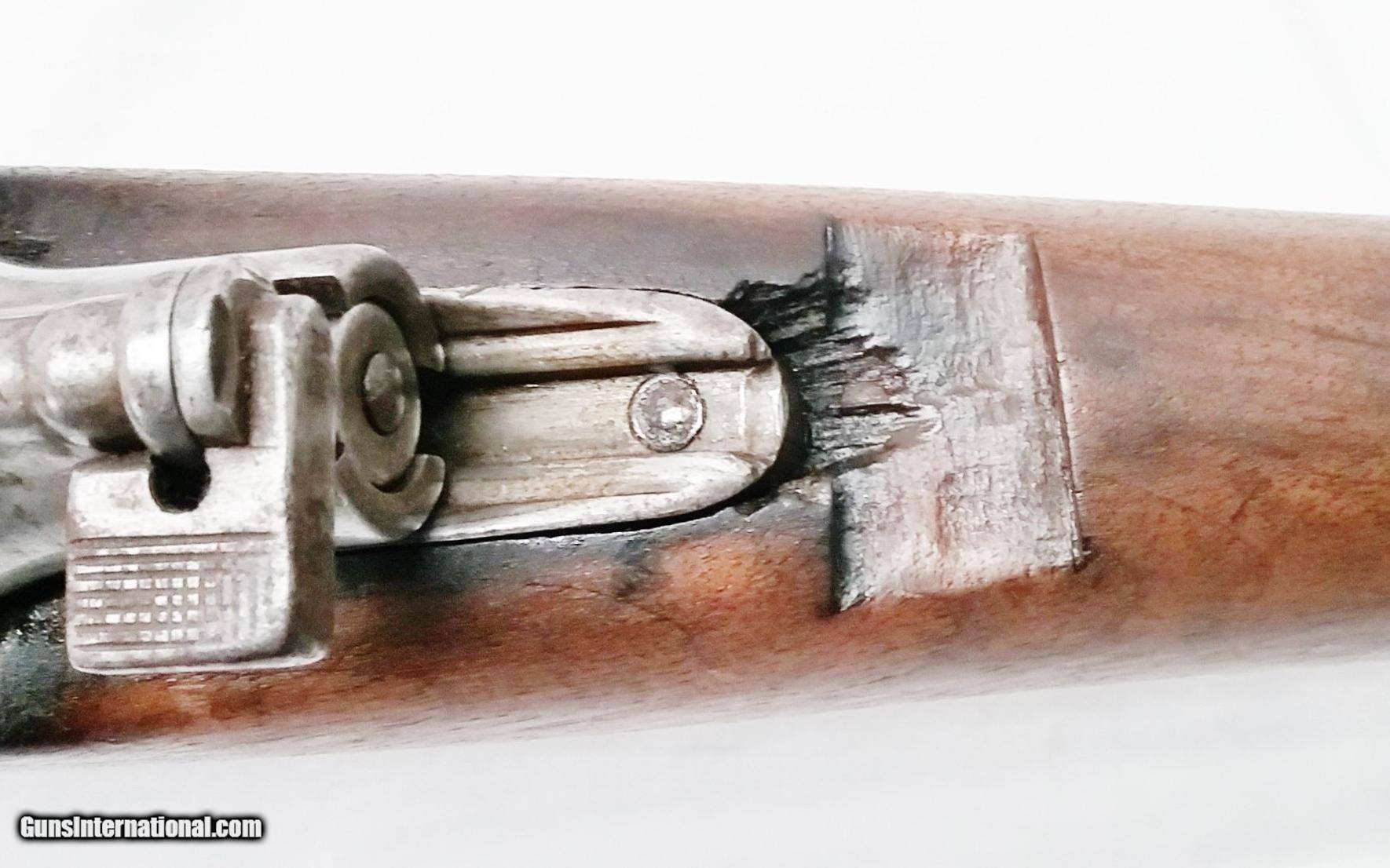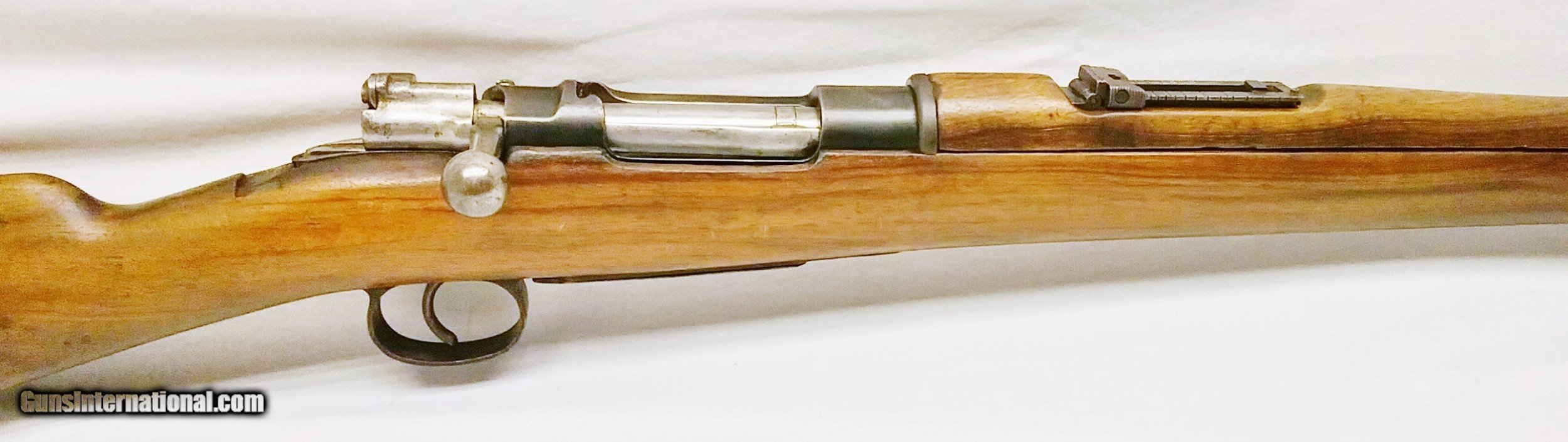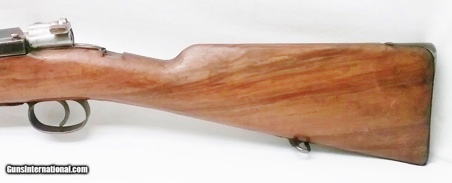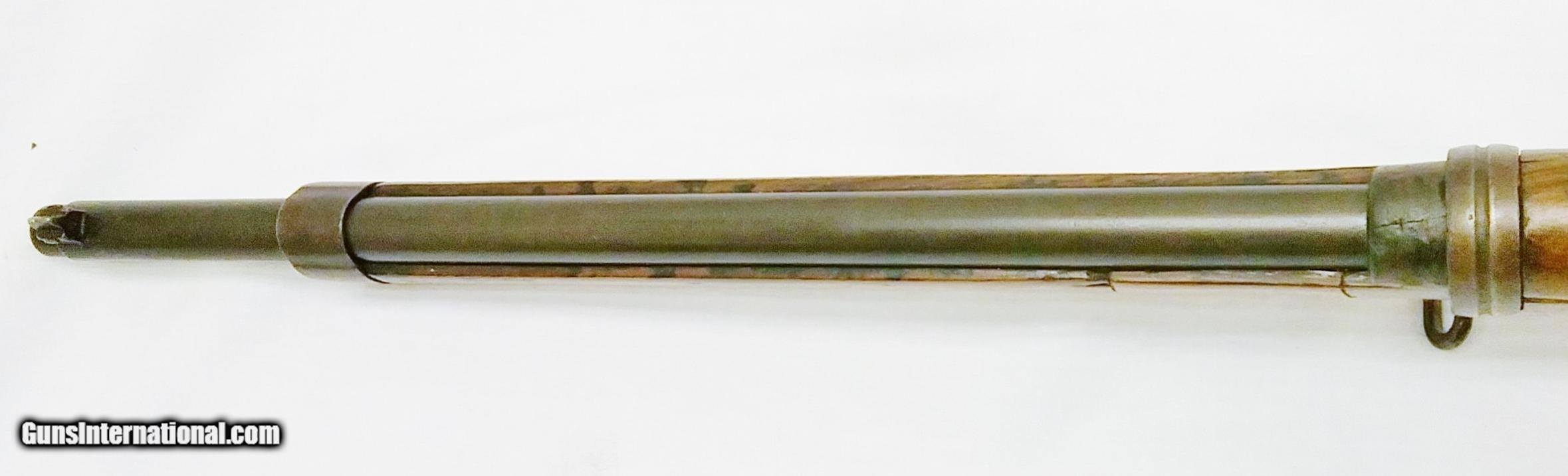 Description: This 7x57mm Spanish Mauser Model 1893 has a 29-1/4” blued tapered round barrel mounted with an adjustable rear sight and a drift-adjustable front sight. The top of the receiver is stamped with a crown and “Fabrica De Amas Oviedo” and is dated 1921. The rear left side of the receiver has a circle G stamp and the serial number. The bore is good. The Select Hardwood stock with handguard are in good condition with the exception of the removal of some wood near the rear of the receiver, and some scratches and handling marks. There is also a repaired section where a new piece of wood was spliced forward of the rear barrel band. The gun features 2 military sling swivels and a bayonet lug. The numbers on this gun are non-matching. Length of pull is 13”, overall length is 48-1/4”, weight is 8.4 lbs. Our stock number is A924. Will ship to any FFL, anywhere in the United States. Buyer pays freight and insurance. SOLD Manufacturer: Fabrica De Amas Oviedo Model: Mauser Model 1893 Caliber Info: 7x57mm Bore: Rifled Condition: Good Wood Condition: Good Bore Condition: Good Barrels: One Barrel Type: Tapered Round Action: Bolt Action Triggers: One Stock: Select Hardwood Butt Pad: Metal LOP: 13 Finish: Blued Weight: 8.4 lbs Sights: Adjustable Item Location: OR |