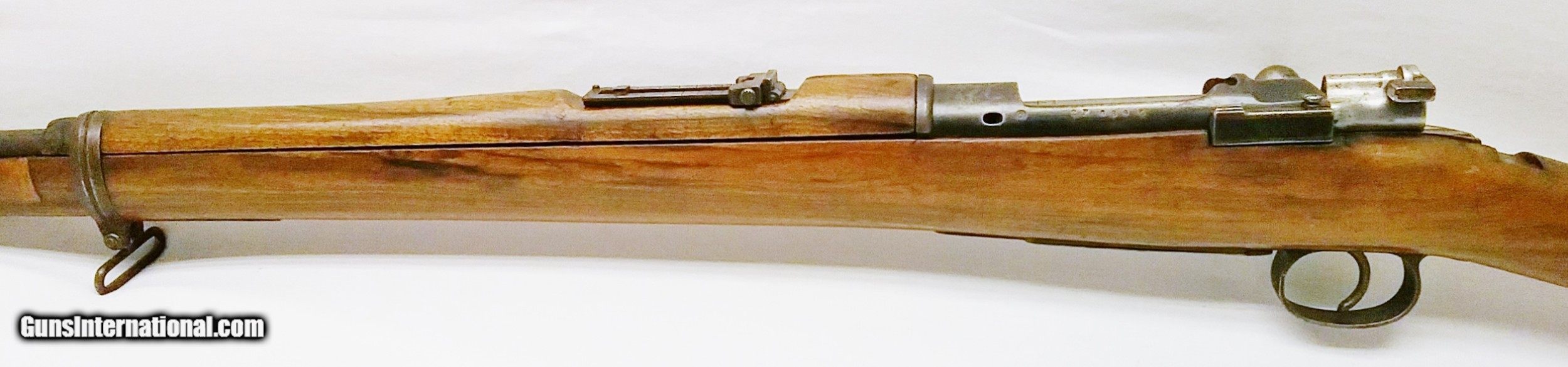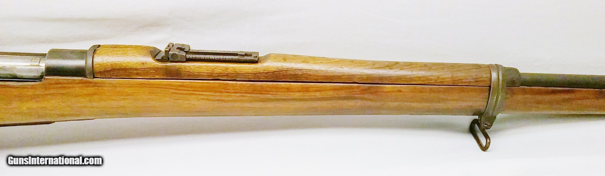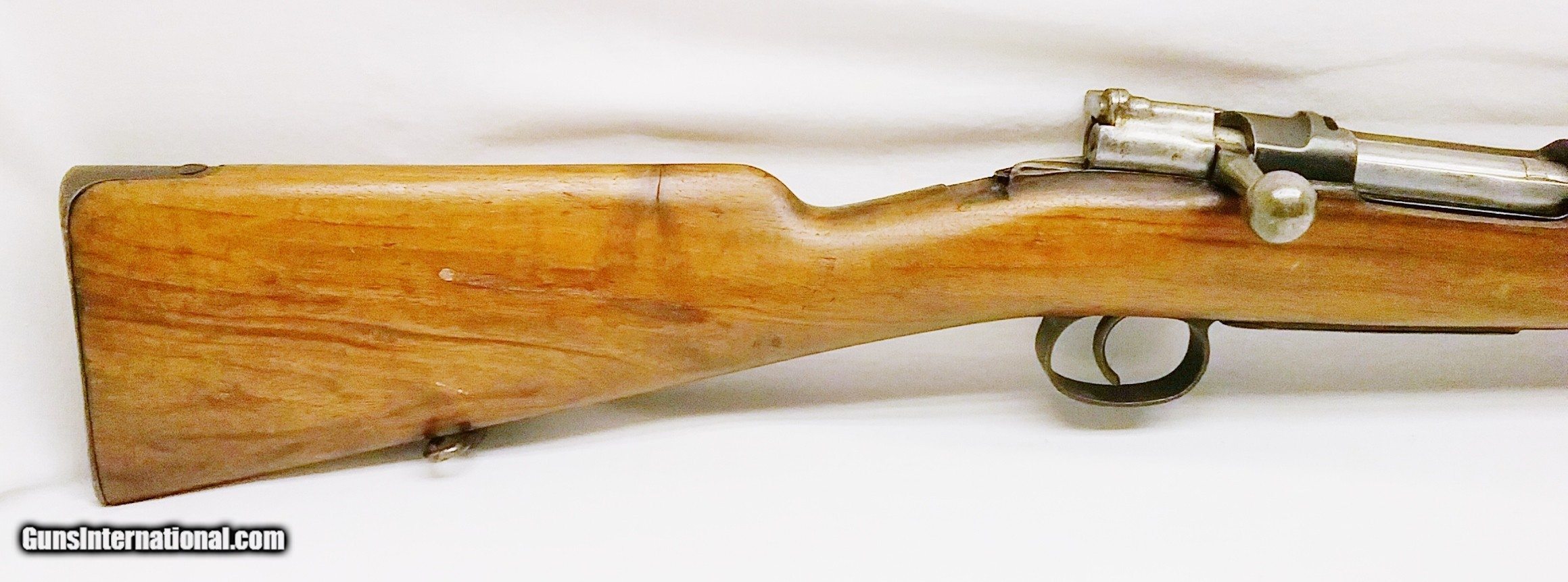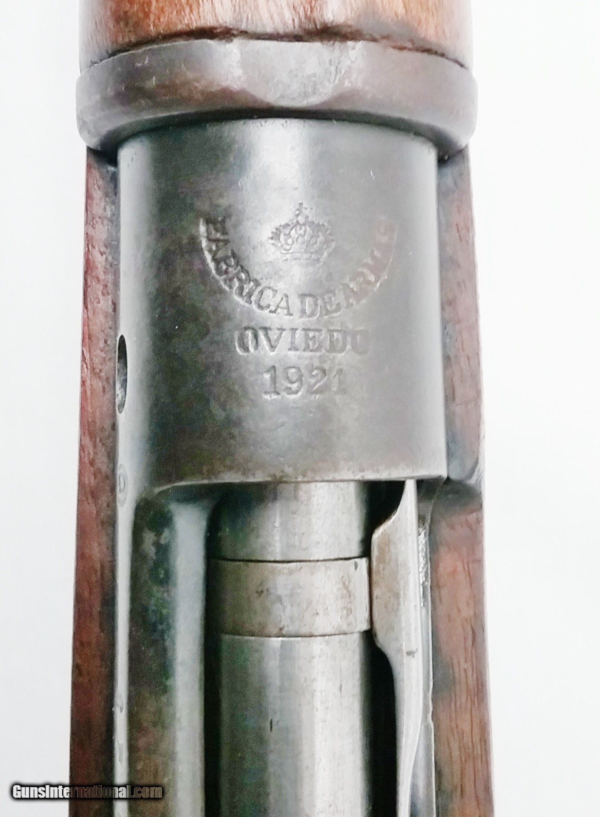 Description: This 7x57mm Spanish Mauser Model 1893 has a 29-1/4” blued tapered round barrel mounted with an adjustable rear sight and a drift-adjustable front sight. The top of the receiver is stamped with a crown and “Fabrica De Amas Oviedo” and is dated 1921. The rear left side of the receiver has a circle G stamp and the serial number. The bore is good. The Select Hardwood stock with handguard are in good condition with the exception of the removal of some wood near the rear of the receiver, and some scratches and handling marks. There is also a repaired section where a new piece of wood was spliced forward of the rear barrel band. The gun features 2 military sling swivels and a bayonet lug. The numbers on this gun are non-matching. Length of pull is 13”, overall length is 48-1/4”, weight is 8.4 lbs. Our stock number is A924. Will ship to any FFL, anywhere in the United States. Buyer pays freight and insurance. SOLD Manufacturer: Fabrica De Amas Oviedo Model: Mauser Model 1893 Caliber Info: 7x57mm Bore: Rifled Condition: Good Wood Condition: Good Bore Condition: Good Barrels: One Barrel Type: Tapered Round Action: Bolt Action Triggers: One Stock: Select Hardwood Butt Pad: Metal LOP: 13 Finish: Blued Weight: 8.4 lbs Sights: Adjustable Item Location: OR |
